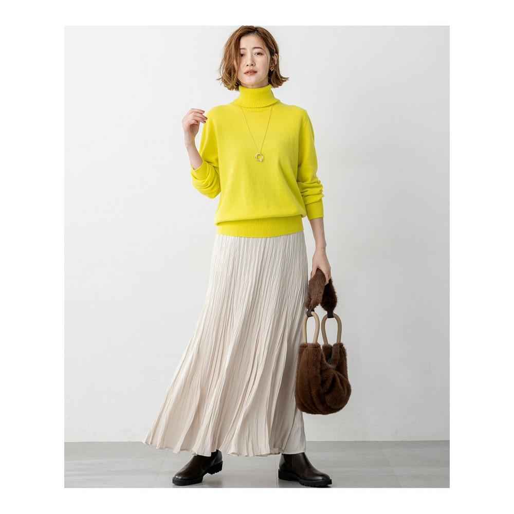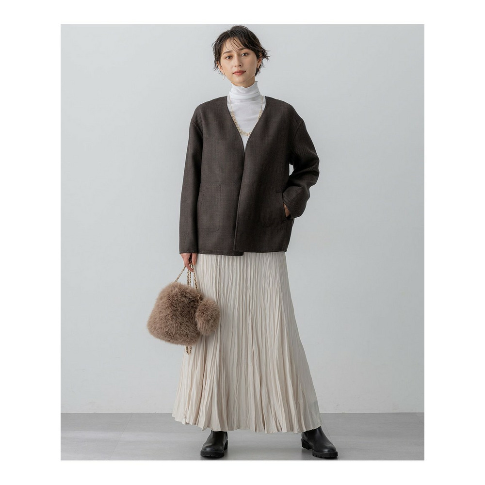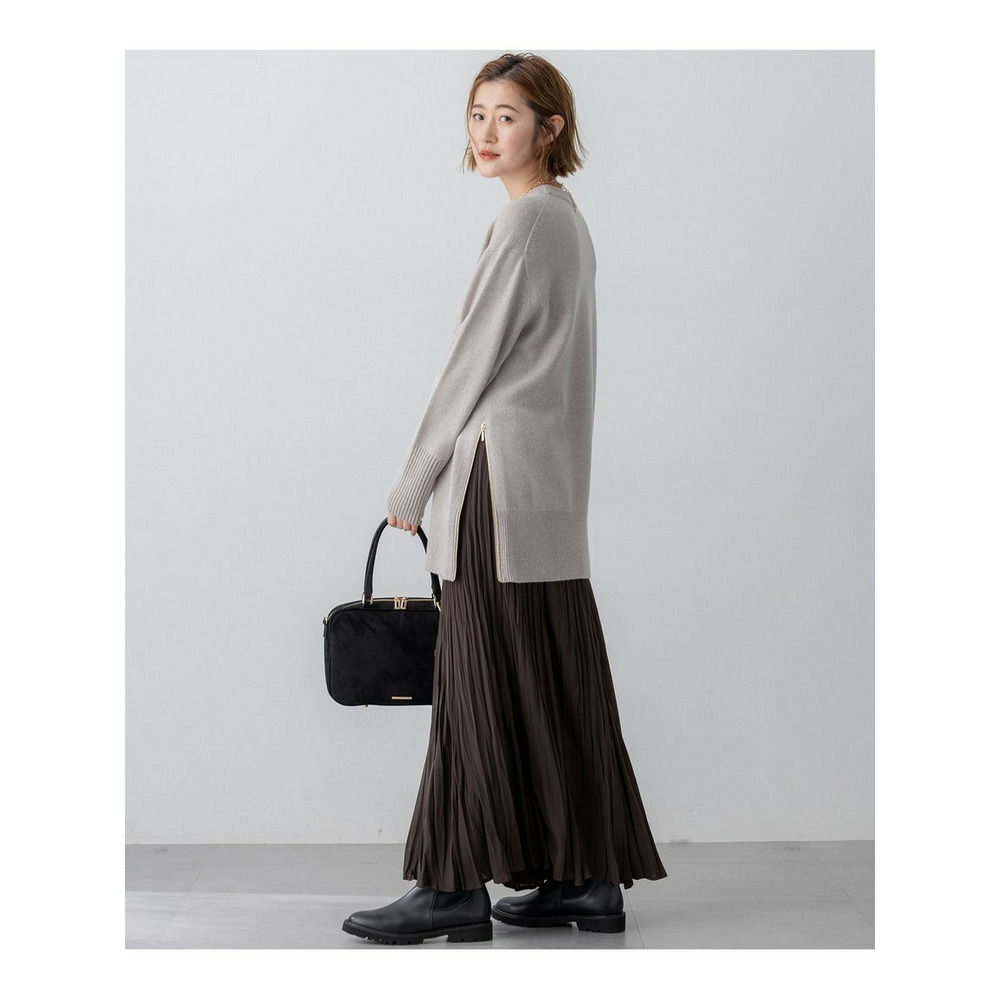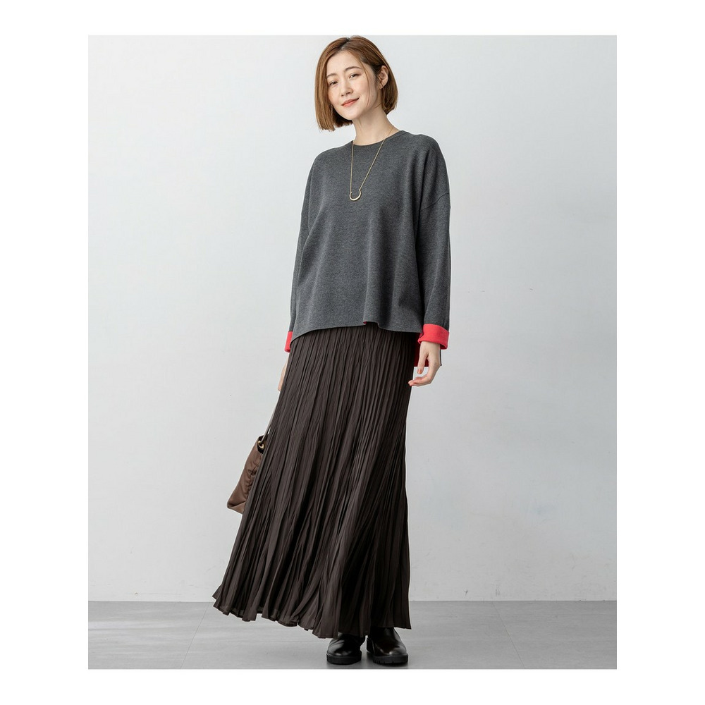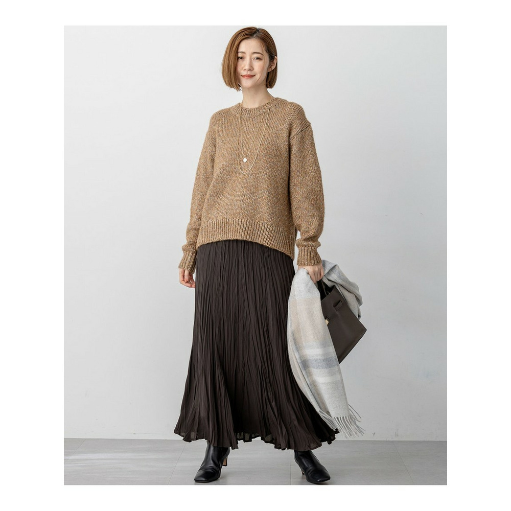ランダムに絞ったプリーツ加工をかけて陰影のある表情を出したロングスカート。均一なプリーツよりもカジュアルな雰囲気ですが、広がりすぎないナローシルエットで上品な印象に。シワになっても気にならないため、旅行の時にもおすすめです。キレイめからカジュアルまで合わせやすく、ゆるめのニットや、ジャケットでも決まる万能アイテム。カラーは、柔らかなベージュ(#033)と秋らしいダークブラウン(#035)の2色展開です。
