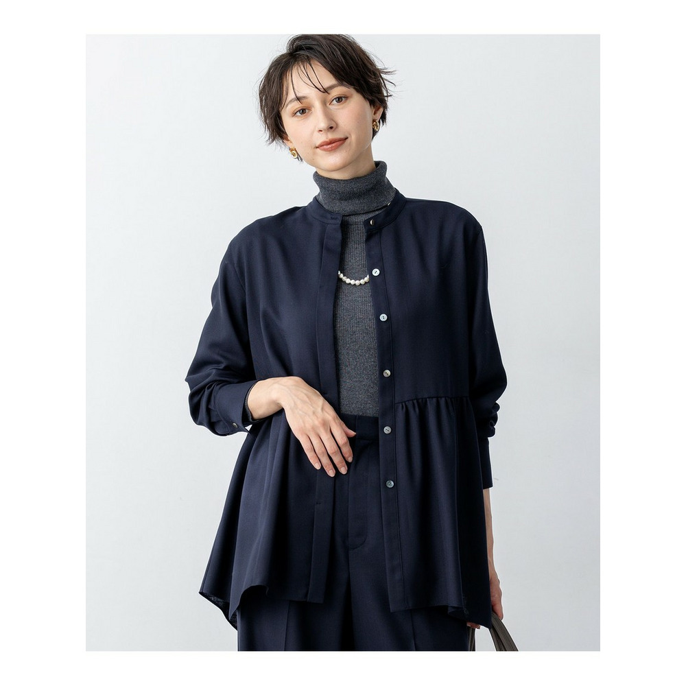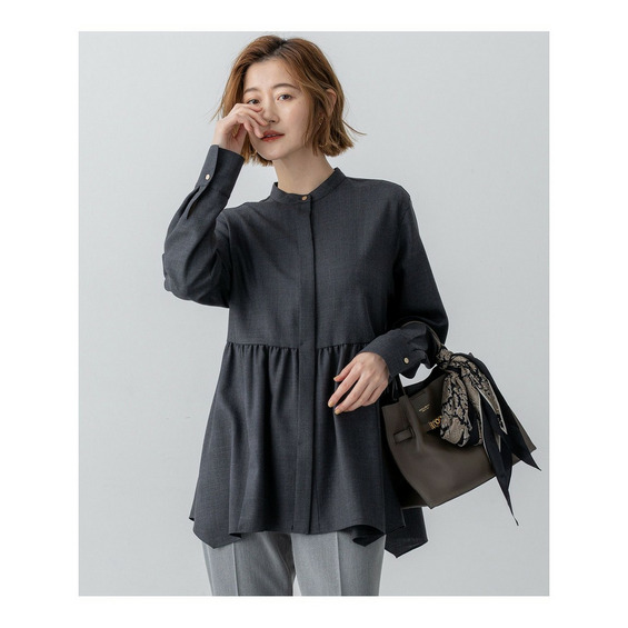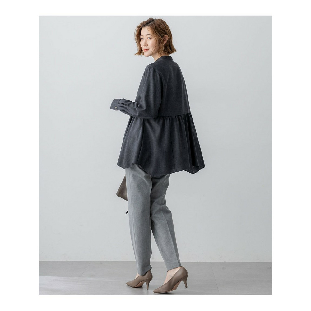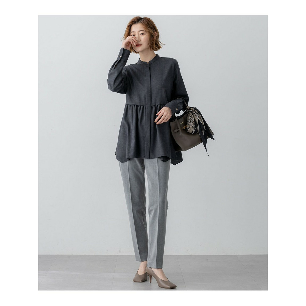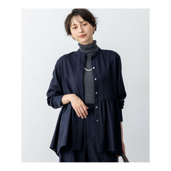 裾のイレギュラーヘムがポイントのデザインブラウスです。腰回りをカバーしてくれる長めのレングスなので、細身のパンツを合わせていただくとメリハリのあるスタイリングが叶います。また、同素材のワイドパンツやデニムのワイドパンツと合わせても今年らしいボリューム感のあるスタイリングをお楽しみいただけます。カラーは、こなれた印象のグレー(#004)と、品の良さを引き立てるネイビー(#075)の2色展開です。