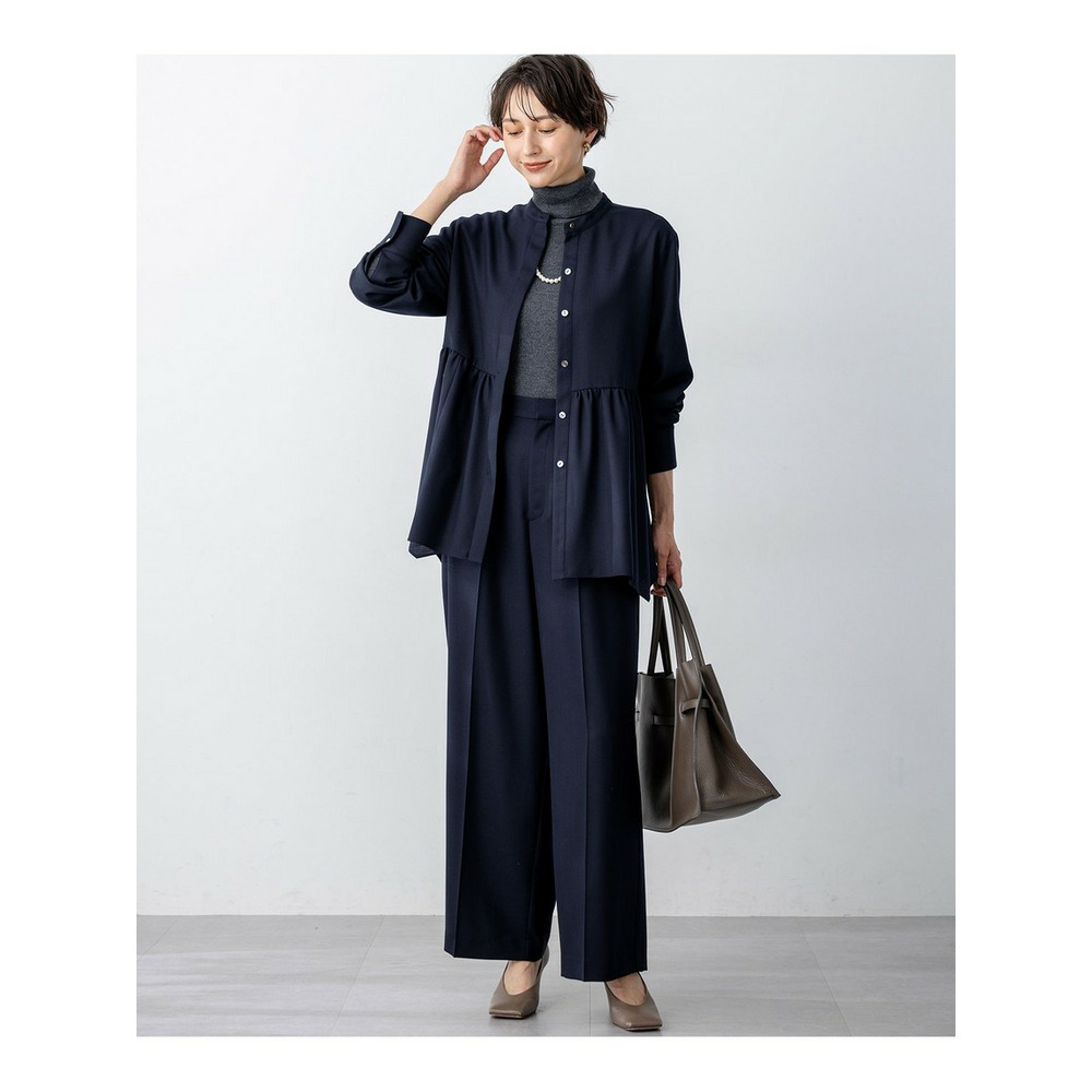 オーストラリア産メリノウールの細番手の糸を使用した23区オリジナル素材です。綾織りのビエラ組織を採用し、軽さと薄さを追求しつつも、生地の強度も損なわないように絶妙な設計にて織りあげています。細い番手の糸を使用することによって、ソフトで美しいドレープ性が特徴の生地になっています。またスパンタイプのアンチピリングポリエステル繊維を配合することにより、シワになりにくく、毛玉ができにくい機能性に加え、ウォッシャブルで、ソフトな風合いも併せ持っています。また、導電性カーボンを付着させた糸を混紡させることで、静電気が起こりにくく、ほこりや毛羽が付きづらくなるようにしています。