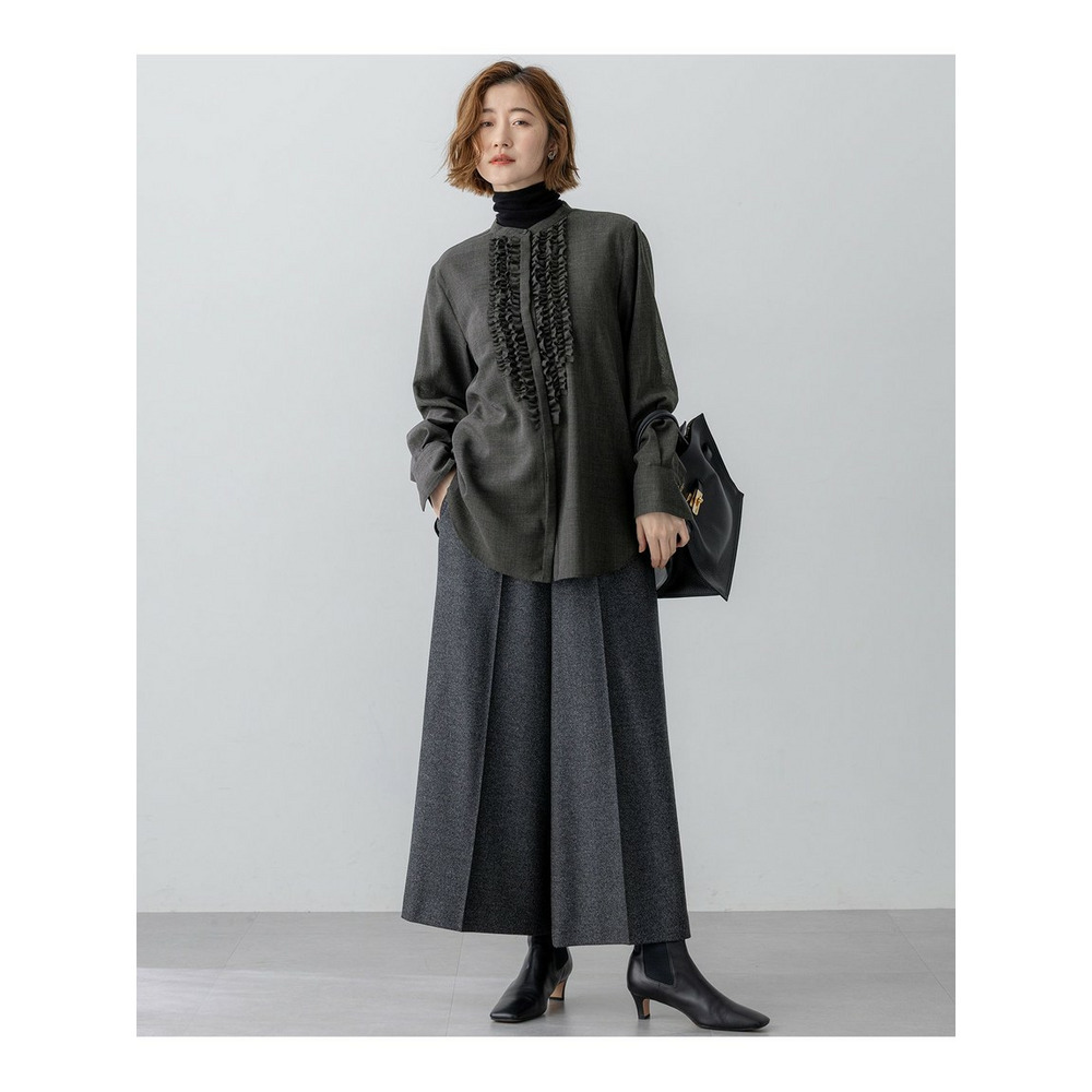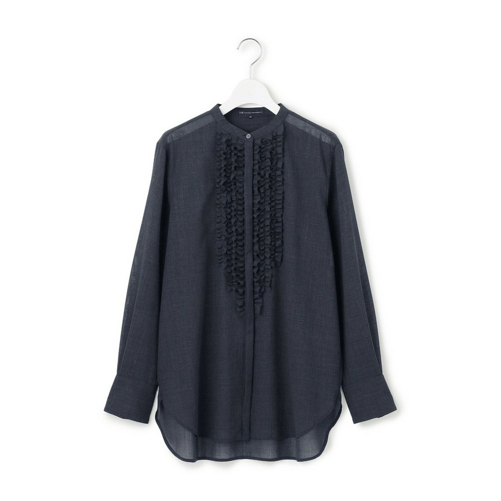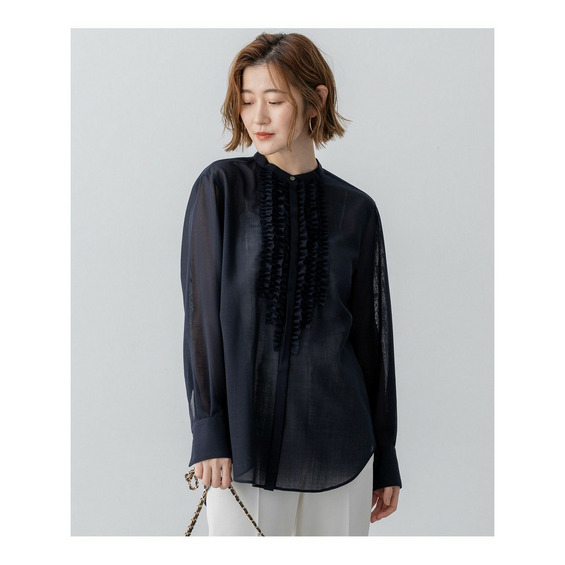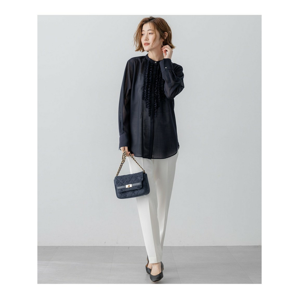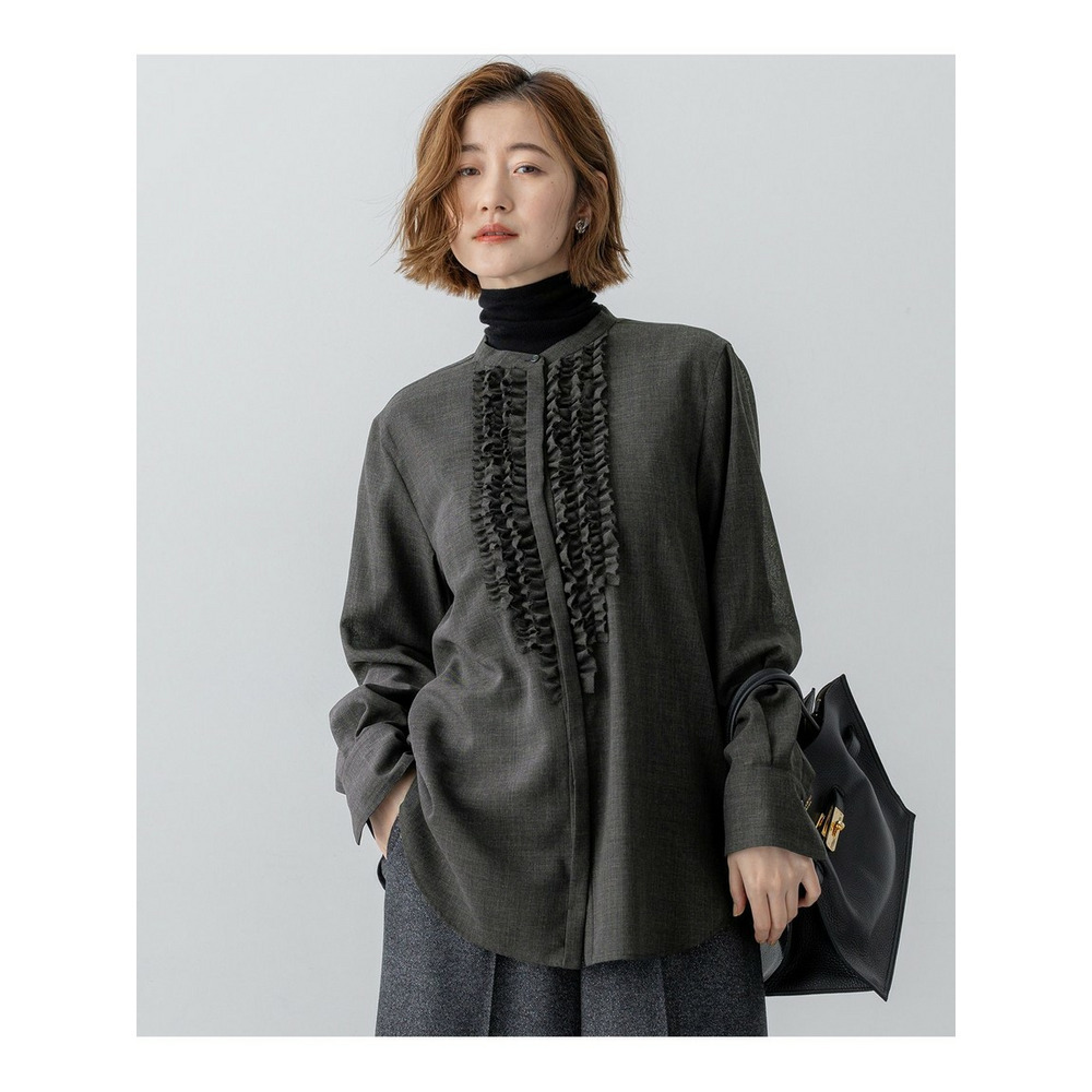 フリルディテールが華やかながら、こなれた印象でスタイリッシュな雰囲気の1着です。1枚着としてはもちろん、肌寒くなってきてからは、タートルネックをインナーにしたレイヤードスタイルや、カーディガンのインナーブラウスとして着まわしたりと、ロングシーズン着用いただける汎用性の高いアイテムです。ワイドパンツを合わせた今季らしいスタイルもおすすめです。カラーは、こなれた印象のグレー(#004)と、品の良さを引き立てるネイビー(#075)の2色展開です。