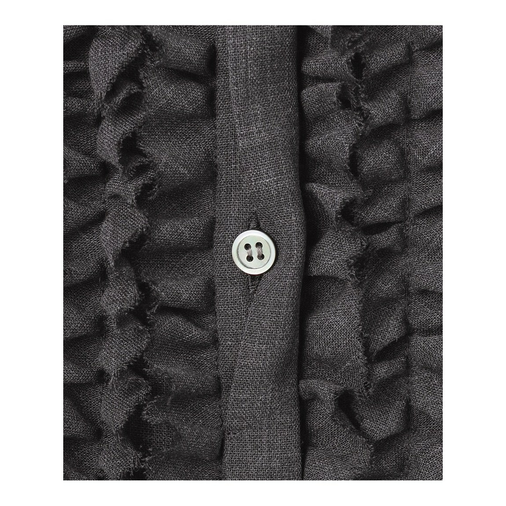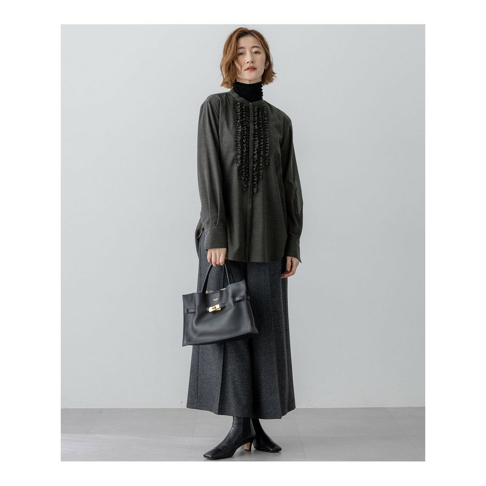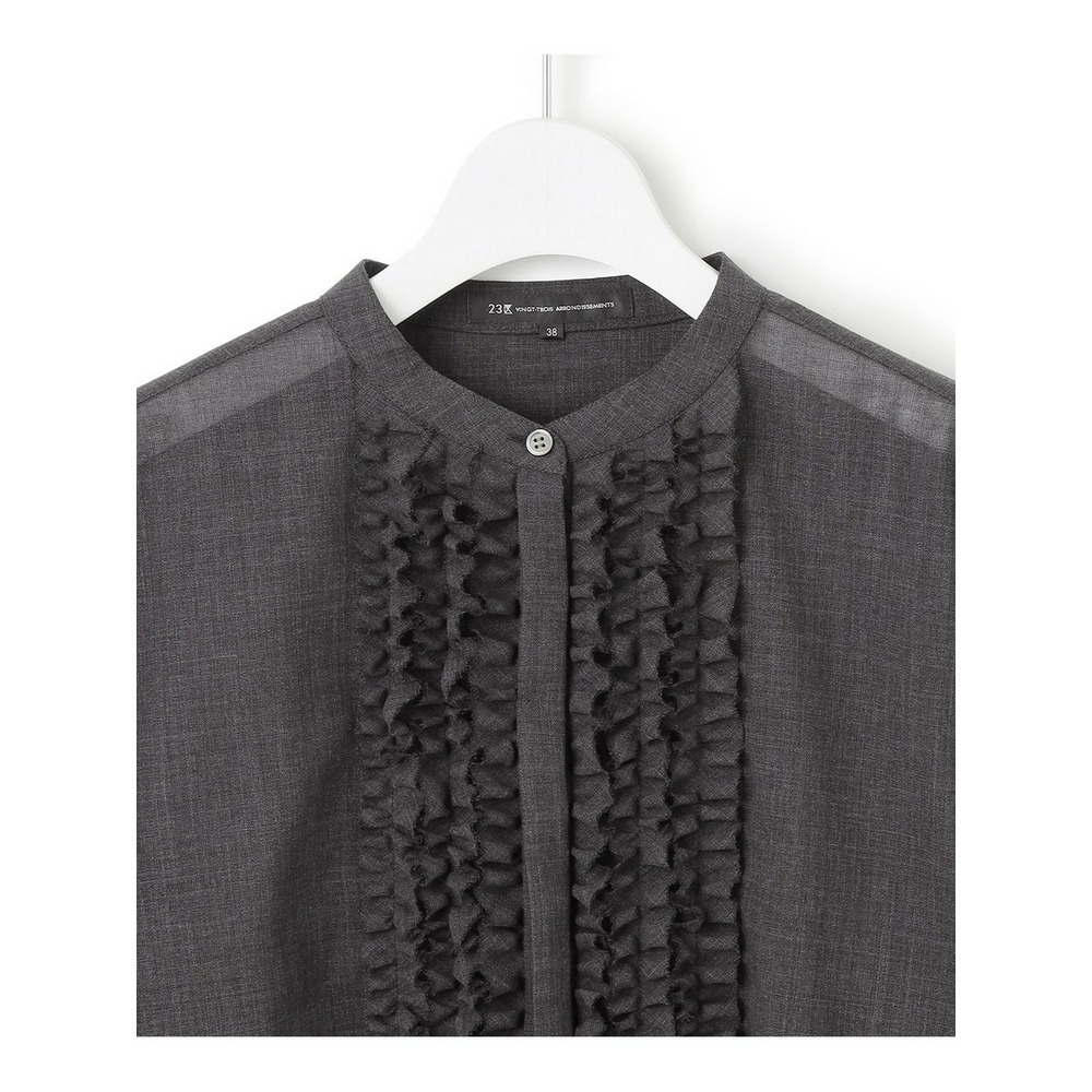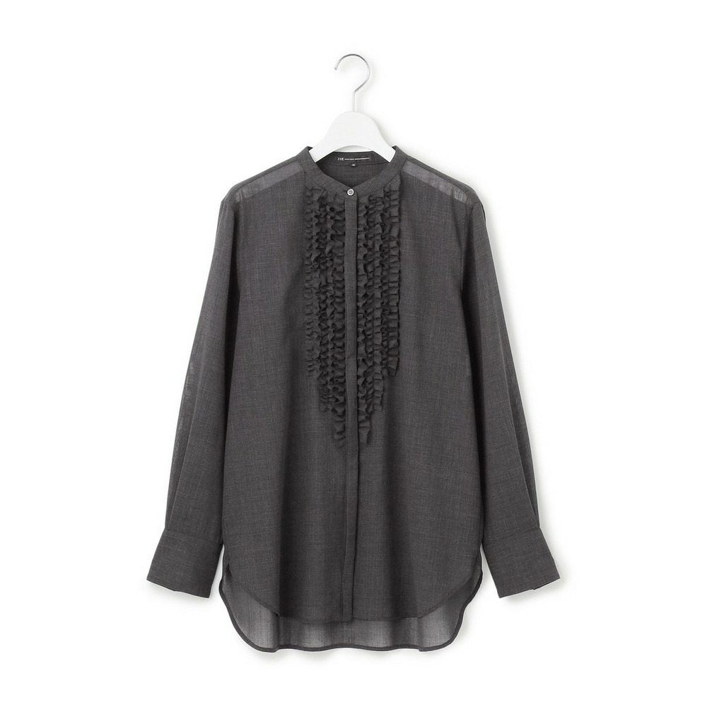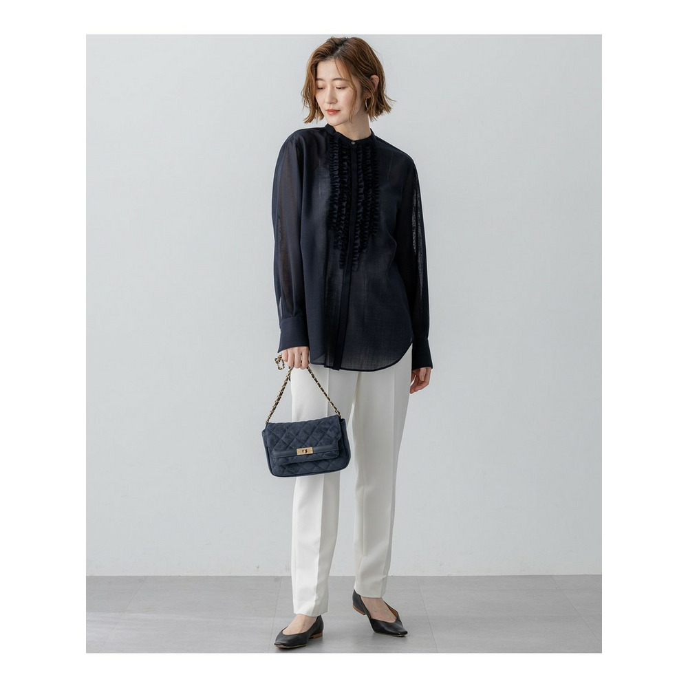 フリルディテールが華やかながら、こなれた印象でスタイリッシュな雰囲気の1着です。1枚着としてはもちろん、肌寒くなってきてからは、タートルネックをインナーにしたレイヤードスタイルや、カーディガンのインナーブラウスとして着まわしたりと、ロングシーズン着用いただける汎用性の高いアイテムです。ワイドパンツを合わせた今季らしいスタイルもおすすめです。カラーは、こなれた印象のグレー(#004)と、品の良さを引き立てるネイビー(#075)の2色展開です。