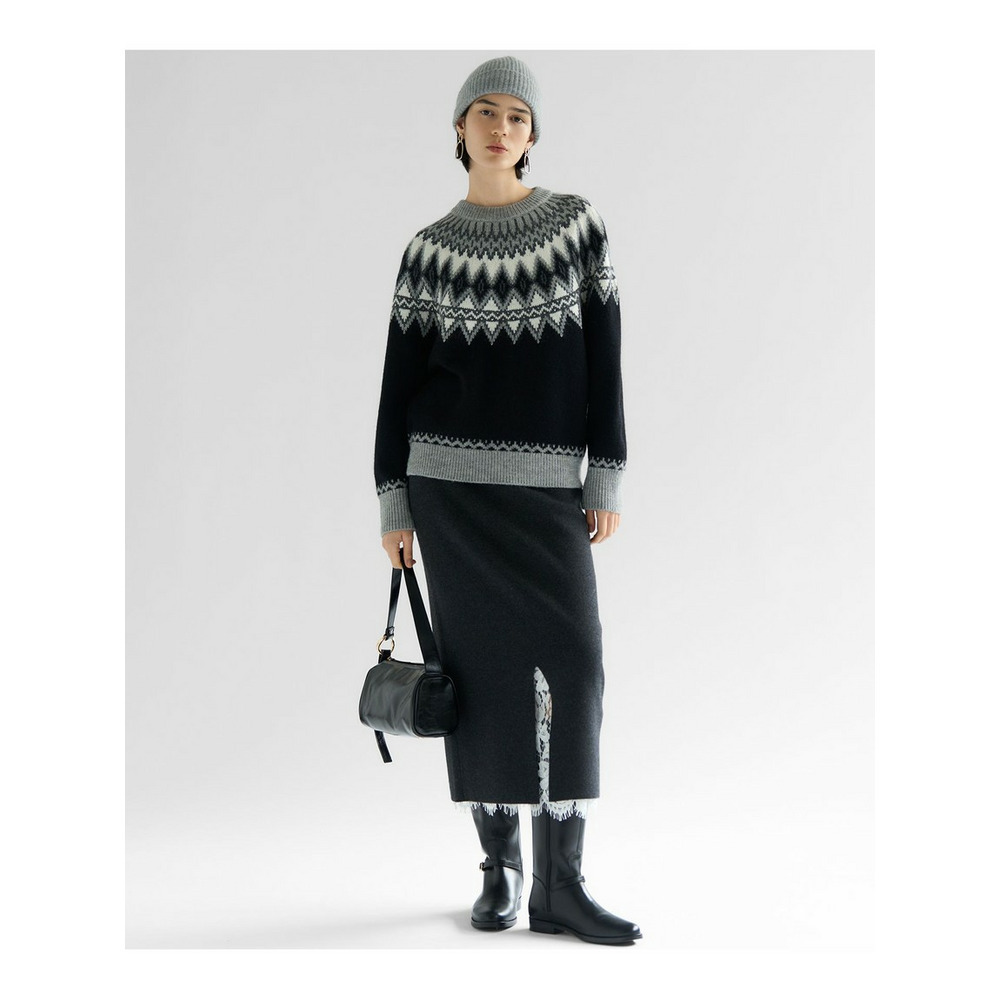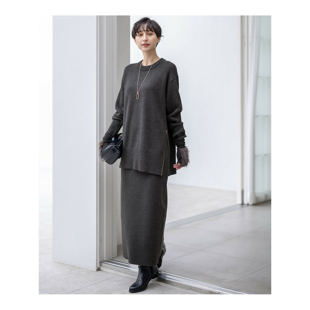 シンプルなニットのタイトスカート。前後着用が可能なため、ウエスト部分や脇のラインがどの角度から見ても、キレイに見えるようなデザインにしています。デザインのポイントとしてスリットを入れており、スリットをどの位置にするかで印象が変わります。同素材のニットやカーディガンとセットアップでの着用もおすすめです。カラーは、カジュアルスタイルに映えるライトグレー(#003)、印象引き締まるグレー(#004)、やさしい雰囲気のベージュ(#033)の3色展開です。
