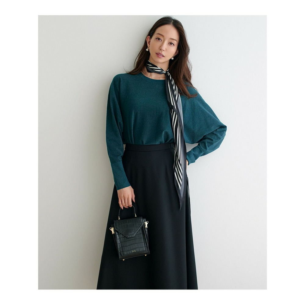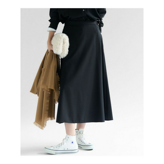 上質素材と、控えめなフレアシシルエットのスカートで品のある佇まいに