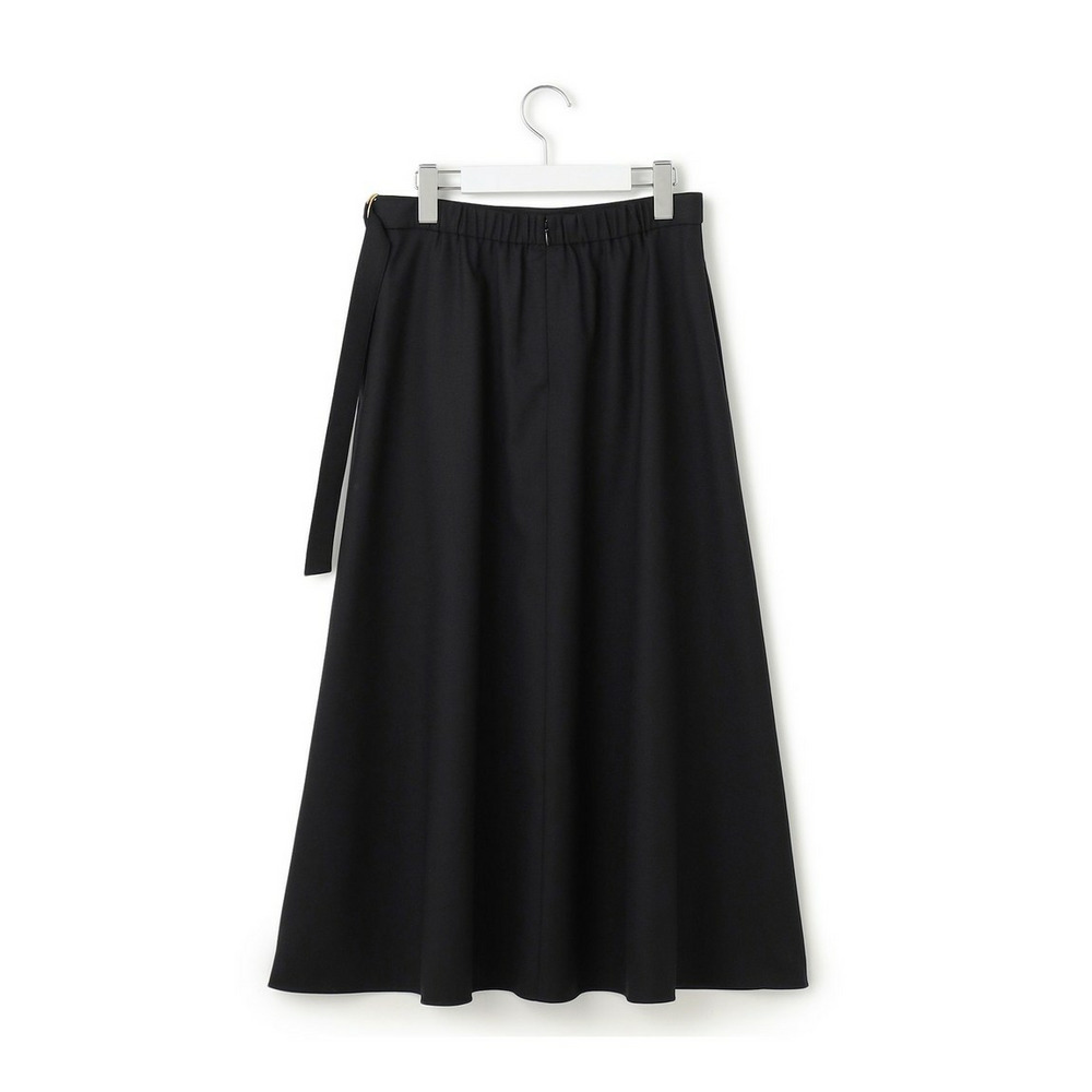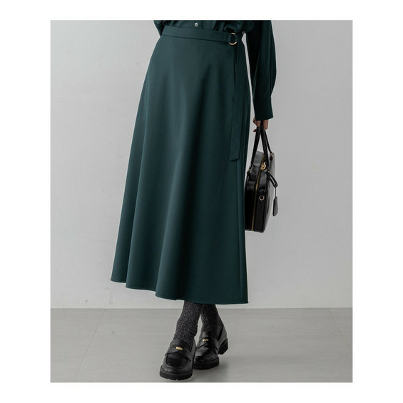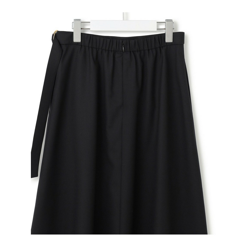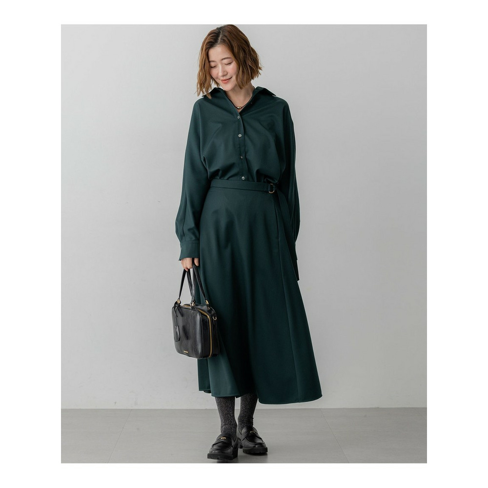 ウエストにベルトのようなデザインを施した、デザインスカート。スッキリと見せてくれる微フレアシルエットで、オフィスなどきちんと見えたいシーンにもおすすめのアイテムです。ウエストの後ろはゴム仕様で楽な穿き心地に。同素材のシャツと合わせてセットアップ風に着用すれば、より洗練された印象を与えてくれます。ざっくりとしたニットや、ブラウスなど合わせるアイテム次第で表情を変えるため、幅広いシーンで活躍する1枚。カラーはシックで上品な印象を与えるブラック(#005)、深みのある落ち着いたグリーン(#064)の2色展開です。