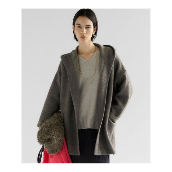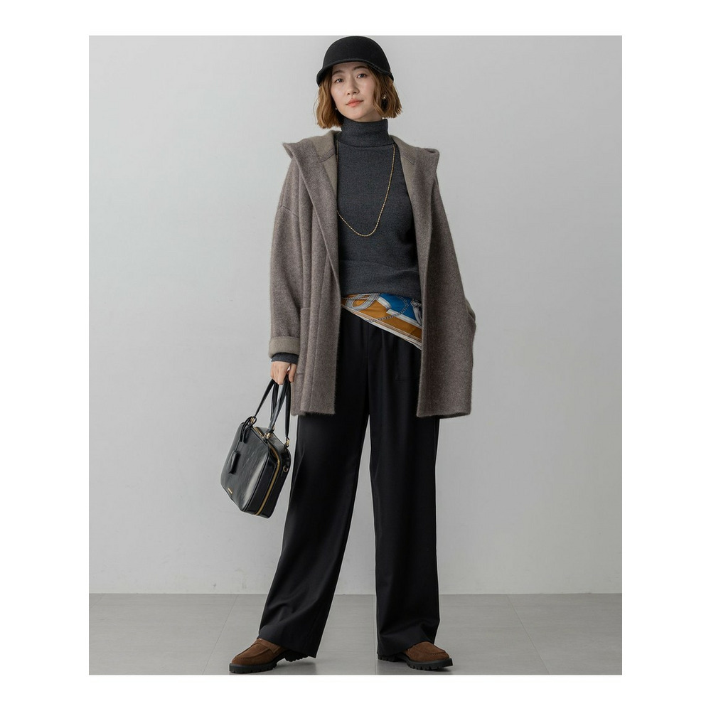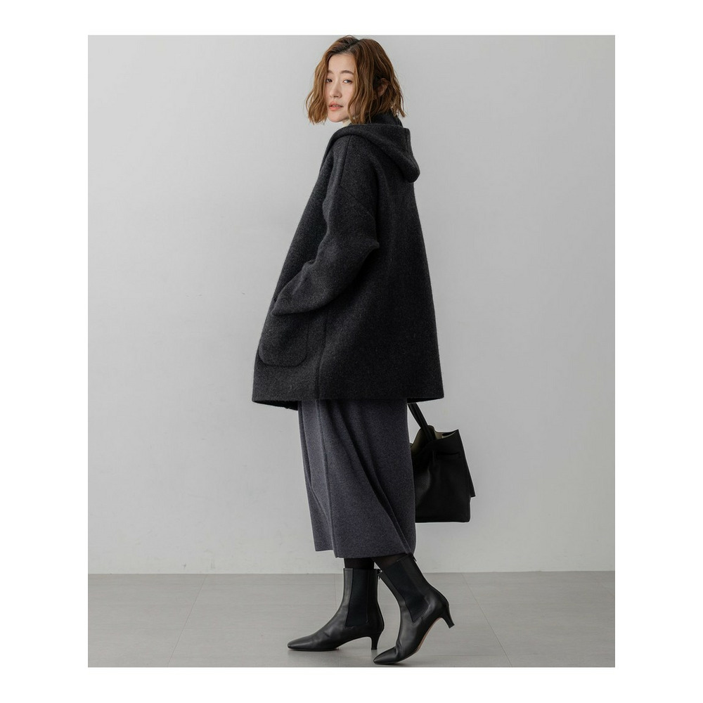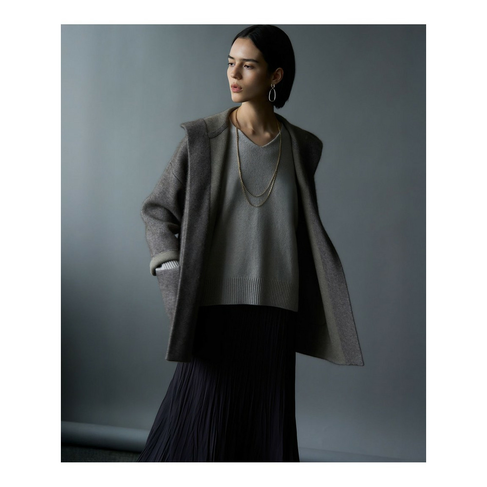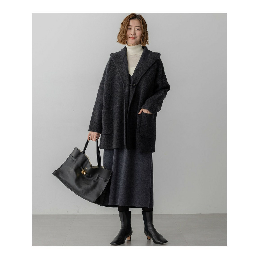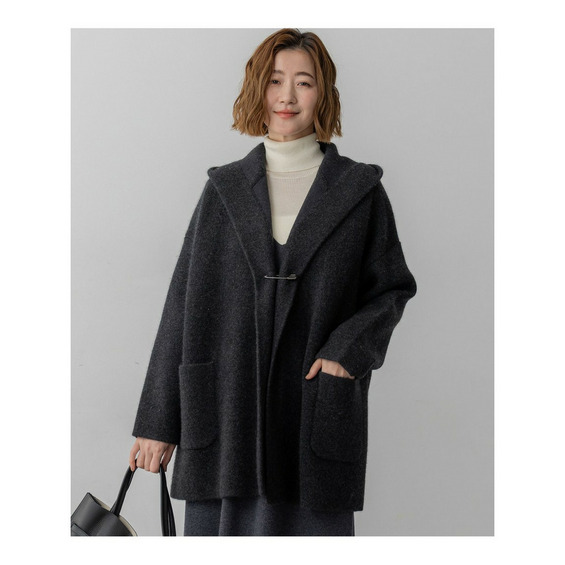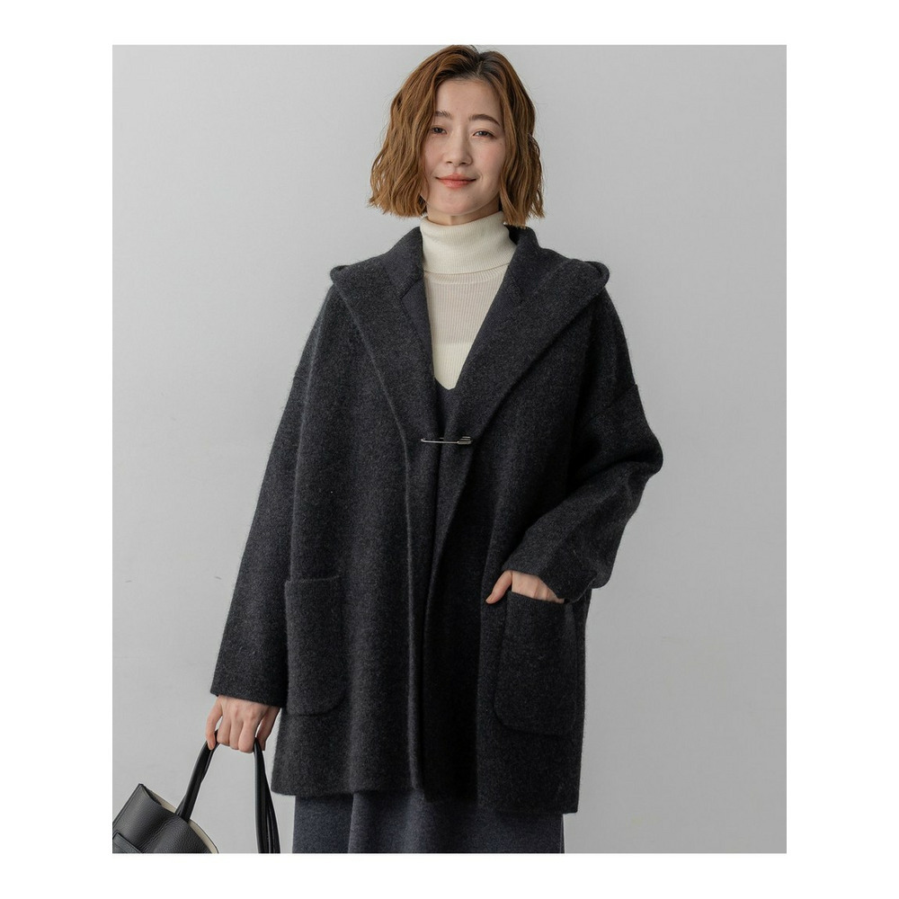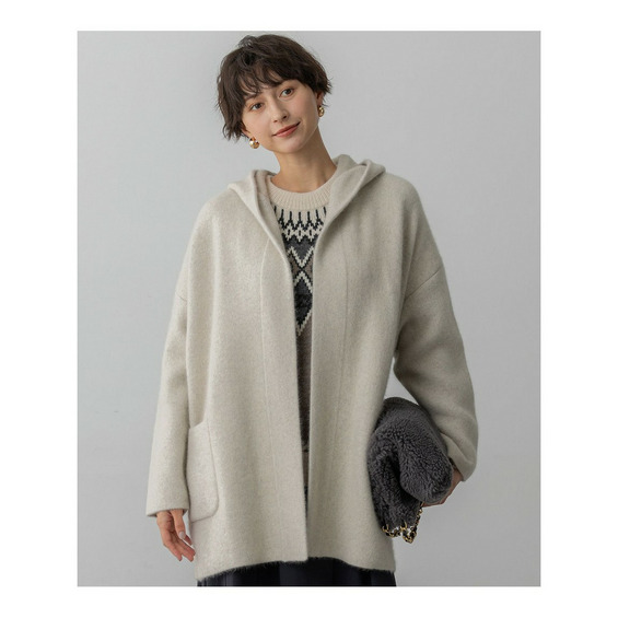 秋口の肌寒い季節に、コートに代わるアウターとして活躍するフーディーニットカーディガンです。ゆったりとしたシルエットで、羽織るだけでこなれた印象を演出します。フロントは重なりが充分にあるデザインで、そのままラフに羽織るのはもちろん、お手持ちのキルトピンなどで前を留めていただくと、より洗練されたスタイリングをお楽しみいただけます。シンプルなボトムスに合わせるだけで、上品なカジュアルスタイルが完成し、幅広いシーンで活躍する一枚です。 カラーは、上品で柔らかな印象のアイボリー(#002)、洗練された都会的な雰囲気を醸し出すグレー(#004)、温かみがあり落ち着いた印象のブラウン(#030)の3色展開です。