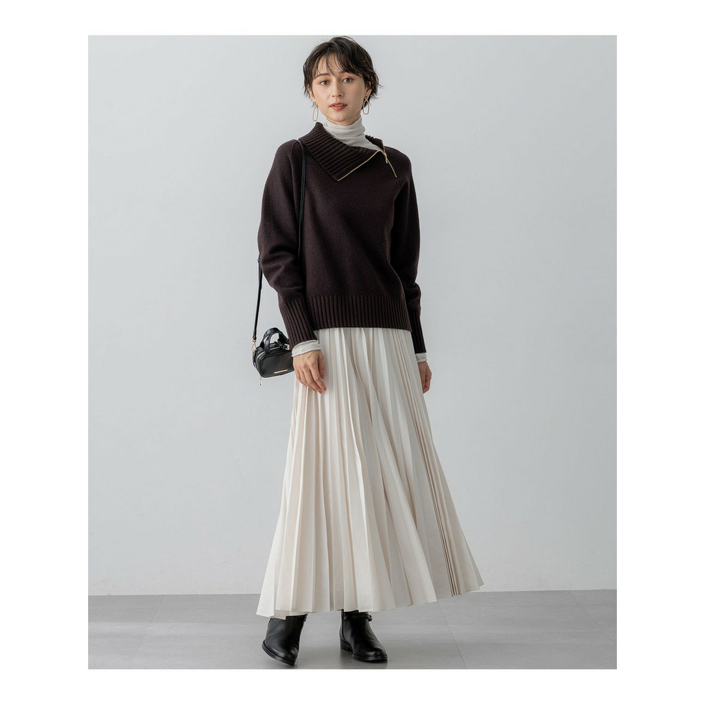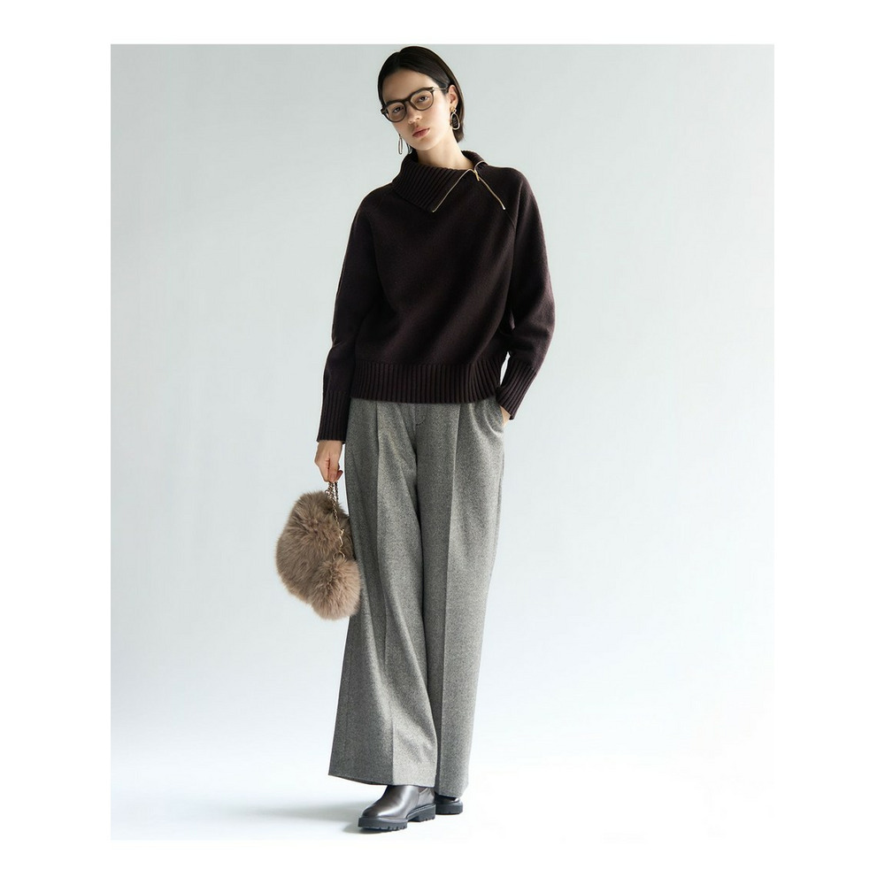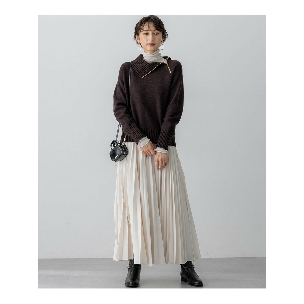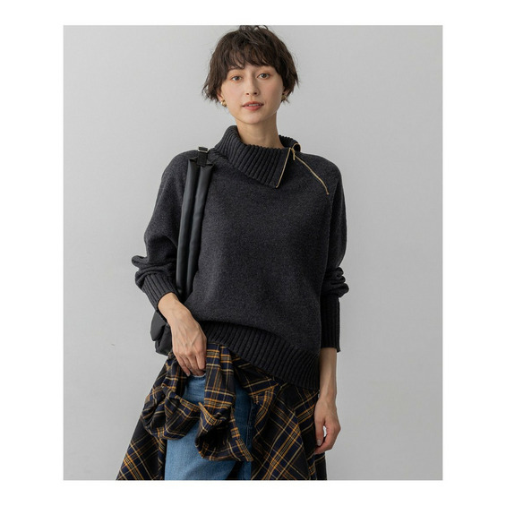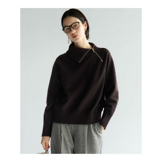 ジップデザインが目を引くタートルニット。アームホールからネックラインにかけて配されたジップは、デザインのアクセントであると同時に、着こなしに変化をもたらします。ファスナーを少し開けてインナーを覗かせたり、抜け感を演出したりと、様々な表情をお楽しみいただけます。襟元、袖口、裾にはふっくらとした厚みのあるバルキーリブを使用し、全体のシルエットにメリハリと上質感をプラスしています。シンプルなパンツやスカートと合わせるだけで、こなれたスタイリングが完成します。オフィスシーンではきれいめパンツと、休日はデニムやワイドパンツやスカートと合わせて、幅広いシーンで活躍します。カラーは、上品で合わせやすい定番のグレー(#004)、やわらかく女性らしい印象を与えるベージュ(#033)、深みがありシックで落ち着いたダークブラウン(#035)、知的で洗練された印象を与える万能なネイビー(#075)の4色展開です。