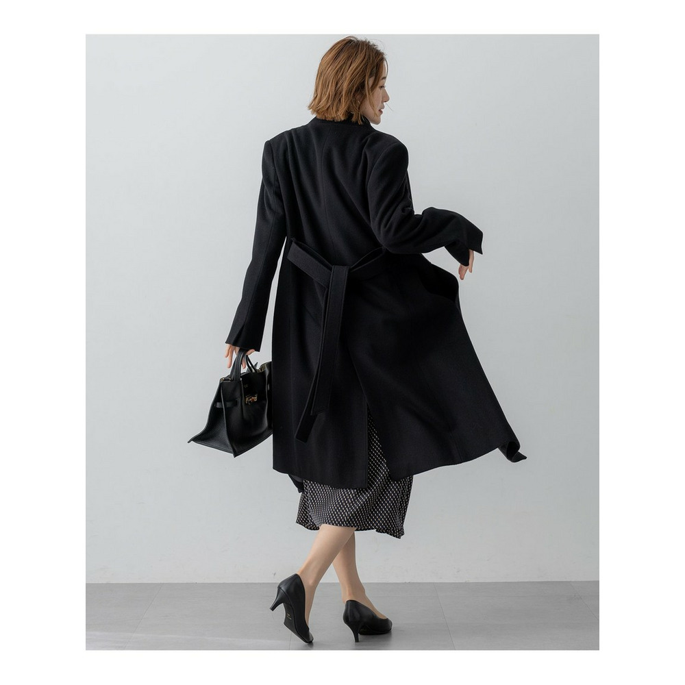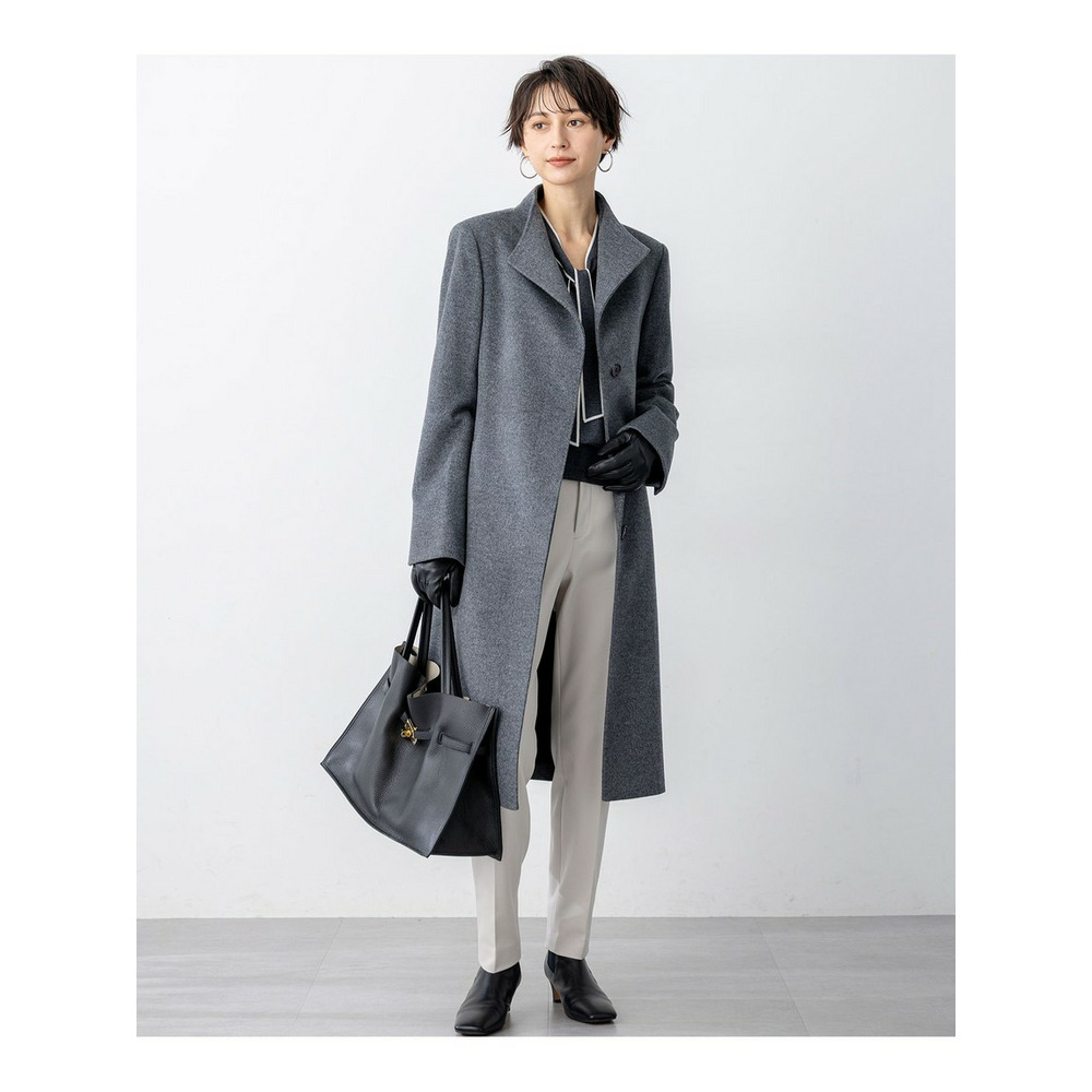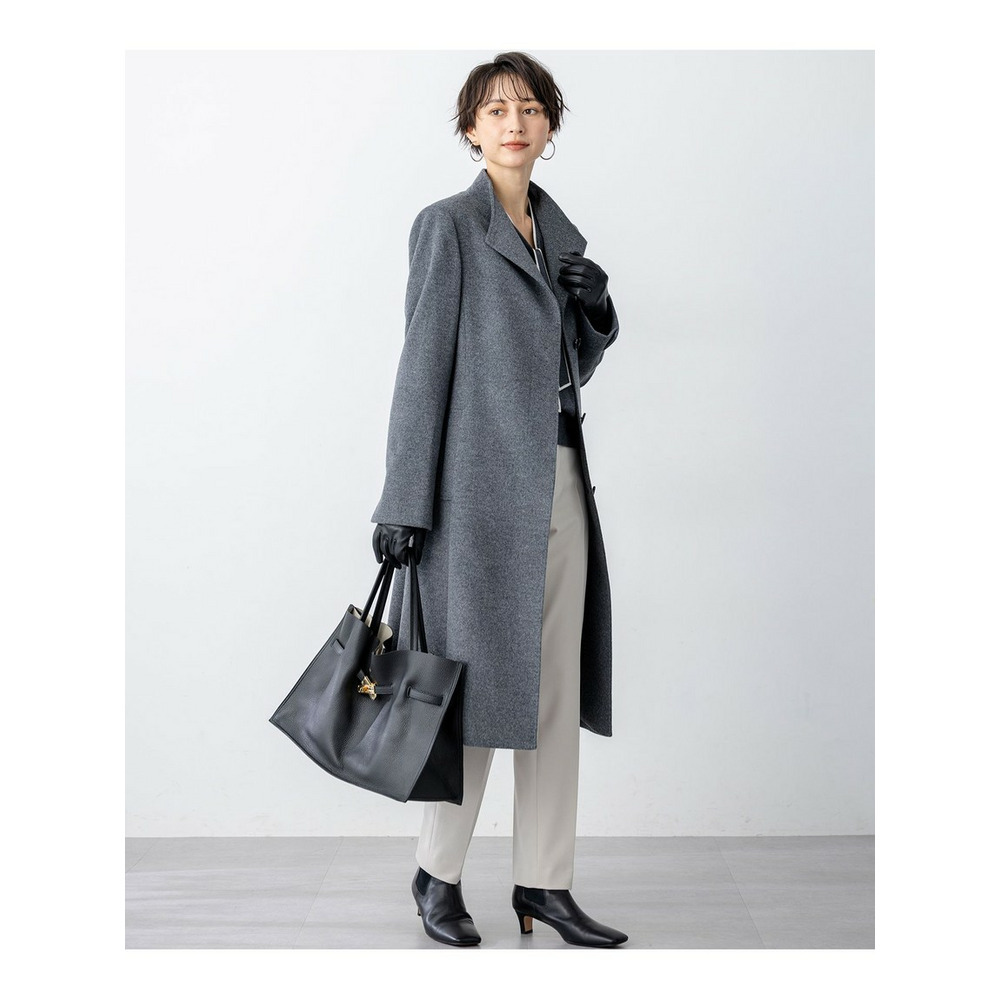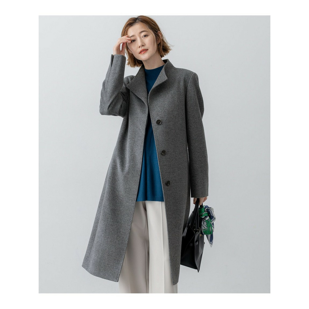 首周りをすっきりと仕上げたスタンドカラーコート。セットインスリーブと4面で立体的に構築した美しいシルエットで、きちんと感のある上品できれいめなコートに仕上げています。スタンドカラーは釦を開けても閉めても決まる2WAYデザインです。ウエストには共布のサッシュベルトをつけて、華やかさをプラスしました。スカートやパンツはもちろんワンピースとも相性抜群な丈感で、秋冬のきれいめスタイリングが叶うアウターです。日常使いから通勤、ちょっとしたおでかけの時まで、あらゆるシーンで着用いただけます。カラーは、都会的な印象のグレー(#004)と、スタイリッシュなブラック(#005)の2色展開です。