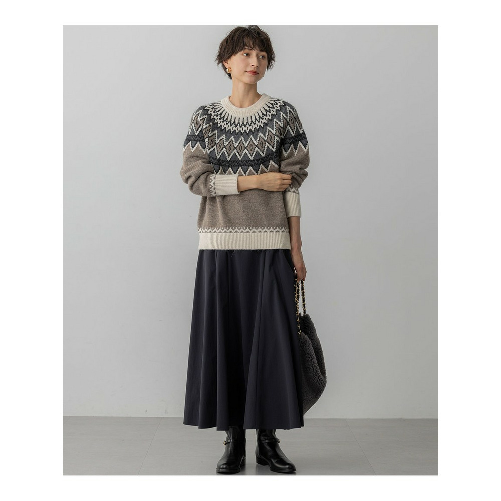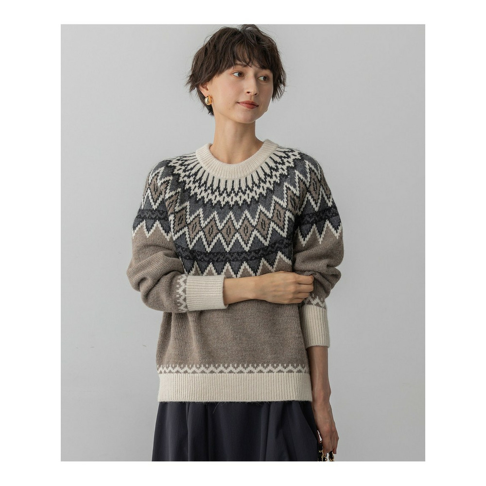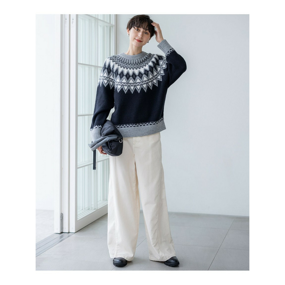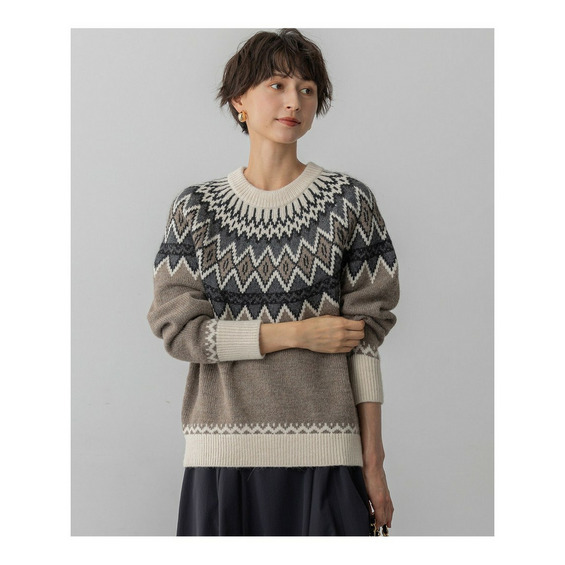 上質なインポート糸を贅沢に使い、胸元に大胆なジャカード柄を配したクルーネックニットプルオーバーです。一枚で着映えが叶う主役級のデザインで、シンプルなボトムスと合わせるだけで洗練されたスタイリングが完成します。ゆったりとしたシルエットで、リラックス感がありながらも上品さを保ちます。 カラーは、温かみがあり、どんな色とも合わせやすい上品なベージュベース(#533)と、抜け感のあるライトグレーベース(#503)の2色展開です。