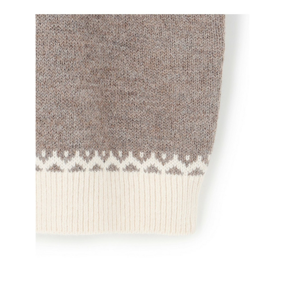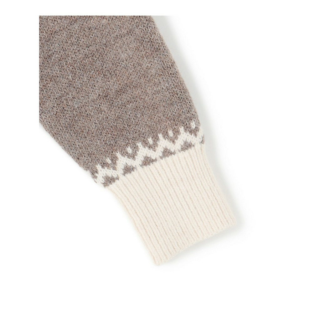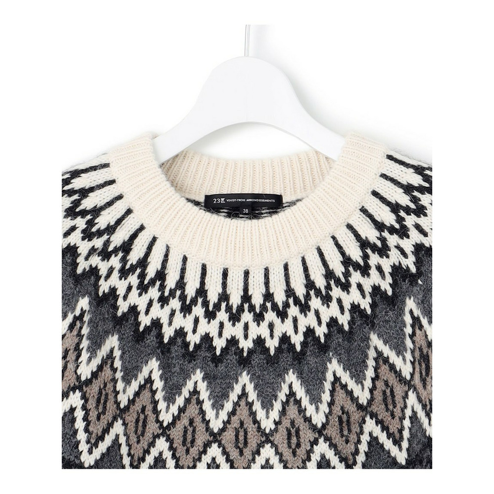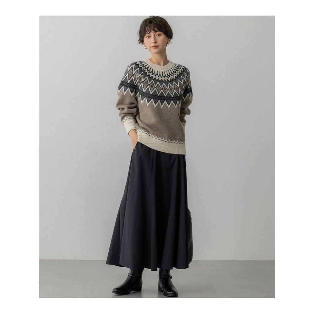 上質なインポート糸を贅沢に使い、胸元に大胆なジャカード柄を配したクルーネックニットプルオーバーです。一枚で着映えが叶う主役級のデザインで、シンプルなボトムスと合わせるだけで洗練されたスタイリングが完成します。ゆったりとしたシルエットで、リラックス感がありながらも上品さを保ちます。 カラーは、温かみがあり、どんな色とも合わせやすい上品なベージュベース(#533)と、抜け感のあるライトグレーベース(#503)の2色展開です。