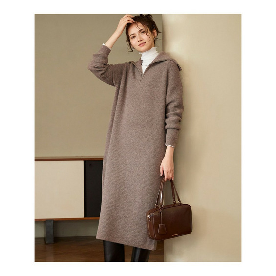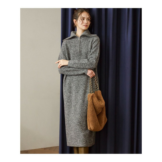 折り返した大きめの襟が肩先に優雅に乗る、片畦編みのニットワンピースです。顔周りをすっきりと見せる効果も期待でき、一枚で着るだけで上品な華やかさを演出します。フロントにはアクセントとなるファスナー開きを施し、デザイン性を高めるとともに、着脱のしやすさも兼ね備えました。すっきりとしたボディーラインと長めのレングスが、エレガントな印象を与えます。一枚ではもちろん、冬が深まる頃にはタートルネックをインナーに合わせるレイヤードスタイルもおすすめです。カラーは、優しい印象のブラウン(#030)、ニュアンスのある着こなしを叶えるグレーミックス(#304)の2色展開です。