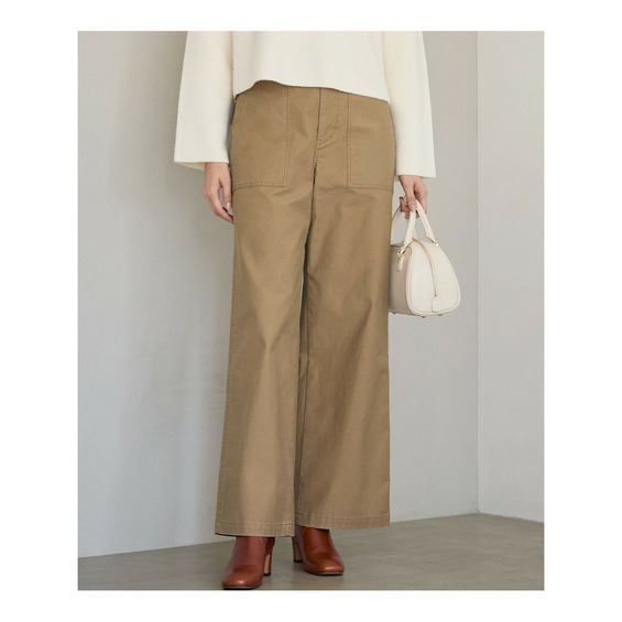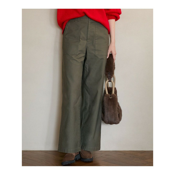 冬のカジュアルスタイルに洗練されたアクセントを添えるベイカーパンツ。ワークウェアのディテールを取り入れながらも、脚のラインを美しく見せるワイドストレートシルエットにこだわり、大人の女性にふさわしい一本に仕上げました。ヴィンテージのようなこなれた質感と柔らかな風合いで、穿くだけでサマになります。ヘアリーなニットやローゲージニットと合わせれば、素材のコントラストが生まれ、より一層こなれた印象に。カジュアルながらも上品さを忘れない着こなしが叶います。コットン素材なので、季節を問わずオールシーズンお使いいただける、デイリーユースにぴったりのアイテムです。カラーは、どんなトップスにも合わせやすい柔らかなベージュ系(#033)、洗練された印象のグレー系(#004)、ミリタリーテイストを上品に昇華させたこなれ感のあるカーキ系(#054)の3色展開です。