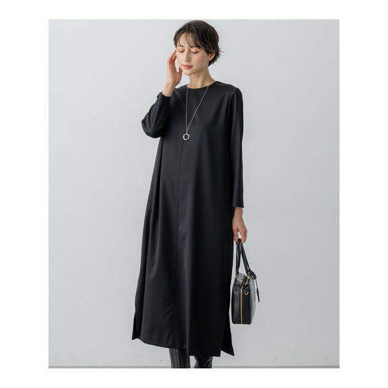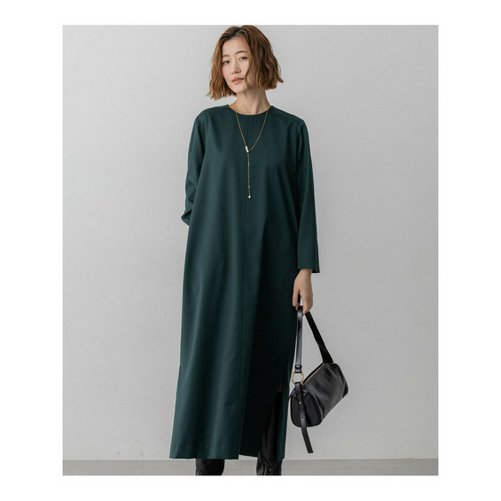 クルーネックのシンプルな長袖ワンピース。ほんのりゆとりのあるIラインシルエットで、体のラインを拾いすぎず着心地よく着ていただけます。さりげないステッチや、背面ファスナーにはグログランテープの引き手を付けてアクセントにしています。カラーはシックで上品な印象を与えるブラック(#005)、深みのある落ち着いたグリーン(#064)の2色展開です。