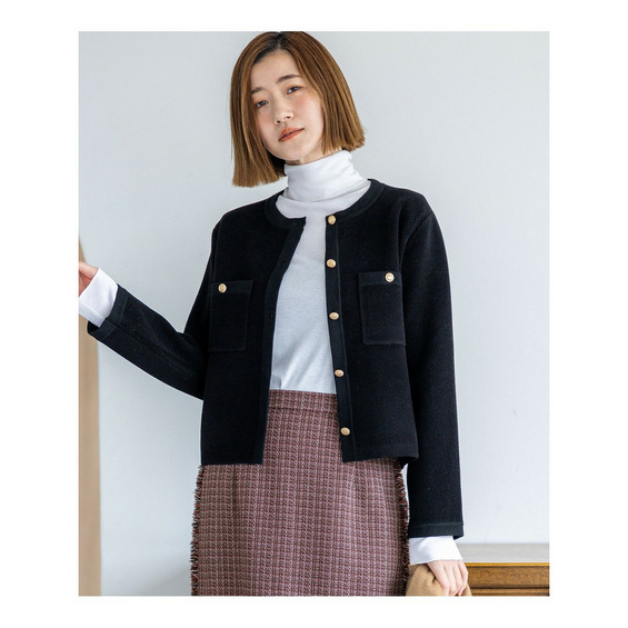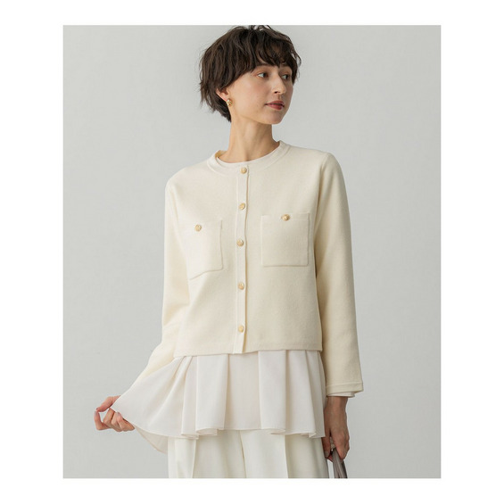 胸元に配されたポケットと、きらめくゴールドボタンがアクセントになったクルーネックカーディガン。シンプルな中に華やかさを添えるデザインは、羽織るだけでコーディネートを格上げします。襟元・前立て・袖口には、なめらかな梳毛(そもう)素材を使用しており、ベロアの豊かな表情とのコントラストが、洗練された大人の雰囲気を演出します。 カラーは、優しく顔色を明るく見せるアイボリー(#002)と、シックでどんなスタイルにも合わせやすい、深みのある定番色のブラック(#005)の2色展開です。
