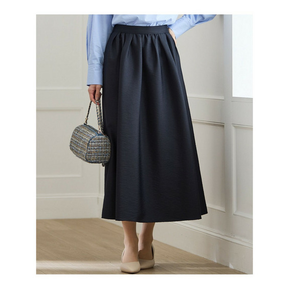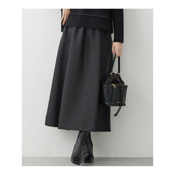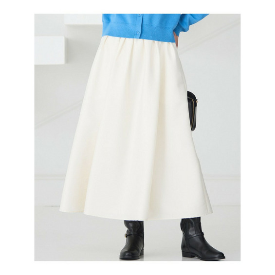 穿くだけで、一気に華やかな印象を演出するフレアスカートです。ウエスト部分にはステッチが施されており、トップスをインした際にさりげないアクセントになります。ウエスト下からヒップにかけては広がりすぎないように計算された美しいシルエットが魅力です。後ろウエストはゴム仕様のため、見た目の美しさだけでなく、ストレスフリーな穿き心地も嬉しいポイント◎。普段使いはもちろん、きれいめなブラウスやジャケットと合わせればオフィスやオケージョンなど、幅広いスタイリングをお楽しみいただけます。 カラーは、シックな印象で着回し力の高いブラック(#005)、上品で落ち着いた雰囲気ながらも柔らかな印象を与えるネイビー(#075)、明るく軽やかでコーディネートに抜け感をプラスするアイボリー(#002)の3色展開です。