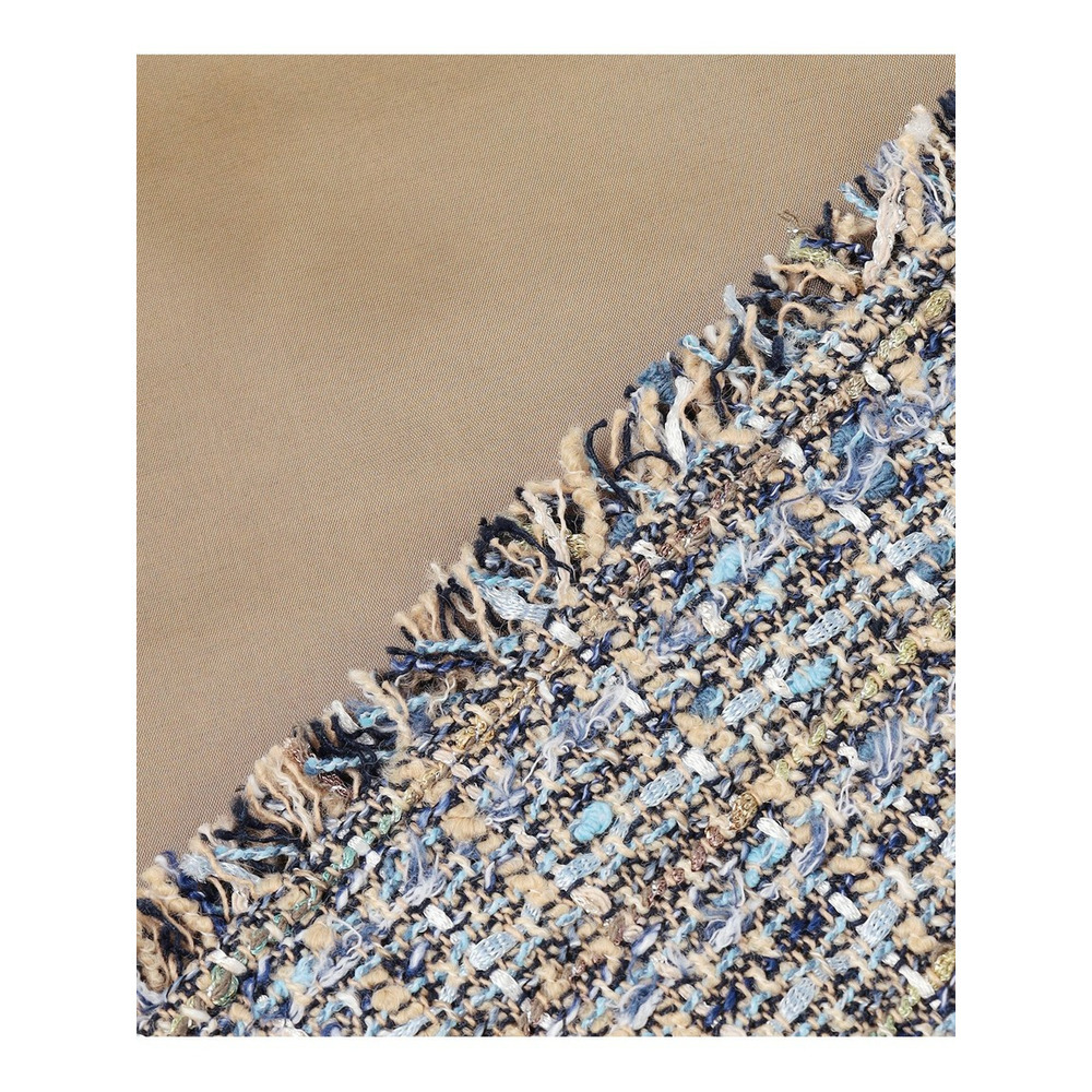 ブルーミックス(#370):こちらの生地は、多色見えが特徴です。生地の組織と特殊な糸を数種類使用することにより、多色の色調に奥行をもたせています。実際にプリントされたラメ糸、よこ糸に使用されているネップ糸、タリアッテレ(パスタと同様の呼び名)と呼ばれている平たいラメ糸など、独特の毛羽立ち効果を与える特殊な意匠糸を使用しています。