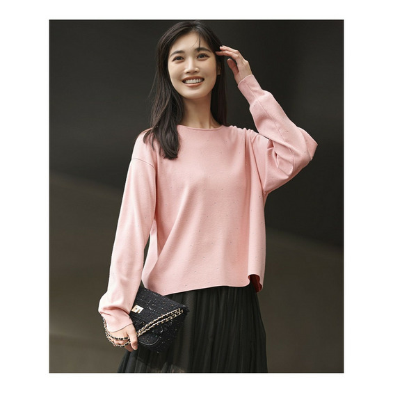 前面にちりばめられたクリスタルカラーのホットフィットが、顔周りを華やかに彩るニットプルオーバーです。程よくゆとりのあるボディサイズと、しっかりとした編み組織により、ボディラインを拾いにくく、快適な着心地を叶えます。着丈は短すぎず、ウエストインでもアウトでもバランスが取りやすく、様々なボトムスとのコーディネートをお楽しみいただけます。 シンプルなパンツやスカートに合わせるだけで、上品で洗練されたスタイルが完成。クリスタルの煌めきが華やかで、ホリデーシーズンや特別な秋冬のお出かけにもぴったりです。 カラーは、クリーンで上品な印象のホワイト(#001)、シックで洗練されたブラック(#005)、顔色を明るく見せる優しい華やかさのWEB&一部店舗限定カラーのピンク(#012)、爽やかで知的な印象のブルー(#070)の4色展開です。特にブラック(#005)は、襟元と袖口リブの先にオフホワイトの配色を施し、さりげないアクセントを加えています。