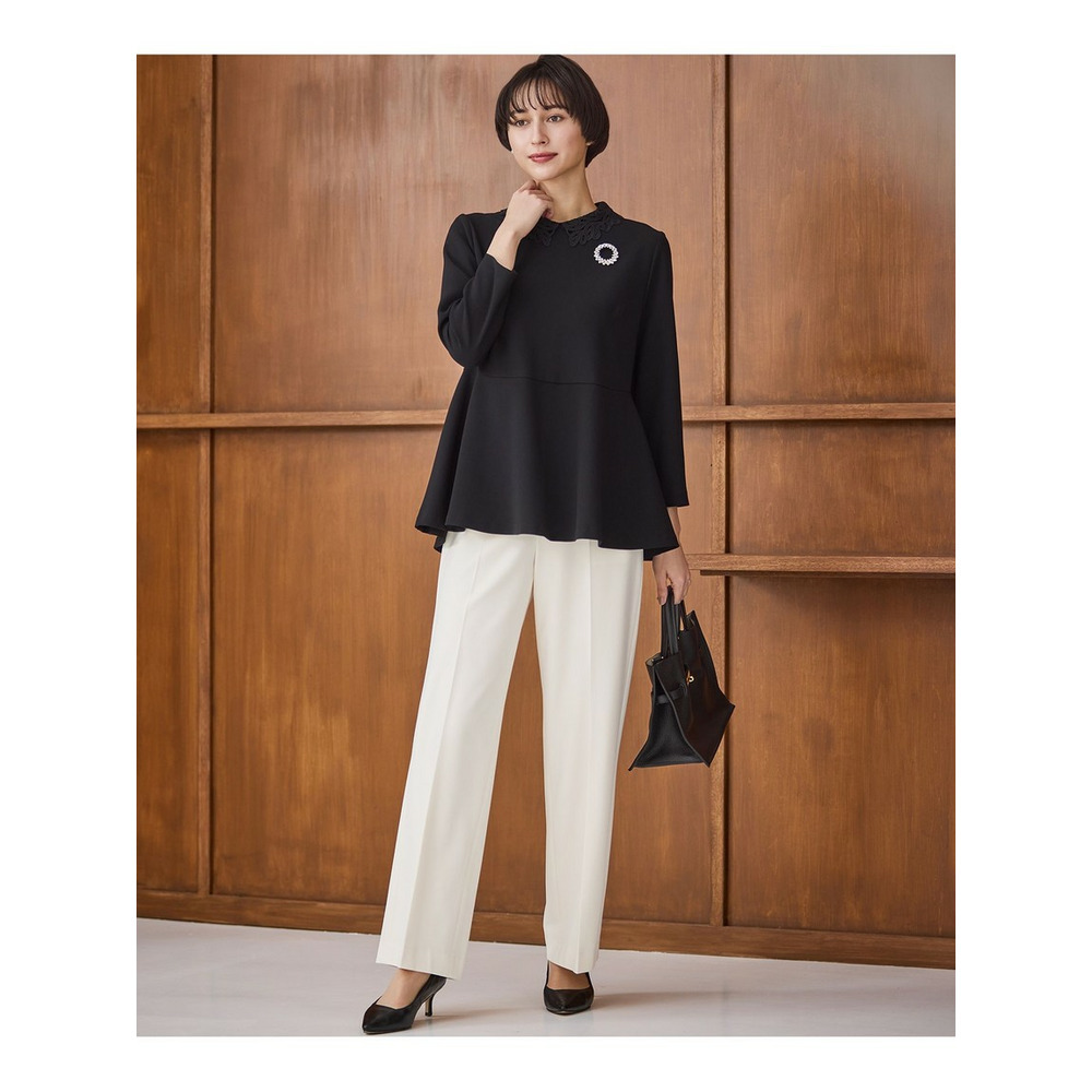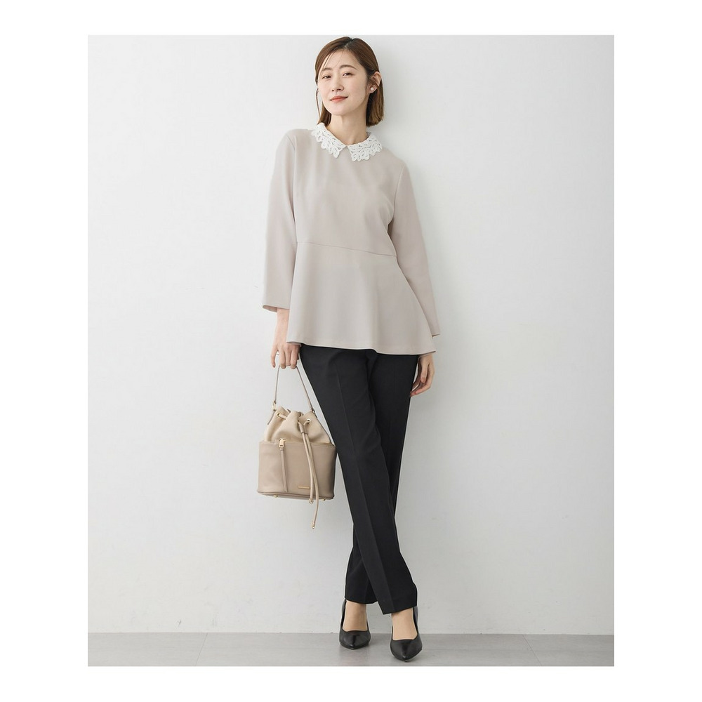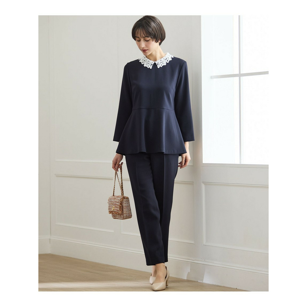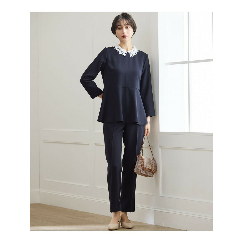 セレモニーシーンからビジネスシーンまで、幅広い場面で活躍する23区定番素材スーツシリーズのブラウスです。最大の特徴は取り外し可能なレース襟。襟を付ければ華やかでエレガントな印象に、外せばすっきりとしたシンプルなデザインになり、シーンや気分に合わせて2通りの着こなしをお楽しみいただけます。女性らしいペプラムシルエットは、ウエスト周りを自然にカバーしながら、洗練された華やかさを演出します。同素材のパンツとセットアップで着用すれば、統一感のあるきちんとスタイルが完成。ビジネスシーンはもちろんのこと、パールネックレスやブローチを添えれば、入学式や卒業式などのセレモニー、ご家族行事、七五三、新年のご挨拶といった特別な日にも自信を持ってご着用いただけます。一枚で何役もこなす、着回し力の高いのアイテムです。カラーは明るくやさしい印象で、顔周りを華やかに見せてくれるベージュ(#033)、合わせやすく落ち着いた色合いで、上品なきちんと感を演出するネイビー(#075)、洗練された印象を与える定番カラーで、どんなシーンにも対応できる万能色ブラック(#005)の3色展開です。