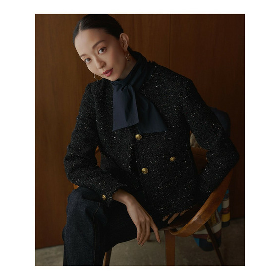 イタリアのテキスタイルメーカーGIOLICA社のファンシーツイードを使ったノーカラージャケット。カラーによって素材の表情の違いが楽しめ、それぞれに異なった華やかなさをプラスしてくれます。コンパクトな着丈とボクシーなシルエットできちんと感を持たせつつ、フリンジやゴールドをきかせたメタル釦がアクセントになります。程よいカジュアル感も兼ね備えているため、きれいめなボトムと合わせたONスタイルはもちろん、あえてデニムなどのカジュアルボトム合わせるのもおすすめです。カラーは柔らかなテラコッタミックス(#334)、品の良いブルーミックス(#370)、シックな印象でシーンを問わず使えるブラックミックス(#305)の3色展開です。