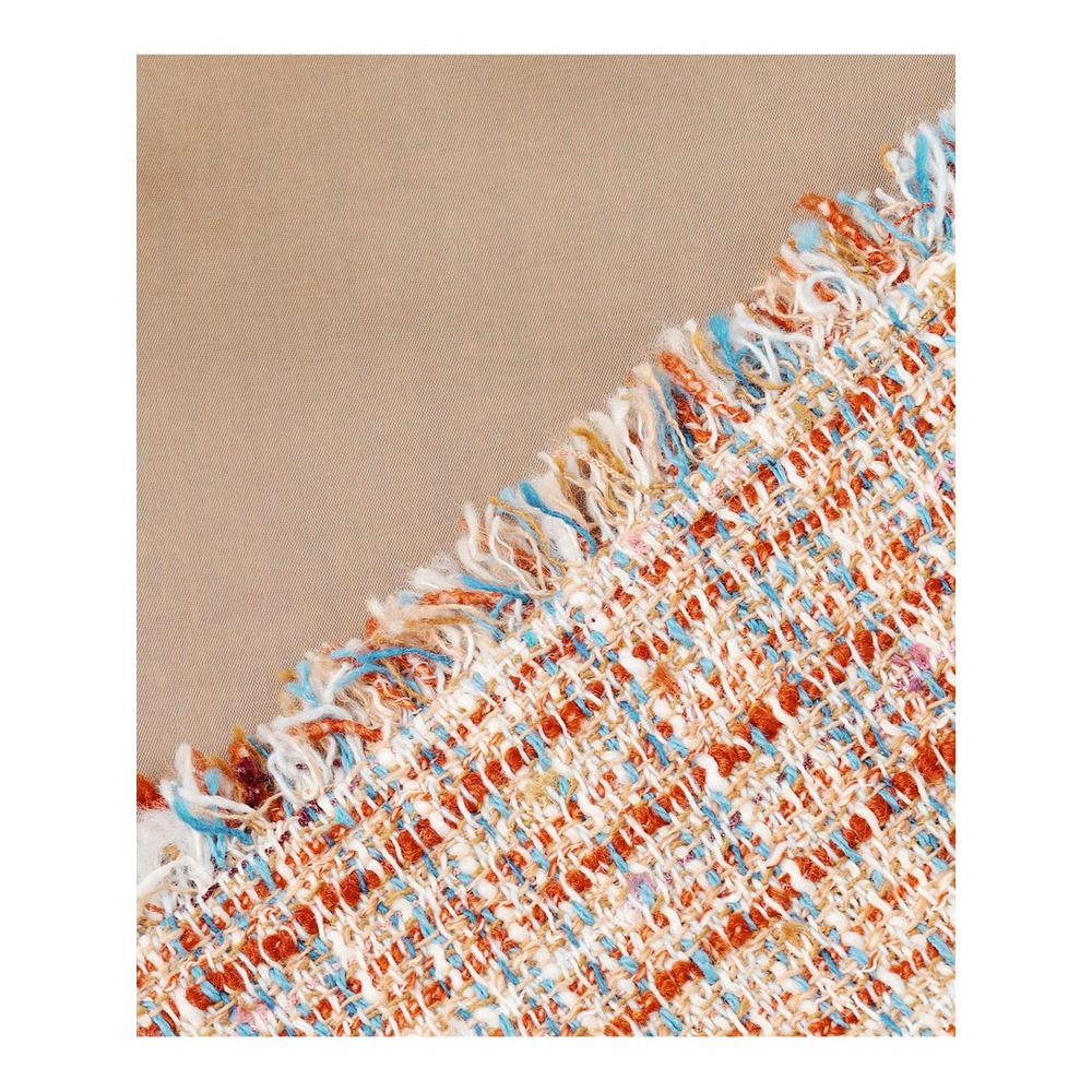 イタリア・プラトーの「GIOLICA」社による23区オリジナルツイード素材です。テラコッタミックス(#334):こちらの生地は細いバインディング糸(結束糸)を使用し、経糸にさまざまな糸を織り込むことでストライプ効果を出しています。さらにたて糸にスラブ糸を入れることで、生地全体にランダムな配色効果を加えています。