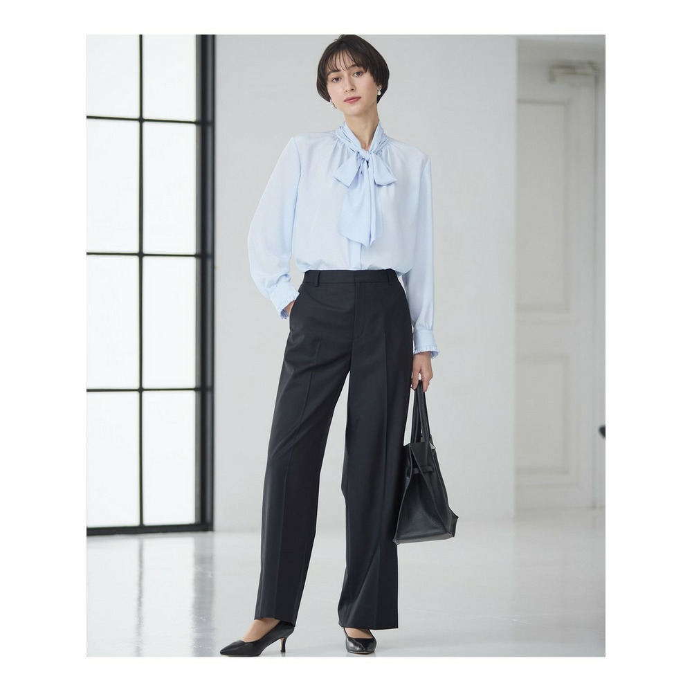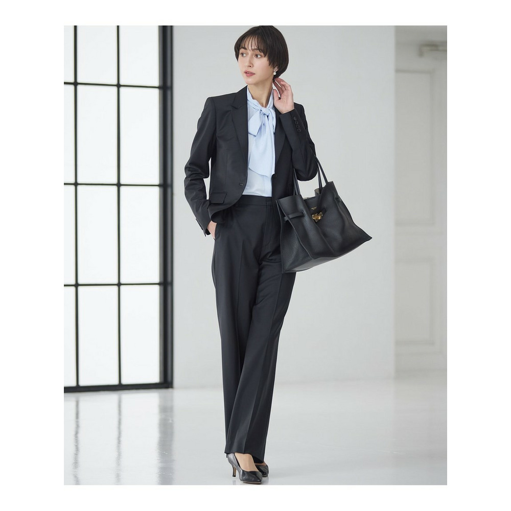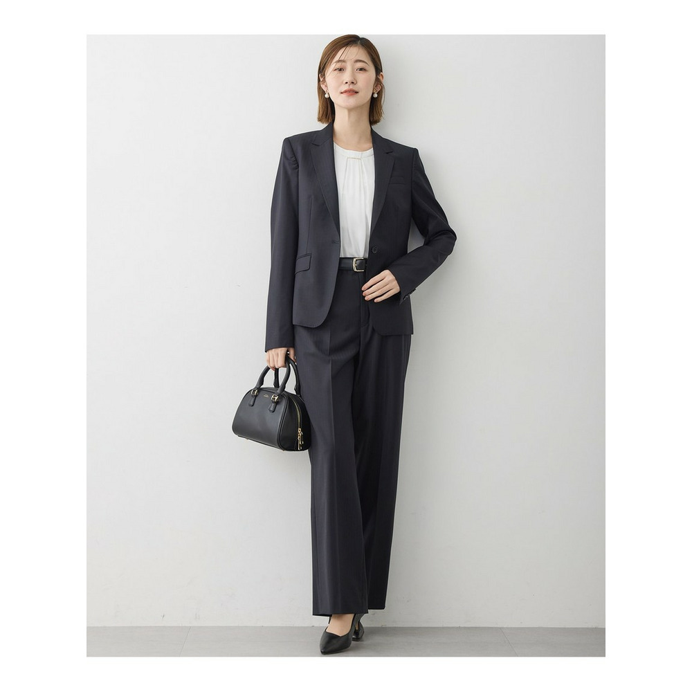すっきりとしたワイド過ぎない上品なシルエットが特徴のパンツです。センタープレスが縦のラインを強調してくれます。裏地のない一枚仕立てのため、軽やかな穿き心地で、季節を問わず快適に着用いただけます。 同素材のジャケットと合わせれば、通勤やセレモニーシーンにふさわしい洗練されたセットアップスタイルが完成します。また、単品使いでもきれいめスタイルとして、デイリーにも活躍する一本です。カラーは、着回し力抜群のベーシックなブラック(#005)、濃紺寄りの深いネイビーストライプ(#175)、洗練された都会的な雰囲気を醸し出すグレー(#004)の3色展開です。