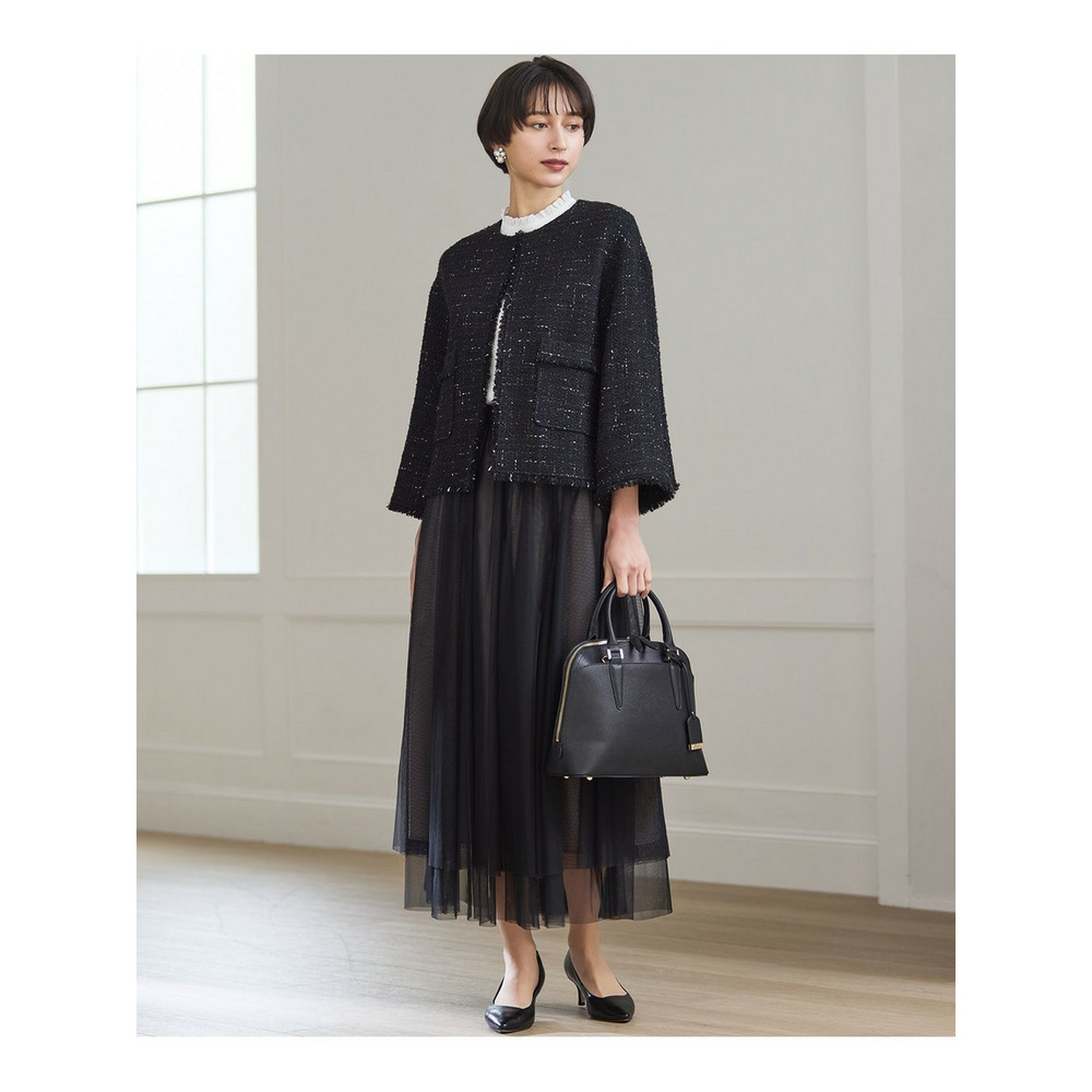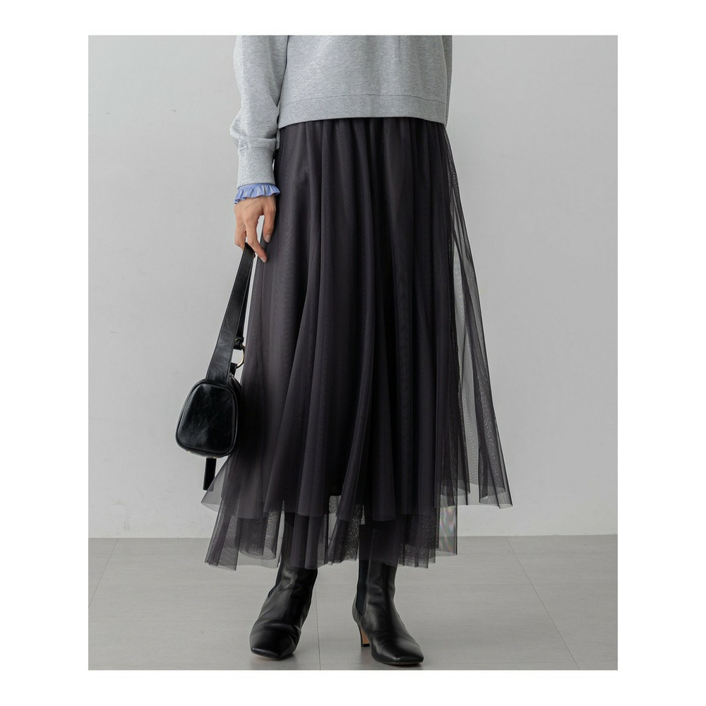 チュールを重ねることで、奥行きのある表情と軽やかな動きを演出するスカートです。歩くたびにふわりと揺れる裾の段差が、優雅で洗練された印象を与えます。ウエストからヒップにかけては、マチを入れることで広がりすぎず、すっきりと大人っぽく着こなせるよう仕上げています。ウエストはゴム仕様で、ストレスフリーな穿き心地も嬉しいポイントです。カジュアルなスウェットやニットと合わせてデイリーにはもちろん、きれいめのジャケットと合わせて保護者会などのオケージョンシーンにも着用いただけます。カラーは、着回し力抜群のシックなブラック(#005)、落ち着いた雰囲気で柔らかな印象を与えるチャコールグレー(#004)の2色展開で、様々なコーディネートに活躍します。