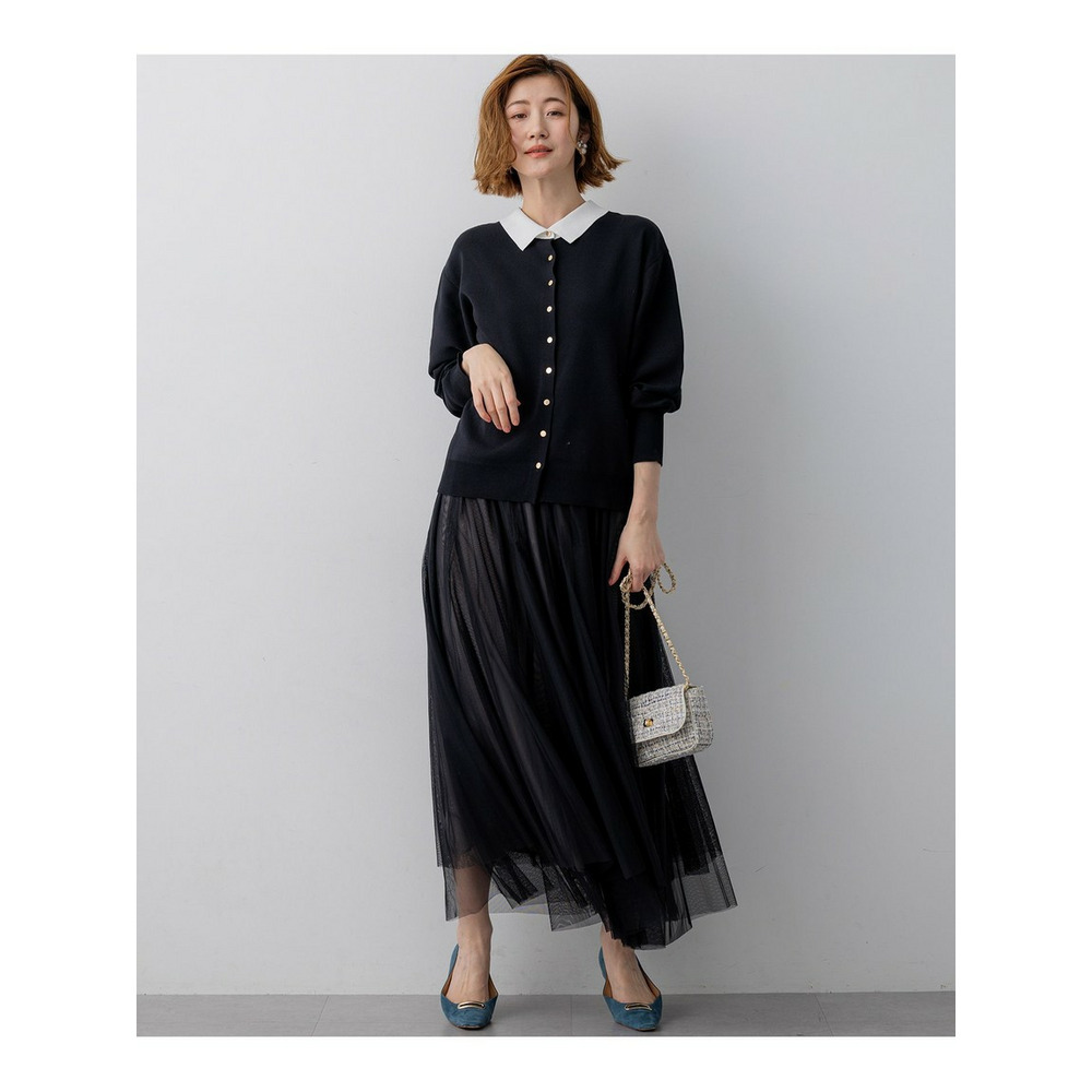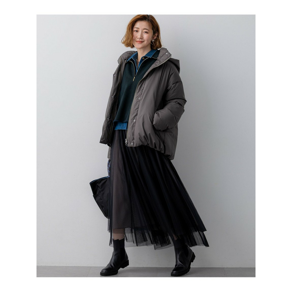チュールを重ねることで、奥行きのある表情と軽やかな動きを演出するスカートです。歩くたびにふわりと揺れる裾の段差が、優雅で洗練された印象を与えます。ウエストからヒップにかけては、マチを入れることで広がりすぎず、すっきりと大人っぽく着こなせるよう仕上げています。ウエストはゴム仕様で、ストレスフリーな穿き心地も嬉しいポイントです。カジュアルなスウェットやニットと合わせてデイリーにはもちろん、きれいめのジャケットと合わせて保護者会などのオケージョンシーンにも着用いただけます。カラーは、着回し力抜群のシックなブラック(#005)、落ち着いた雰囲気で柔らかな印象を与えるチャコールグレー(#004)の2色展開で、様々なコーディネートに活躍します。
