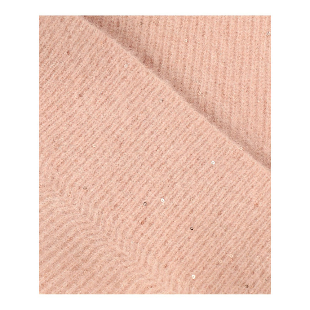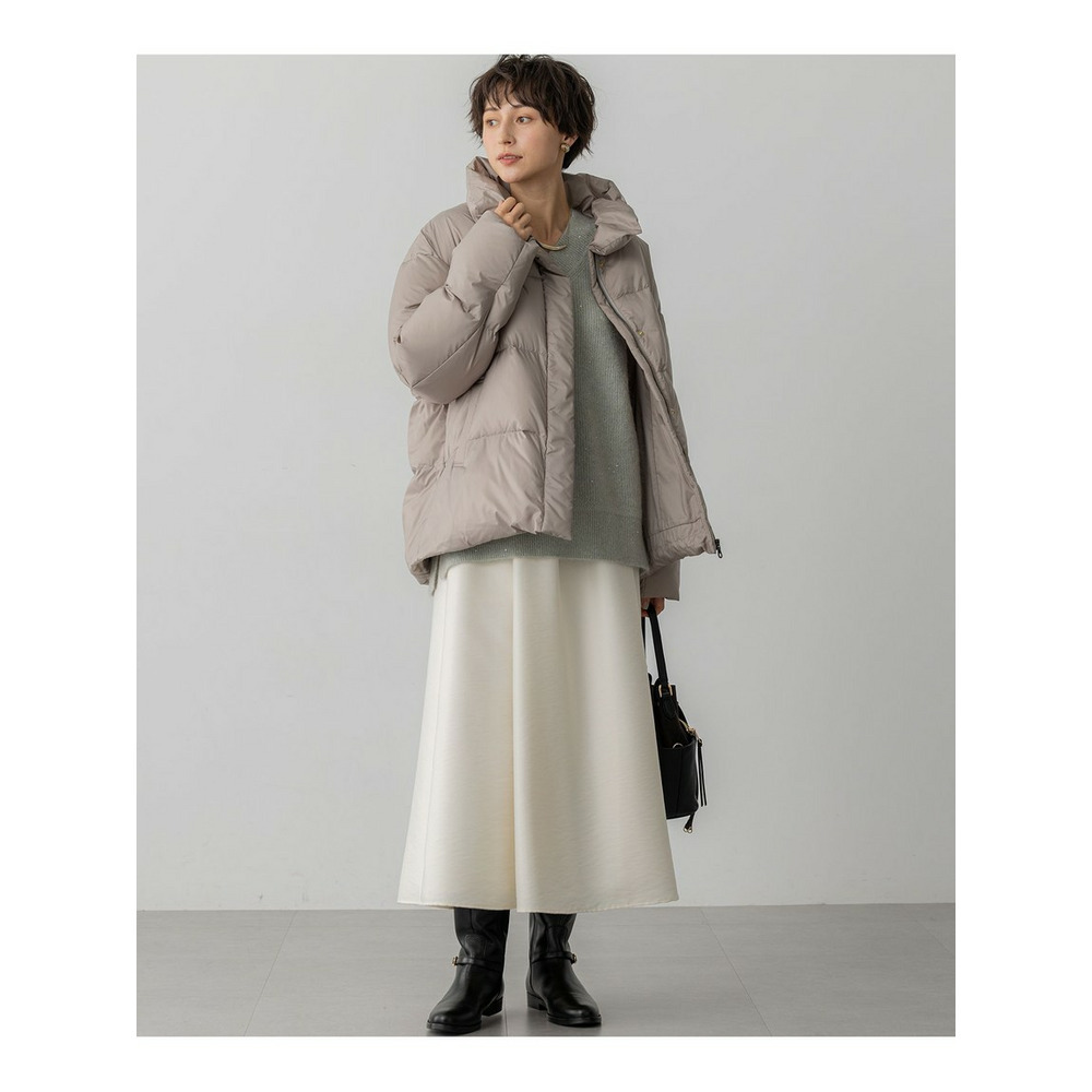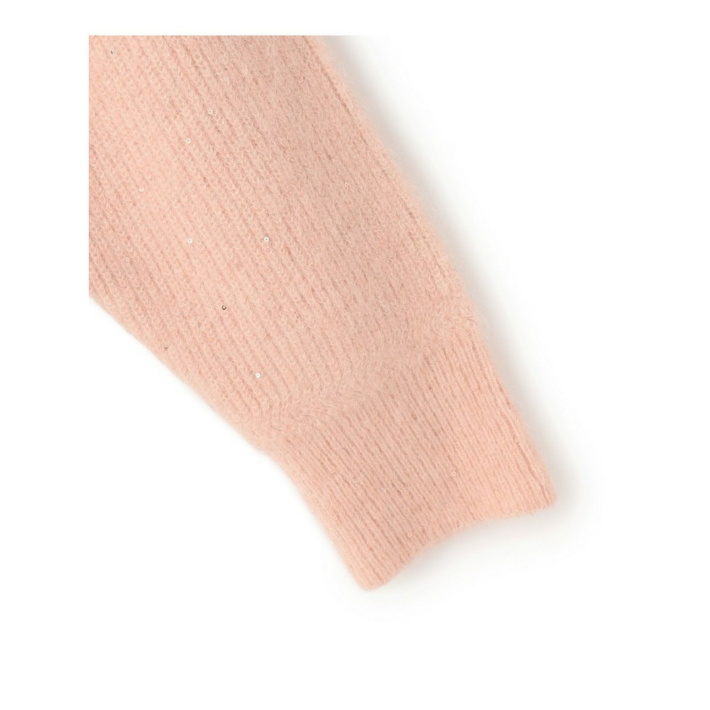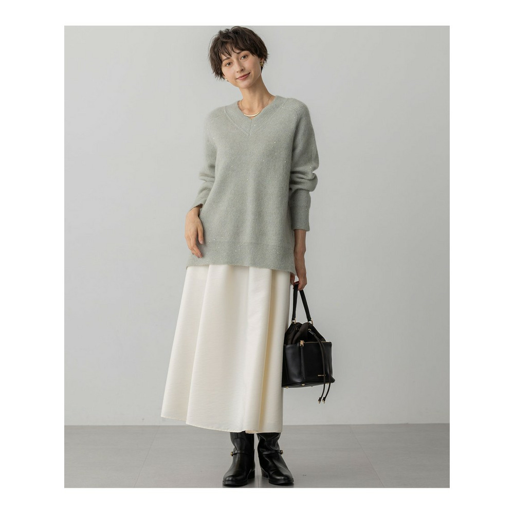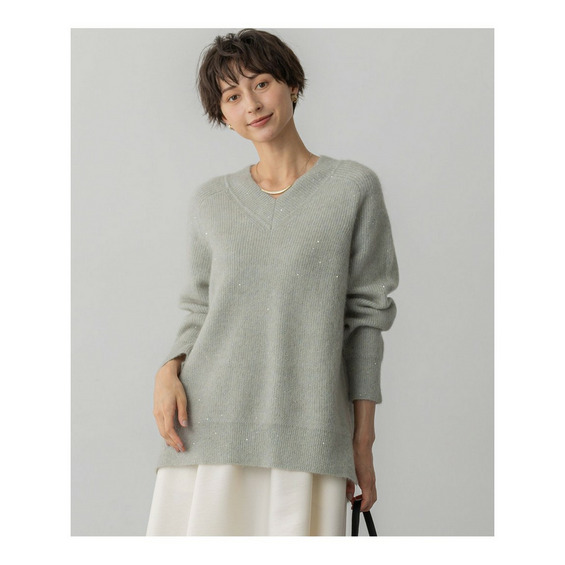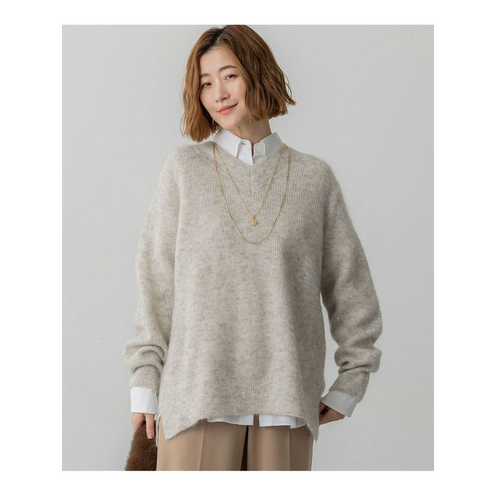 オーストラリア産のメリノウールと南アフリカ産の上質なモヘヤといった天然繊維をベースに、同色系の極小スパンコールとラメ糸をブレンドした、表情豊かなファンシーヤーンを使用しています。繊細なきらめきと、ふわふわとした程よい毛足の長さ、そしてふっくらとした肌触りが特徴です。見た目の華やかさだけでなく、軽やかな着心地でありながらもしっかりと暖かく、高級感と機能性を兼ね備えた素材です。