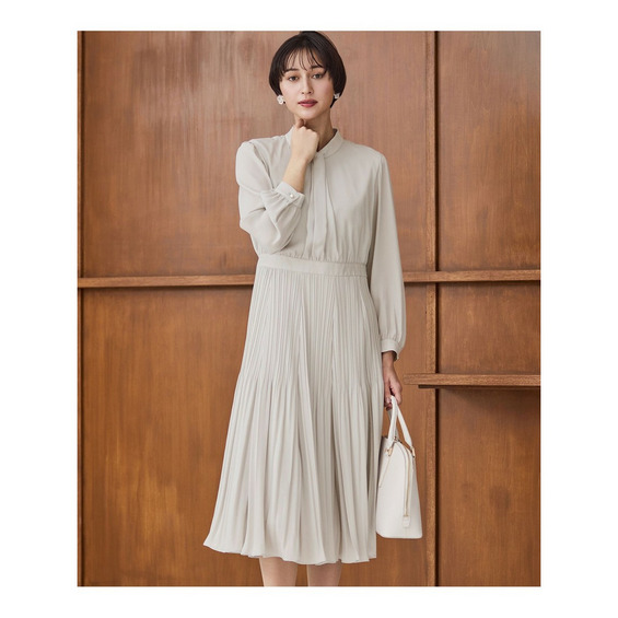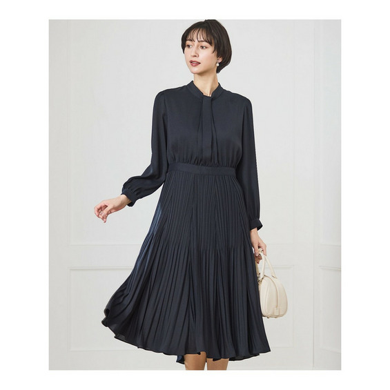 一枚でも品よく着映えする長袖フレアワンピース。上品な光沢感とさらっとした風合いで、ハレの日にぴったりなアイテムです。胸元フロントディテールや、スカート切り替え部分の繊細なランダムプリーツなど、さりげなく随所にデザインをきかせることで、柔らかく優美な女性らしさを演出します。袖口についたパール釦がワンポイントに。ツイードジャケットと合わせても素敵に着こなせるよう、華美になりすぎない上品なデザインに仕上げました。ハレの日にはもちろん、お仕事やお出かけ着としても汎用性の高いアイテムです。カラーは柔らかく華やかな印象のベージュ(#033)、きちんと感が増す落ち着きのあるネイビー(#075)の2色展開です。