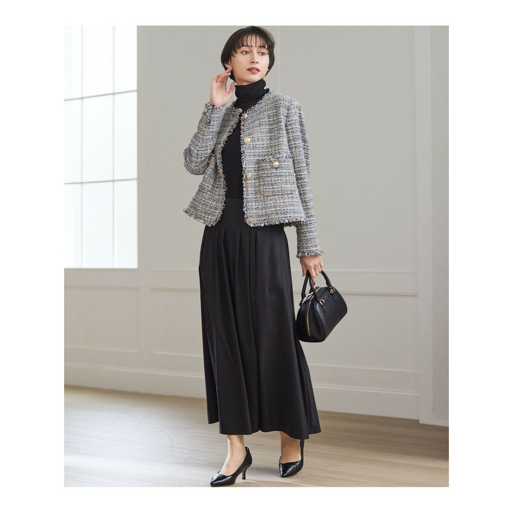 ランダムにあしらわれたタックが特徴的な、カジュアルながらも上品な印象のタフタスカートです。タックの位置にこだわり、サイドにはタックを入れないことで、着用した際に腰回りがすっきりと見えるよう工夫しています。この計算されたデザインが、洗練されたシルエットを演出します。ゆったりとしたニットから、きちんと感のあるジャケットまで、様々なトップスと相性が良く、オンオフ問わず幅広いシーンで活躍する万能アイテムです。 カラーは、着回し力抜群でシックな印象のブラック(#005)、上品で落ち着いた雰囲気を醸し出すネイビー(#075)、暖かみがありコーディネートにこなれ感をプラスするブラウン(#030)の3色展開です。