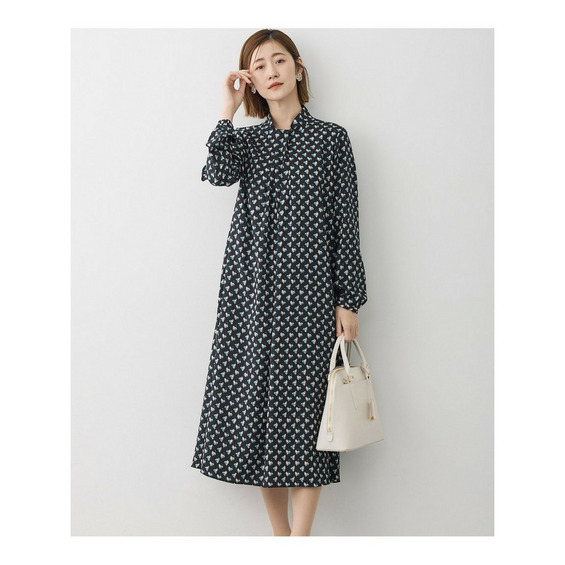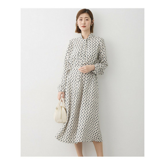 イタリア図案をベースにアレンジしたオリジナルの柄の長袖ワンピース。イタリアの感性を感じるアートタッチな柄を、着用しやすいモチーフサイズで仕上げています。小ぶり柄ながらさりげなく色味を感じさせる配色で華やかさを演出します。襟元にボウタイのようなディテールを入れることで、ジャケットのインナーとしても映えるデザインです。共布ベルトですっきりとした着こなしも楽しめます。通勤やオケージョンなどのきれいめスタイルにも活躍する1着です。カラーは優しく柔らかな雰囲気のベージュ(#502)と、知的で洗練された印象を与えるネイビー(#575)の2色展開です。