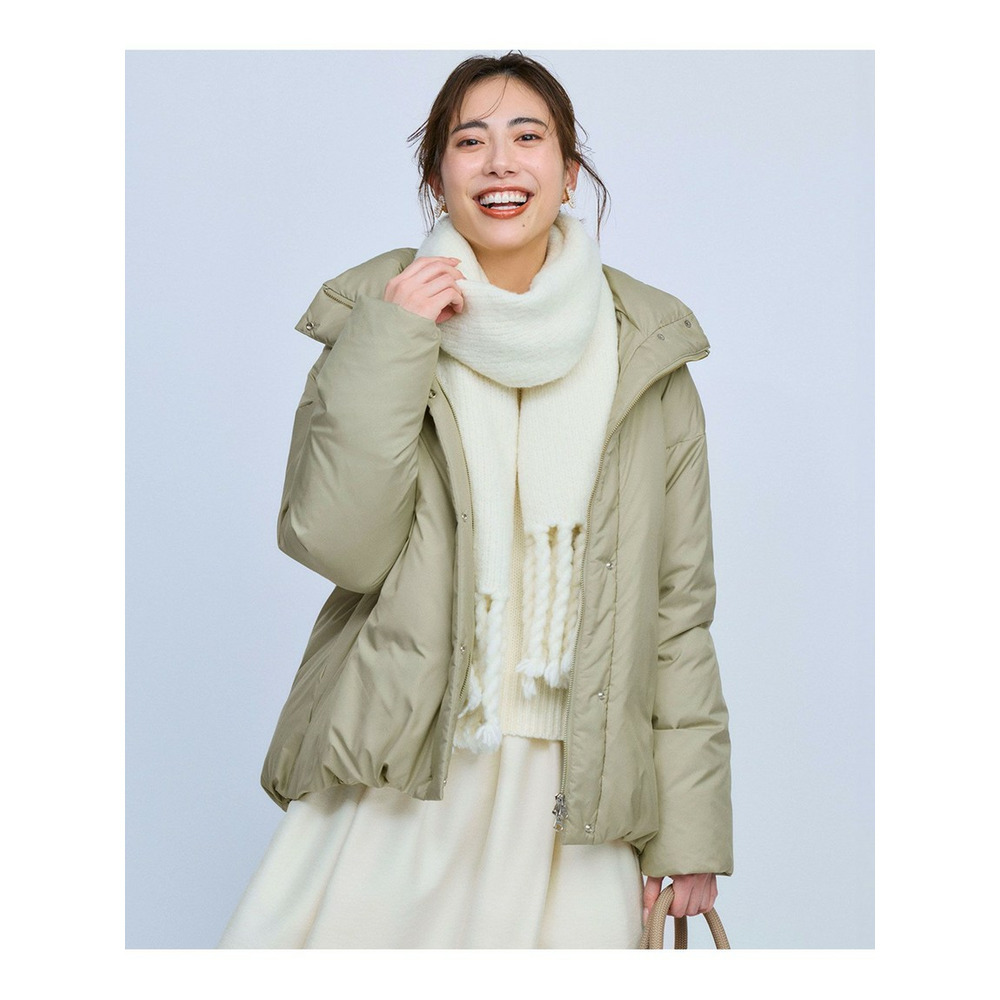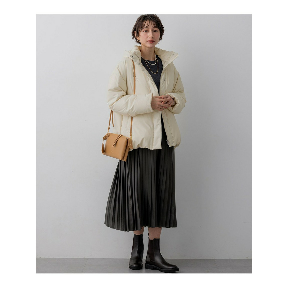 ダウン特有の表に出るステッチをなくし、スタイリッシュなフォルムで仕上げたステッチレスダウン。適度な分量と着丈を残しつつ、着用によるブクつきと着ぶくれ感を回避した表面のすっきりしたダウンアイテムとして、さまざまなスタイルに合わせやすいアウターに仕上げています。フードはファスナーで取り外し可能に、袖口裏地部分はゴムを入れて冷気が入りにくい仕様にしました。裾にあしらったドローコードでシルエットに変化をつけて着回しを楽しんでいただけます。カラーは、上品で暖かみのあるアイボリー(#002)、自然で柔らかなライトベージュ(#033)、洗練された印象のライトセージグリーン(#003)、落ち着きのあるチャコールグレー(#004)、スタイリングを引き締めるブラック(#005)の5色展開です。