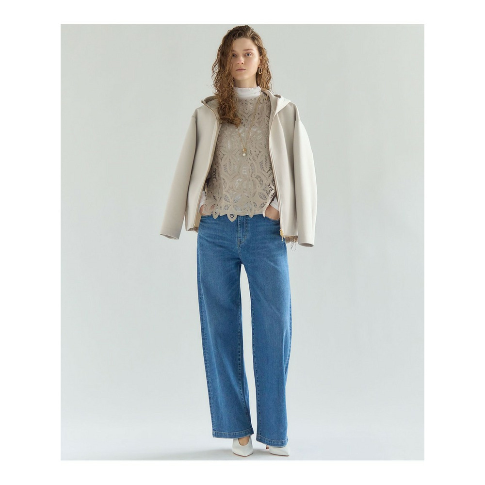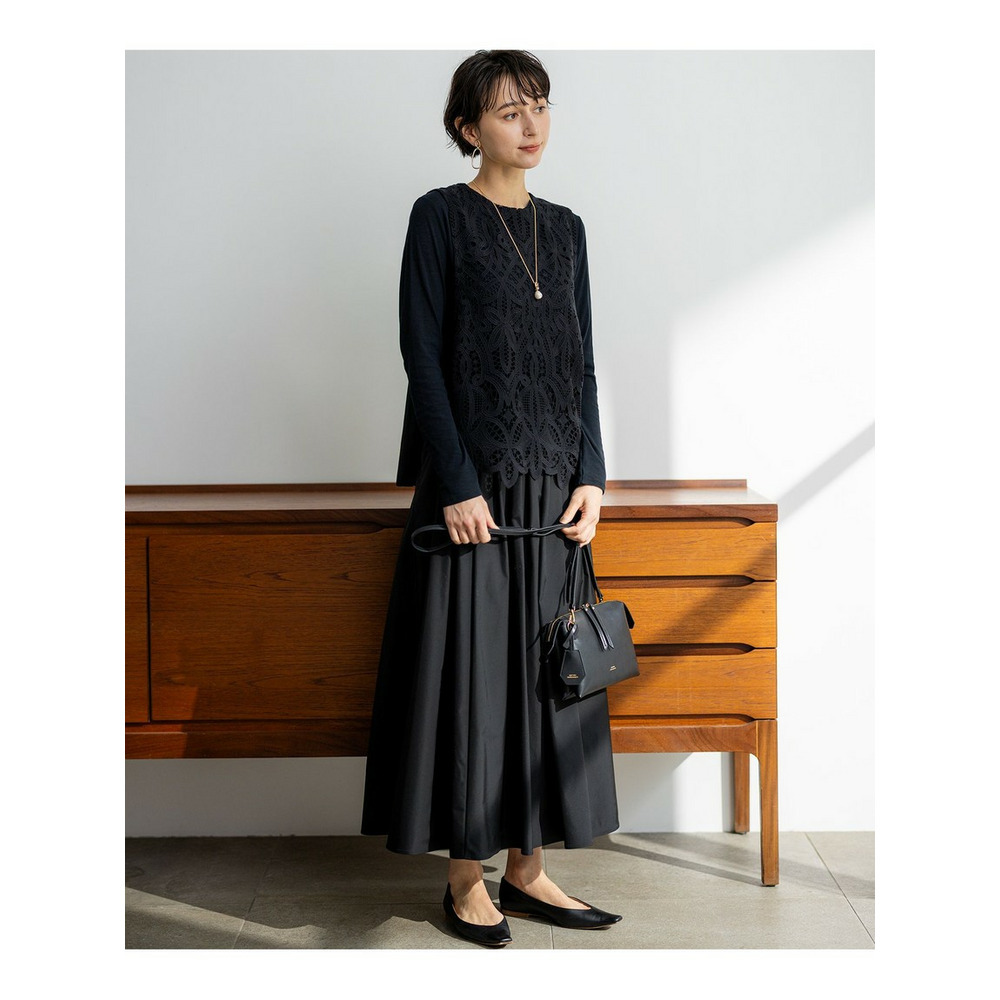 前身頃に繊細なレース、後ろ身頃には肌触りの良いニット素材を組み合わせた、表情豊かなニットベストです。昨年よりも着丈を長くすることで、気になる腰回りを自然にカバーしつつ、トレンド感のある着こなしを叶えます。脇はニット素材で繋ぎ、すっきりとしたシルエットを保ちながらも、動きやすさも考慮しました。襟元は伸びにくい仕様のため、後ろにスリットを施し、着脱のしやすさとデザイン性を両立しています。裾にあしらわれたレースのスカラップデザインがポイントで、ブラウスやシャツ、シンプルなカットソーに重ねるだけで、いつものコーディネートがぐっと洗練された印象に。カラーは、優しく上品な印象のアイボリー(#002)、落ち着きと温かみのあるベージュ(#033)、知的で洗練された深いネイビー(#075)の3色展開です。