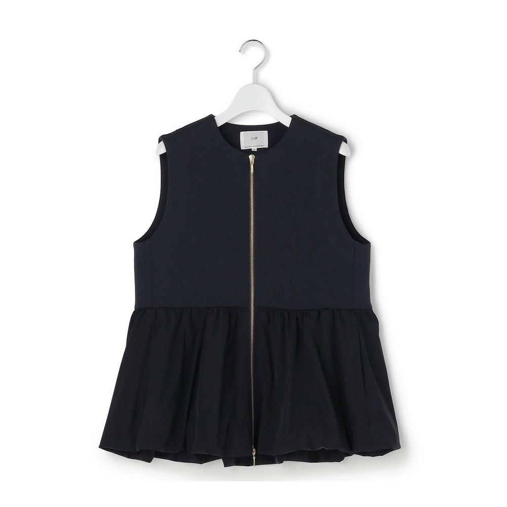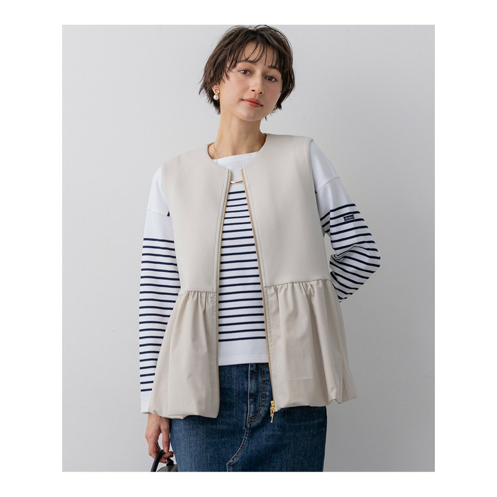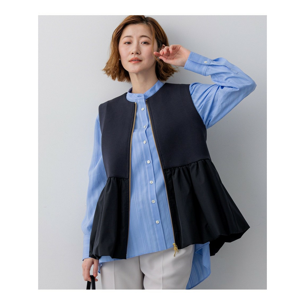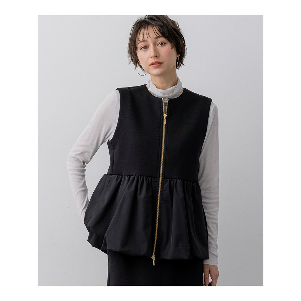 ウエストから布帛素材をコンビ使いにした、ペプラムシルエットのジレアウターです。裾のタフタ部分を裏地で吊って、バルーンシルエットにしています。素材の軽やかさを活かしつつ、スポーティー過ぎない女性らしいアイテムにしました。マニッシュなワイドパンツであわせてこなれ感を出しても◎。ウエスト回りがすっきりした同素材のタイトスカートにあわせて程よい甘さのセットアップとしての着用もおすすめです。綺麗めな小物を合わせていただければオケージョンシーンにも活躍する、万能アイテムとなっています。 カラーは、上品で落ち着いた印象のベージュ(033)、知的で洗練されたネイビー(075)、着回し力抜群でシックなブラック(005)の3色です。