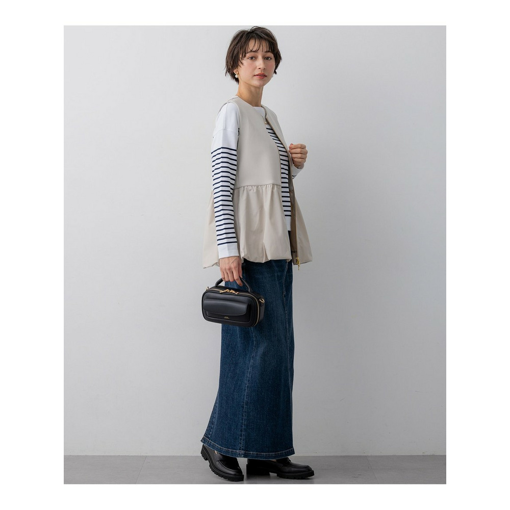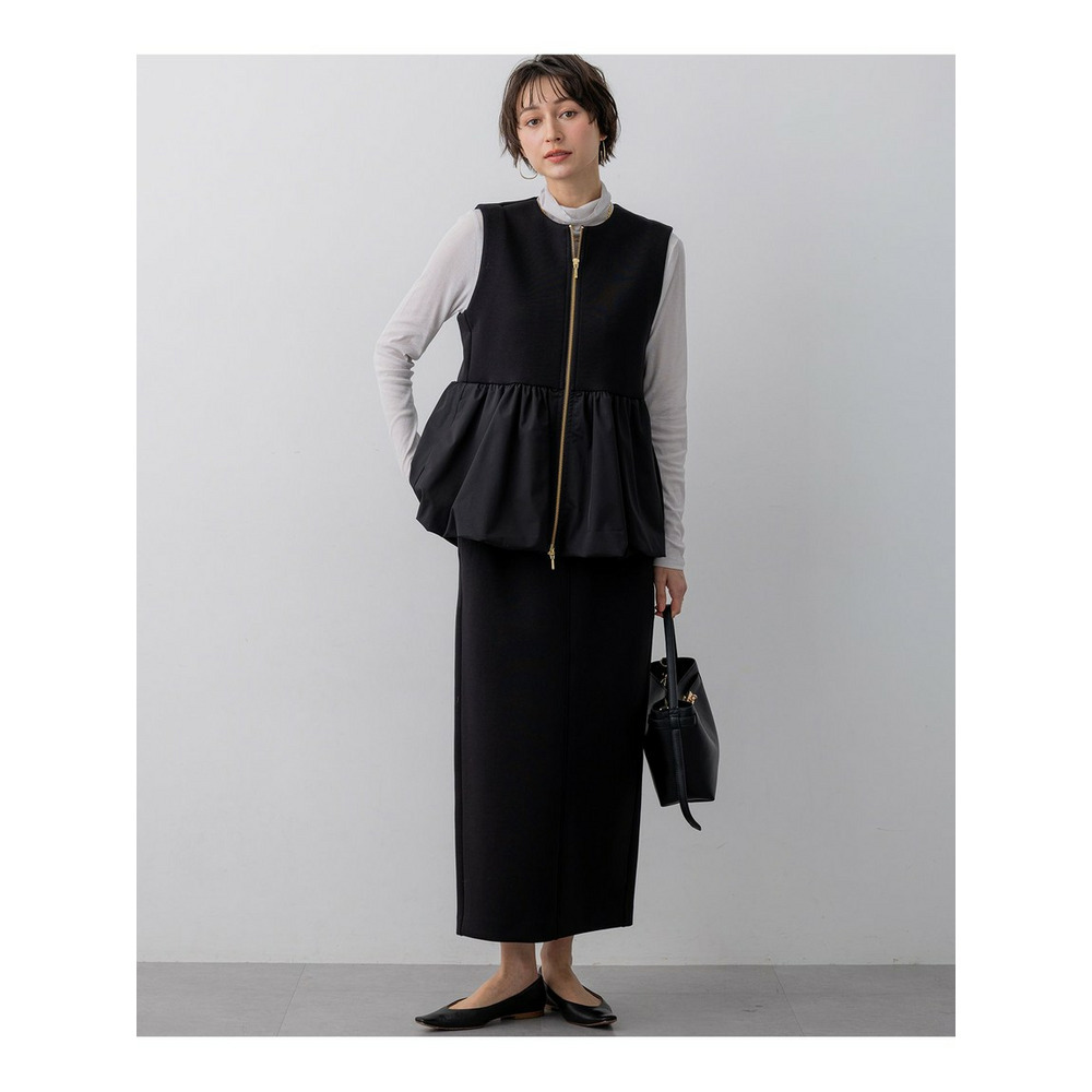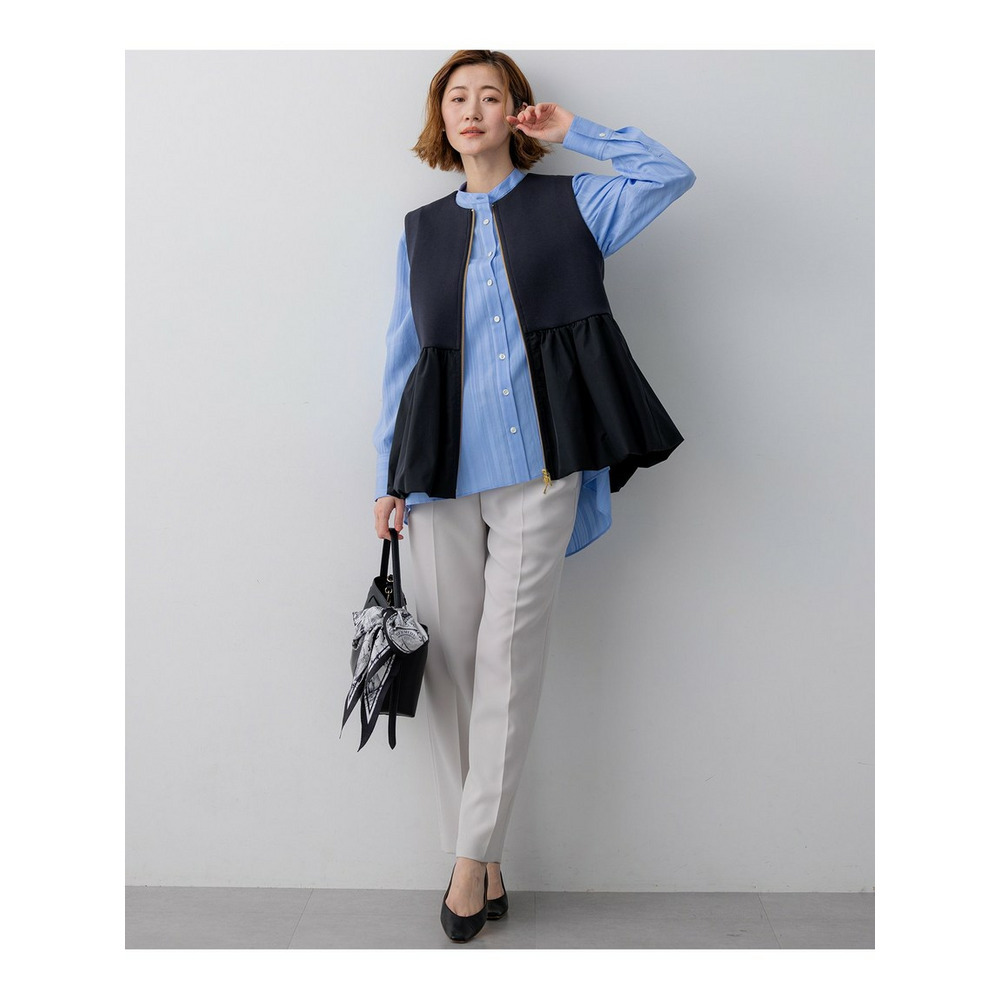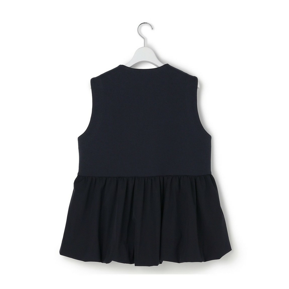 ウエストから布帛素材をコンビ使いにした、ペプラムシルエットのジレアウターです。裾のタフタ部分を裏地で吊って、バルーンシルエットにしています。素材の軽やかさを活かしつつ、スポーティー過ぎない女性らしいアイテムにしました。マニッシュなワイドパンツであわせてこなれ感を出しても◎。ウエスト回りがすっきりした同素材のタイトスカートにあわせて程よい甘さのセットアップとしての着用もおすすめです。綺麗めな小物を合わせていただければオケージョンシーンにも活躍する、万能アイテムとなっています。 カラーは、上品で落ち着いた印象のベージュ(033)、知的で洗練されたネイビー(075)、着回し力抜群でシックなブラック(005)の3色です。
