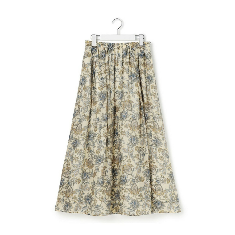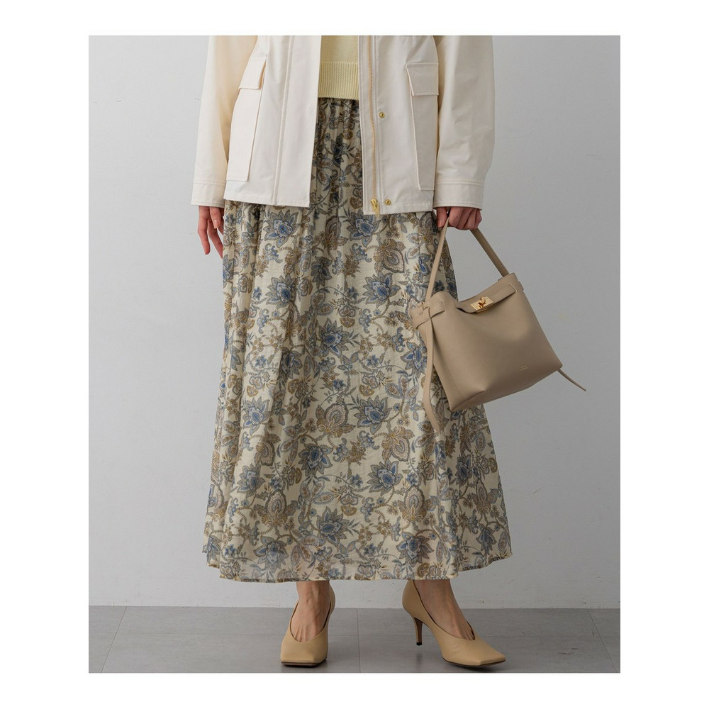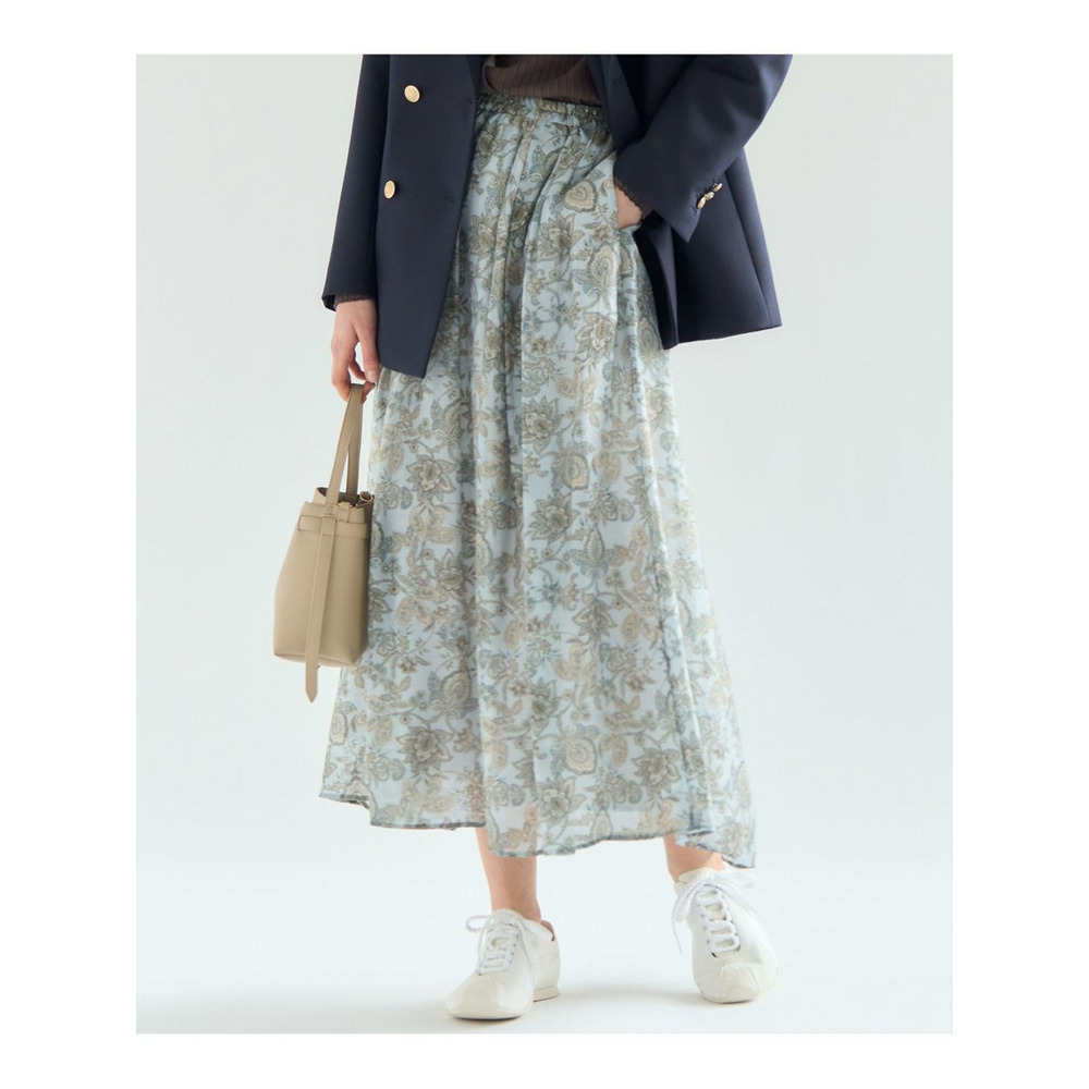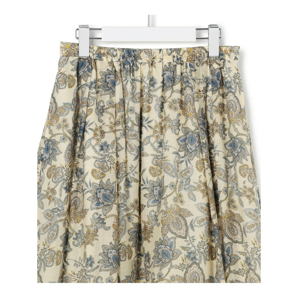 存在感のあるペイズリープリントを主役にした、シンプルなフレアスカートです。程よい分量感がありながらも、透け感のある軽やかな素材を使用しているため、重たくなりすぎず、軽やかな雰囲気でご着用いただけます。歩くたびにしなやかに揺れるシルエットが、コーディネートに上品な華やかさをプラスします。シンプルなトップスと合わせるだけで、洗練された大人のスタイリングが完成する一枚です。 ブラウスやニットと合わせてオフィススタイルに、Tシャツやスウェットと合わせてカジュアルダウンにと、幅広いシーンで活躍します。お食事会や旅行など、少し特別な日のお出かけにもおすすめです。カラーは、柔らかな印象で上品さを引き立てるアイボリー系(502)と、爽やかで洗練された雰囲気を醸し出すサックス系(572)の2色展開です。