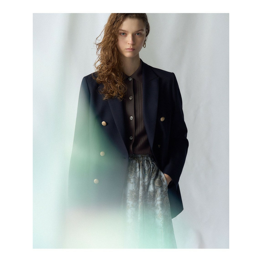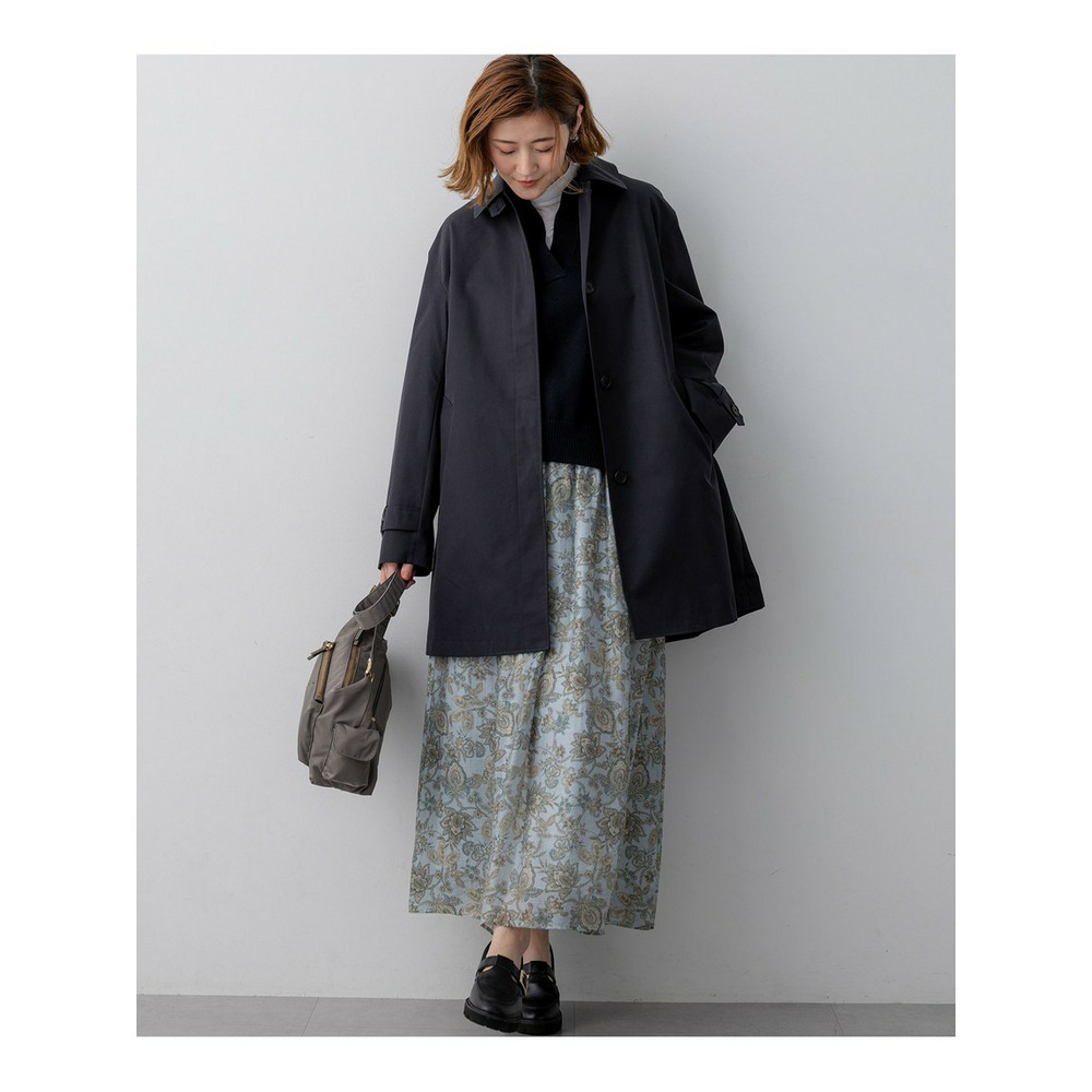 イタリアのプリントメーカー「Erica」社による、ペイズリープリント素材を使用しています。インド的なモチーフにインスパイアされたデザインは、繊細な輪郭と調和の取れた配色が特徴で、洗練された印象を与えます。柔らかなブルーとニュートラルなベージュのトーンが洗練された印象を醸します。 プリントの基布には、オーガンザのように軽やかなタッチの生地を採用することで、抜け感のある明るい発色でプリントを表現しています。この生地には、環境に配慮したリサイクル素材の国際認証であるGRS認証を取得した、レンチング社のリオセル繊維が一部使用されており、サステナビリティにも貢献しています。軽やかで肌触りの良い素材感が、快適な着心地をお届けします。