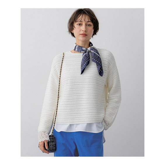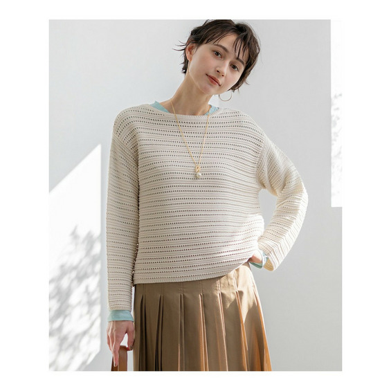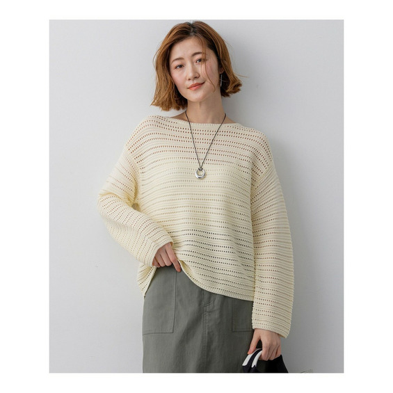 アイレットを効かせた軽やかな編み柄とナチュラルなツヤ感が魅力のボートネックニットです。程よいゆとりのある絶妙なサイズ感に仕上げているため、すっきりと着こなせ、大人のきれいめカジュアルスタイルを演出します。一枚でさらりと着るのはもちろん、シャツやカットソーとのレイヤードスタイルで、いつもの着こなしを一段とブラッシュアップしてくれます。カラーは、清潔感のあるホワイト(#001)、上品で肌なじみの良いベージュ(#033)、知的な印象のネイビー(#075)、顔周りを明るく見せるライトイエロー(#042)の4色展開です。