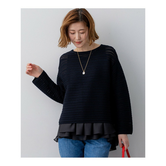 軽やかアイレットとツヤ感で魅せる、きれいめボートネックニット