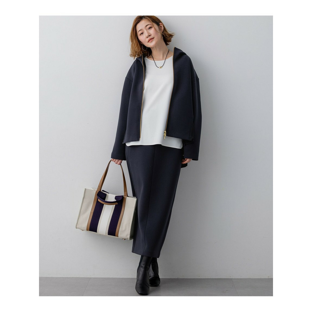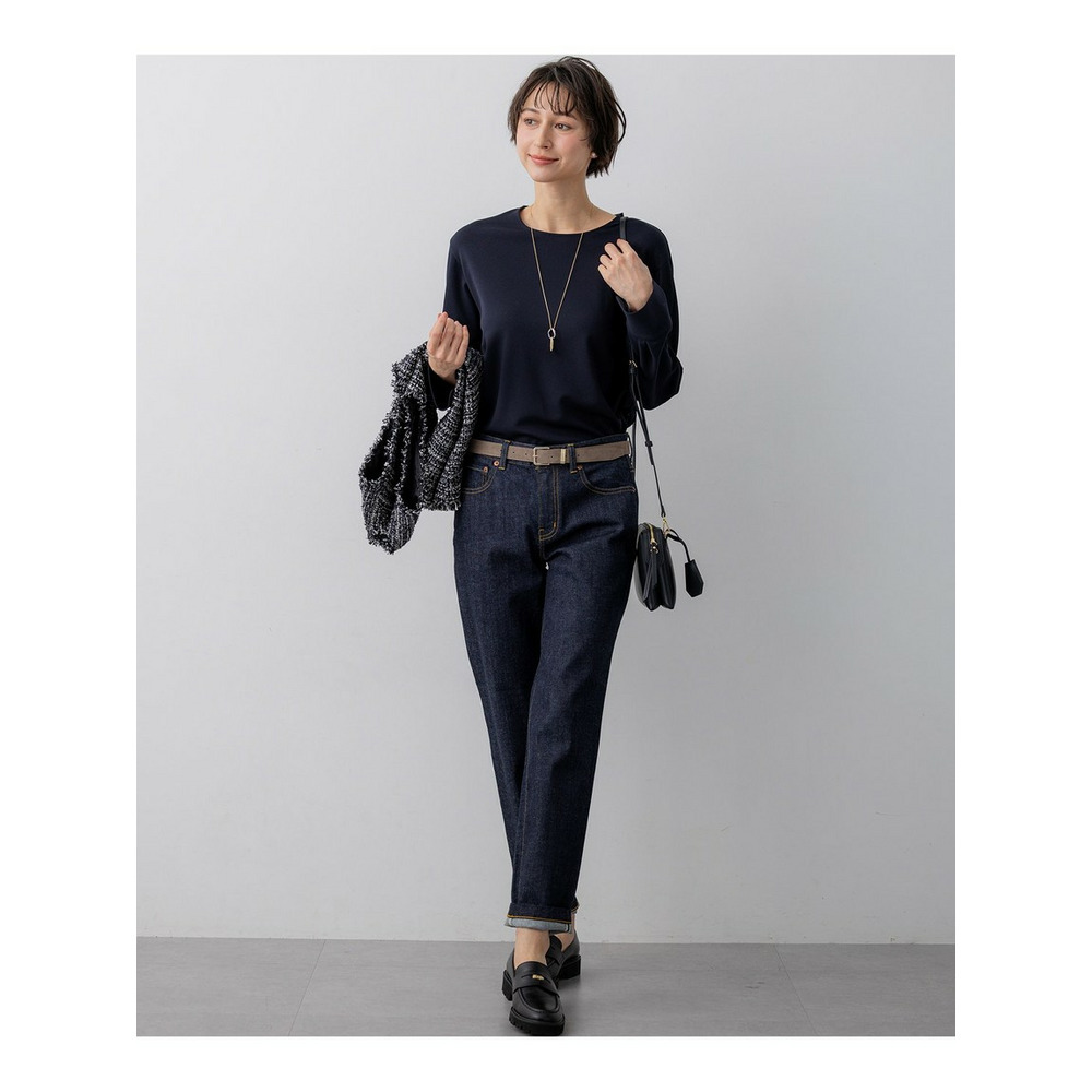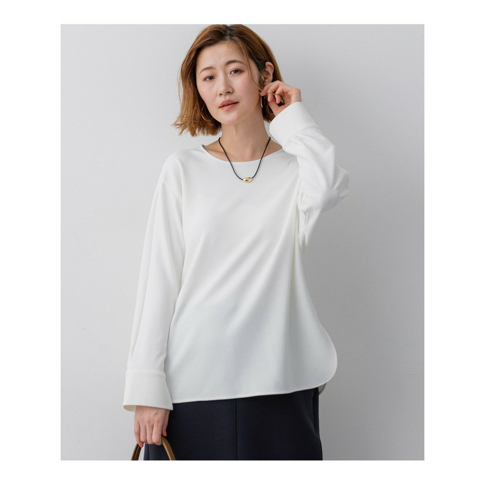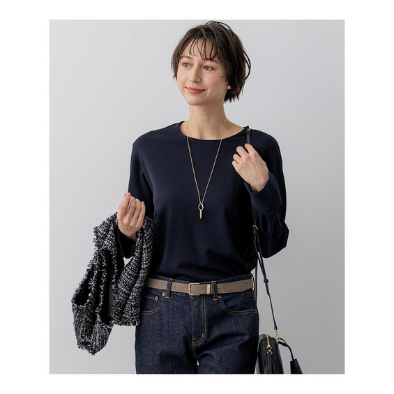 まるで布帛のようなきちんと感がありながら、ジャージ素材ならではの伸縮性と快適な着心地を両立した高密度な生地を使用しています。細かく丁寧に編み上げることで、しなやかな落ち感と上品な表面感を実現しました。適度な膨らみと軽さがあり、一枚で着てもインナーが透けにくいのが嬉しいポイント。