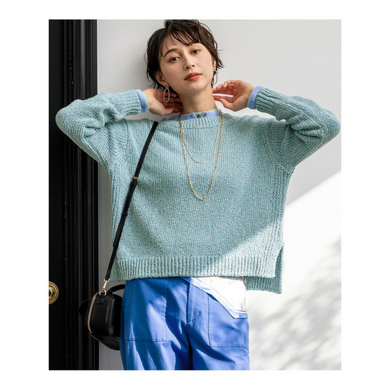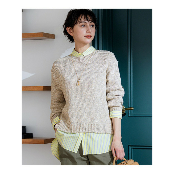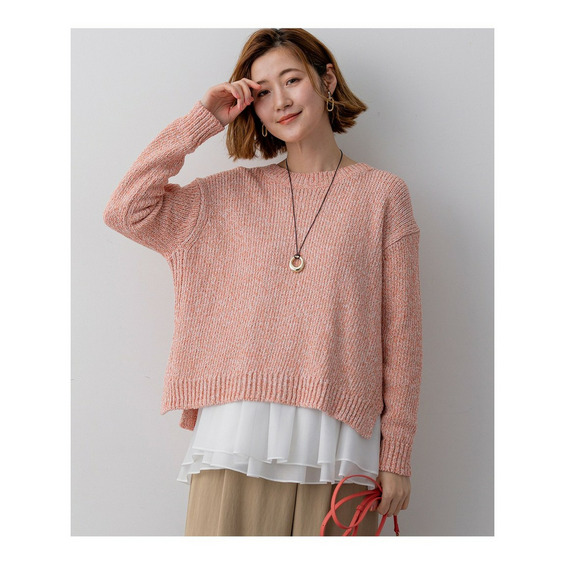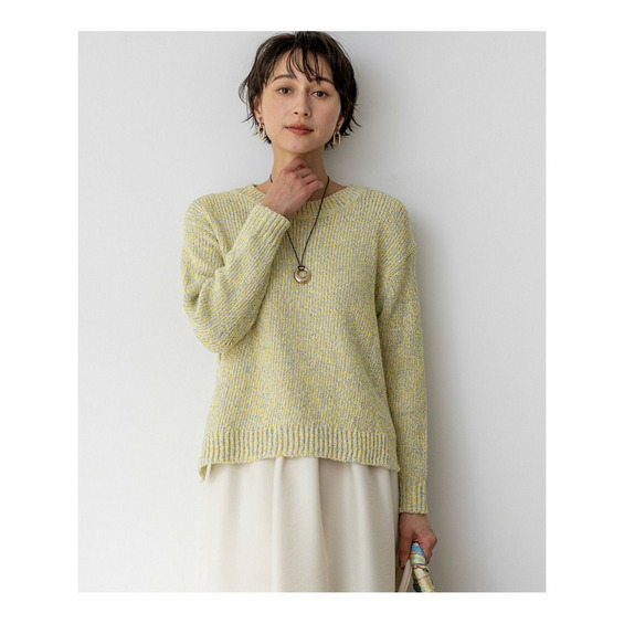 春らしい明るいミックスカラーが目を引く、イタリアインポートヤーンで編み立てたラウンドネックプルオーバーです。ややワイドなシルエットとクロップド丈が特徴で、ワイドパンツやスカートと合わせるだけで、バランスの取れた洗練された着こなしが完成します。サイドにはやや深めのスリットが入っており、インナーにシャツやTシャツなどを重ね着するレイヤードスタイルもおすすめです。コットンの柔らかな風合いと軽やかなカラーリングが、着る人の気分まで華やかに彩り、コーディネートに存在感をプラスします。休日のカジュアルスタイルや、友人とのランチなど、幅広いシーンで活躍する一枚です。カラーは、砂浜のような温かみのあるサンドミックス(#533)、明るく陽気な印象のイエローミックス(#542)、柔らかなオレンジがかったピンク系が魅力のアプリコットミックス(#512)、空のように爽やかなサックスミックス(#572)の4色展開です。