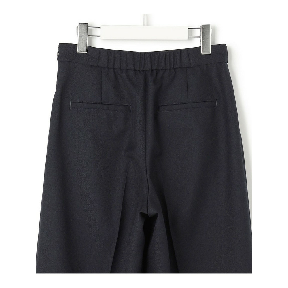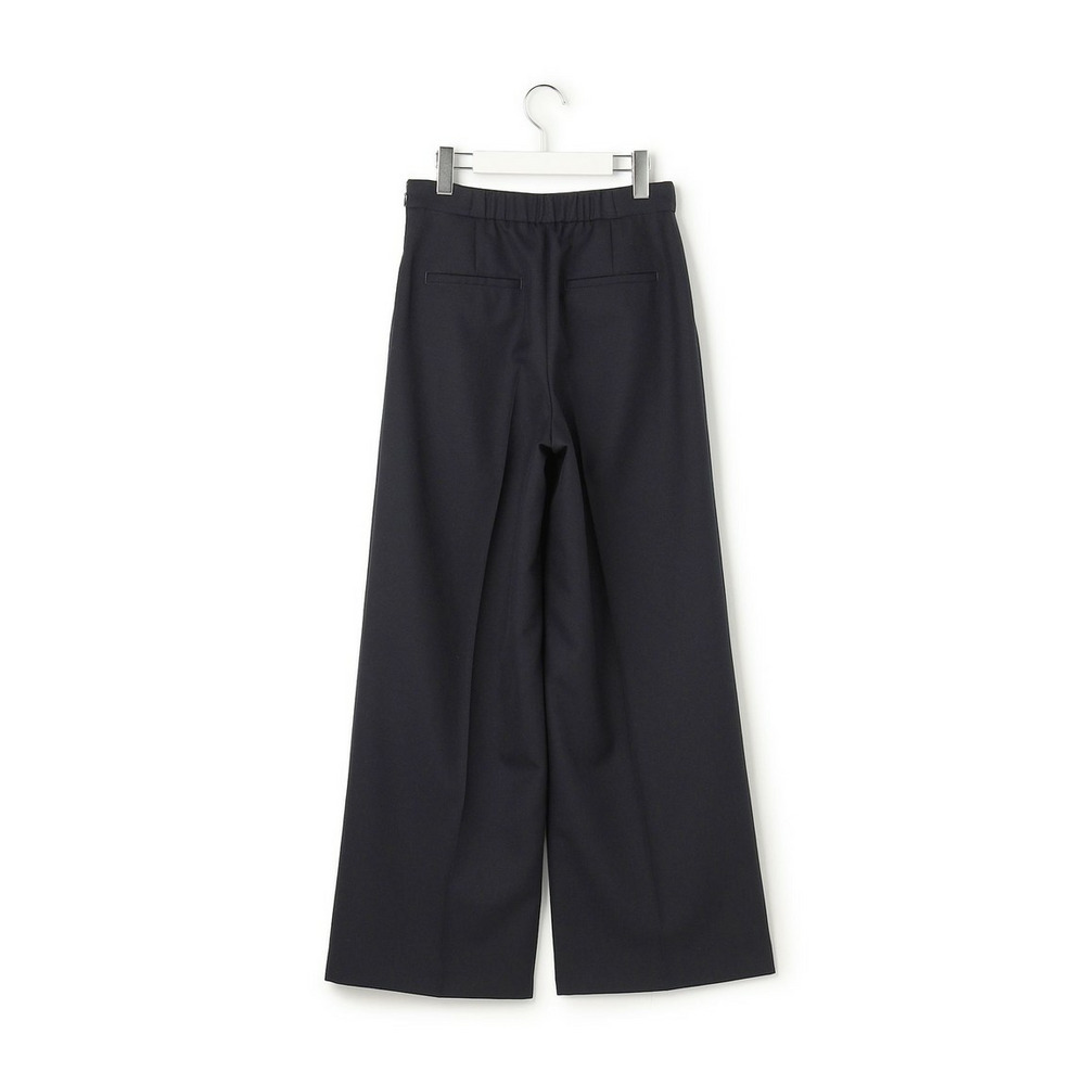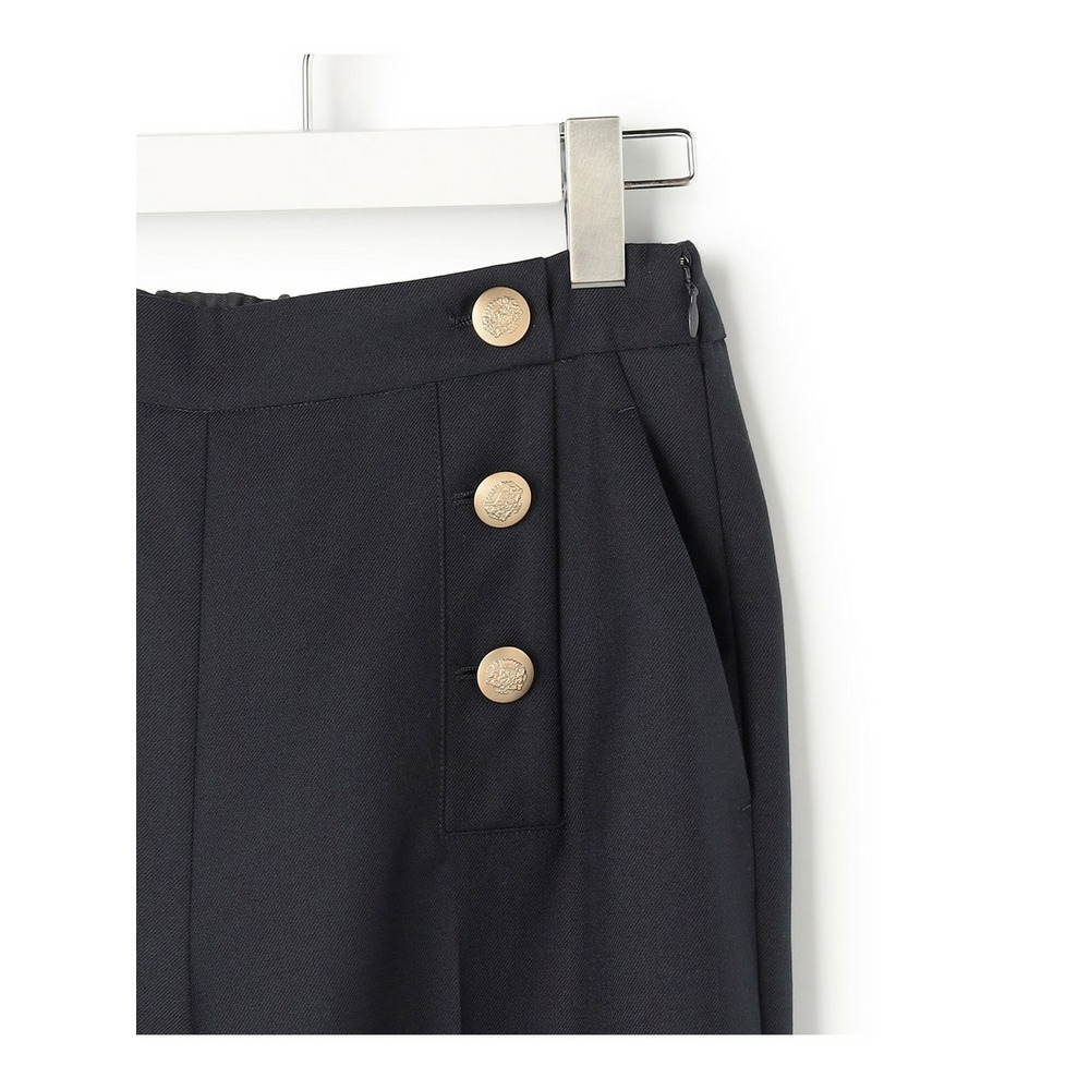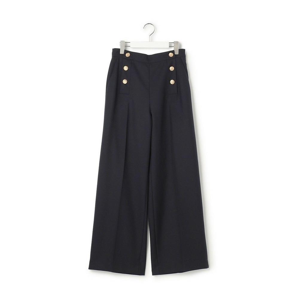 フロントに配されたゴールドボタンがアクセントになった、マニッシュな雰囲気漂うマリンテイストなパンツです。センタープレスが施されたワイドシルエットは、すっきりとスマートな印象。サイドファスナー仕様で着脱しやすく、ウエスト後ろはゴムギャザーでストレスフリーな穿き心地を実現しました。ニットカーディガンと合わせた上品な着こなしはもちろん、ブラウスでオフィスシーンに、Tシャツでカジュアルにと幅広いスタイリングをお楽しみいただけます。 カラーは、深みのある上品なネイビー(#075)と、洗練された印象を与える明るいライトグレー(#003)の2色展開です。