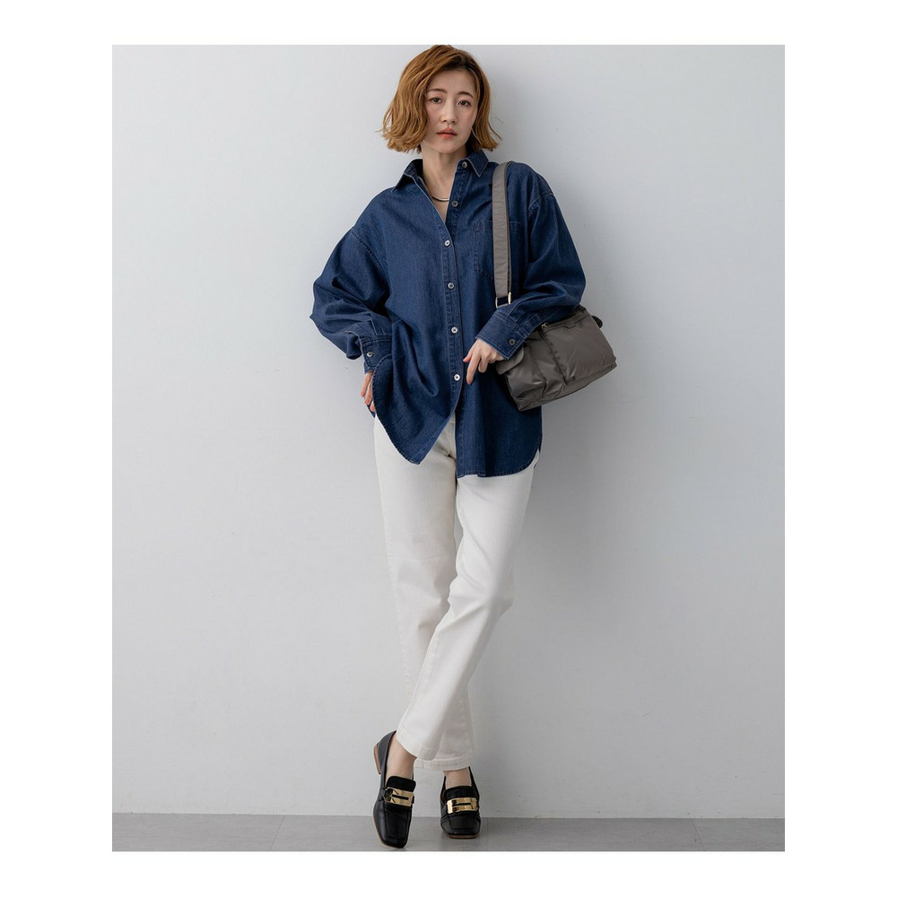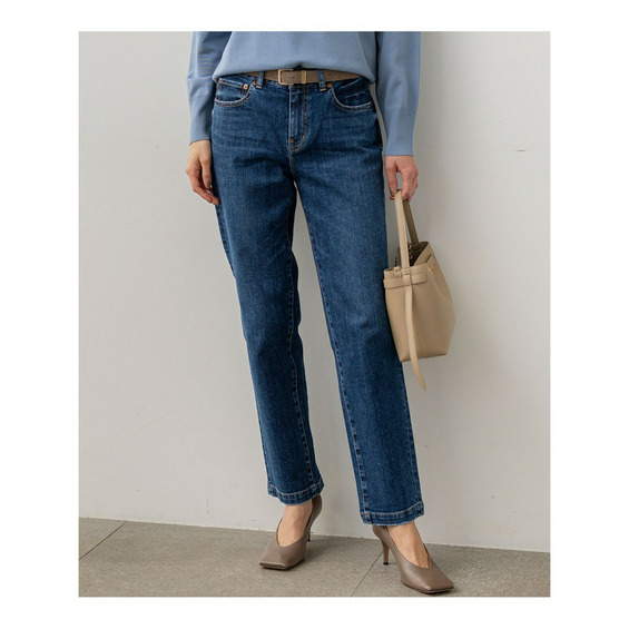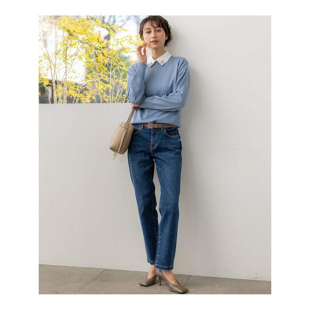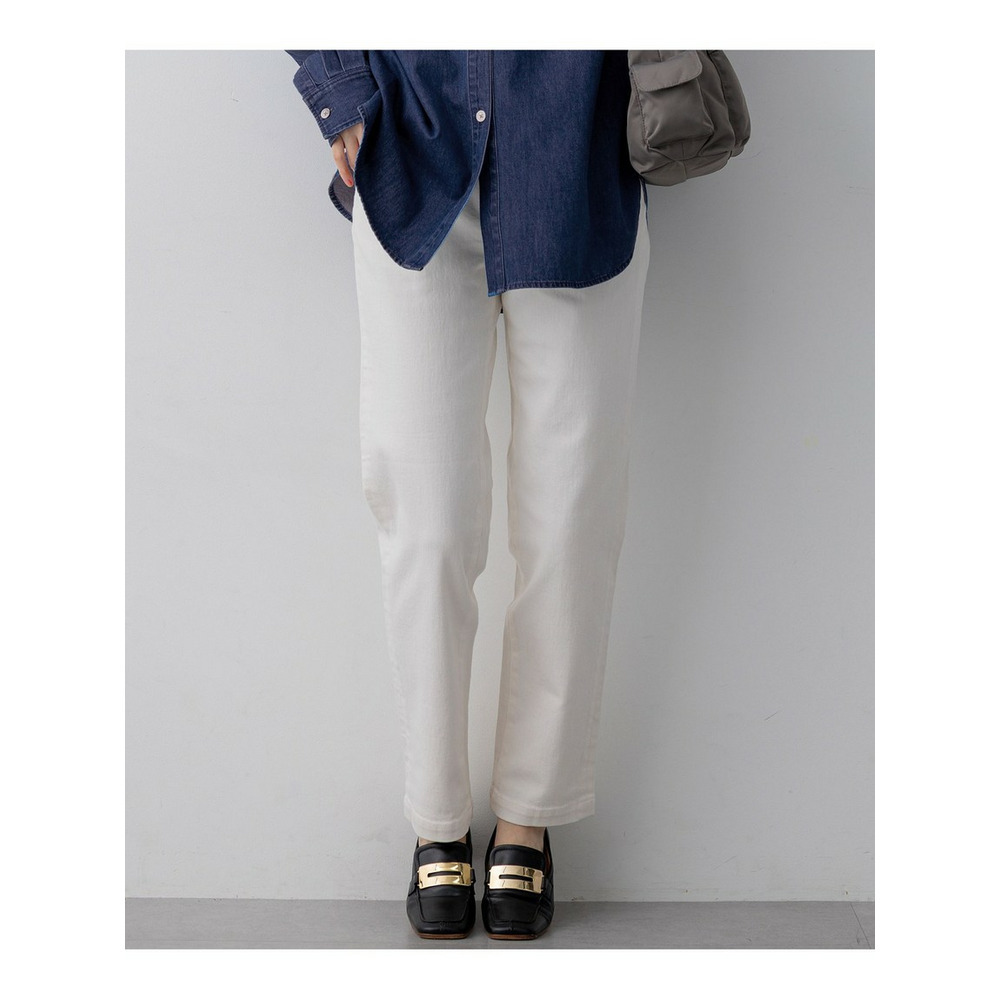 ひざから下のラインがすっきりとしたデザインが特徴の、デニムパンツです。少しゆとりをもたせた今っぽいシルエットになっています。カジュアルながらも上品さを兼ね備え、大人の女性にぴったりの一本です。ブラウスやジャケットと合わせてきれいめカジュアルに、Tシャツやニットと合わせてデイリーカジュアルにと、幅広いスタイリングに活躍します。 カラーは、クリーンで爽やかな印象のホワイト(001)、着回し力抜群のスカイブルー(072)、こなれた雰囲気を演出するウォッシュドブルー(074)、シックな印象を与えるネイビー(075)の4色展開です。