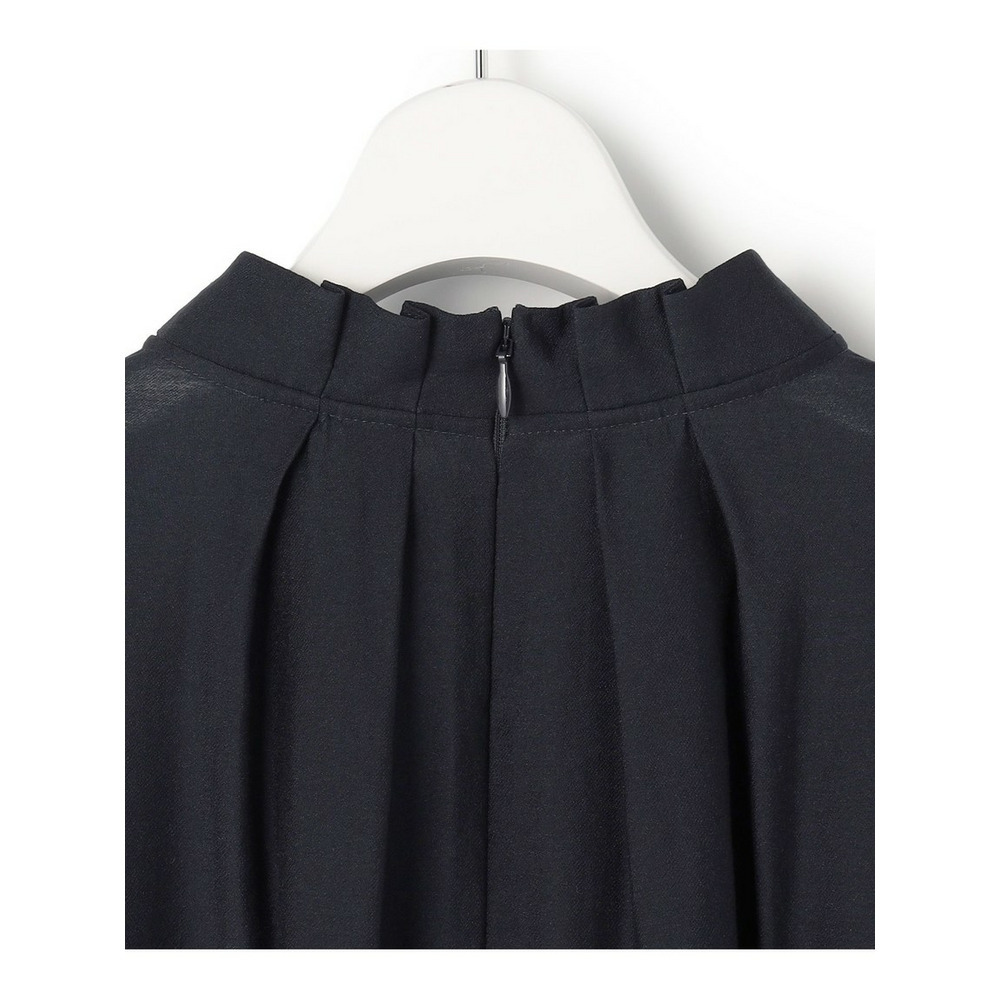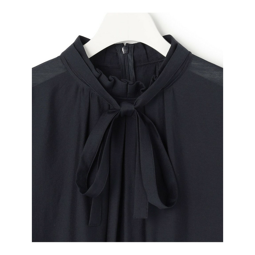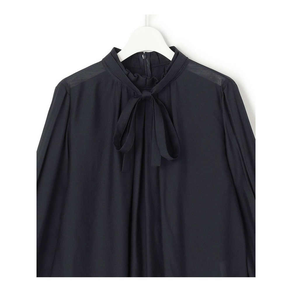 リボンを前後で結べる2WAY仕様が魅力のボウタイブラウスです。ボウタイは前でリボン結びにして華やかな印象に、またはラフに垂らしてこなれ感を演出するなど、気分に合わせてアレンジをお楽しみいただけます。さらに、後ろで結べばすっきりとしたハイネックブラウスのような着こなしも叶い、一枚で何通りもの表情を見せてくれます。 程よいシアー感が女性らしさを引き立て、上品な光沢感のある素材が着こなしに奥行きを与えます。トップスインでもアウトでも様になり、ジャケットやカーディガンはもちろん、ニットやスウェットと重ねてレイヤードスタイルを楽しむのもおすすめです。 オフィスシーンでのきちんと感から、お食事会やお出かけなどの華やかなシーンまで、幅広い場面で活躍し、洗練された大人の女性を演出します。カラーは、清潔感と上品さを兼ね備えたホワイト(#001)、知的で洗練された印象を与えるネイビー(#075)の2色展開です。