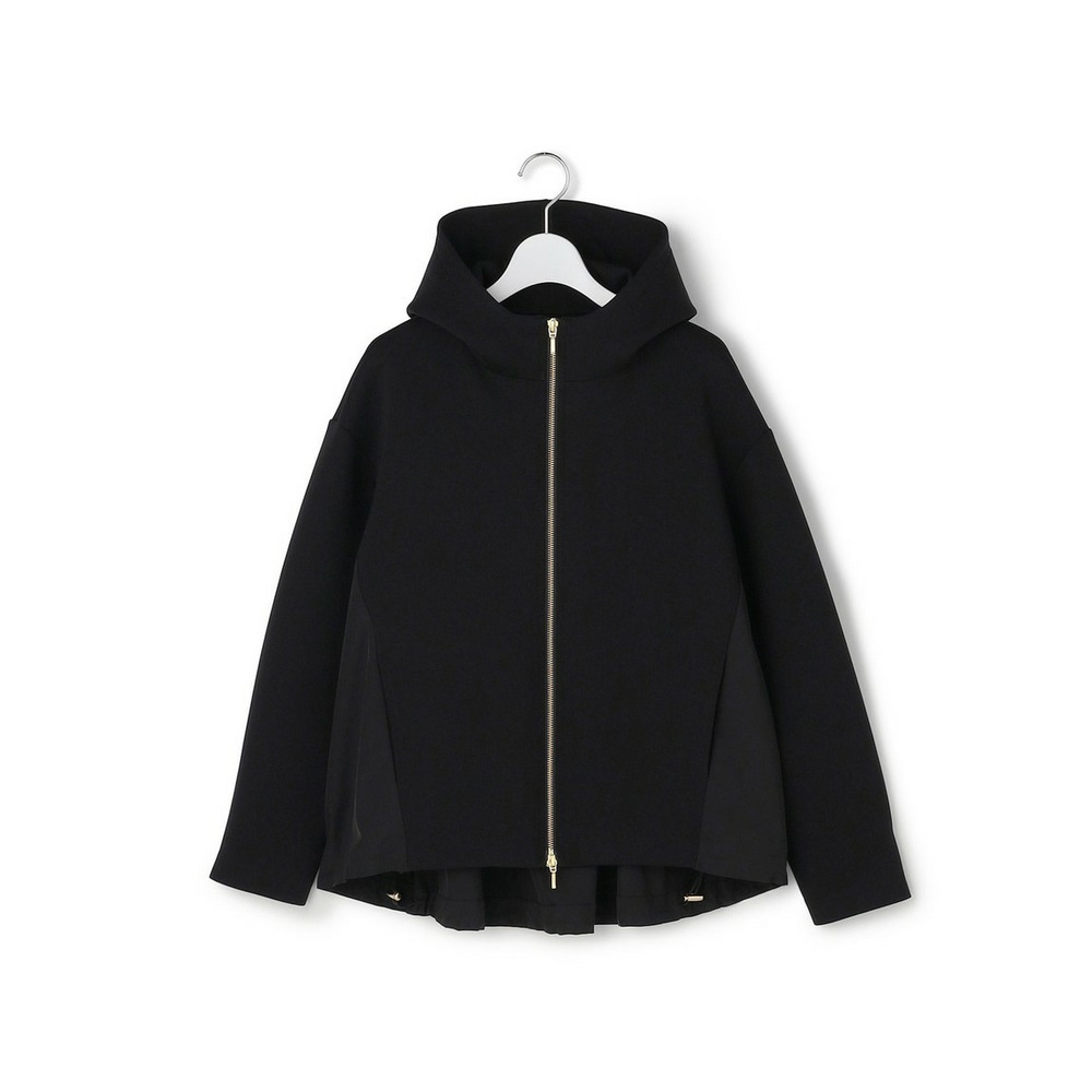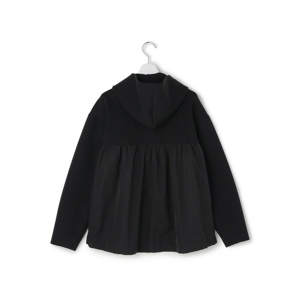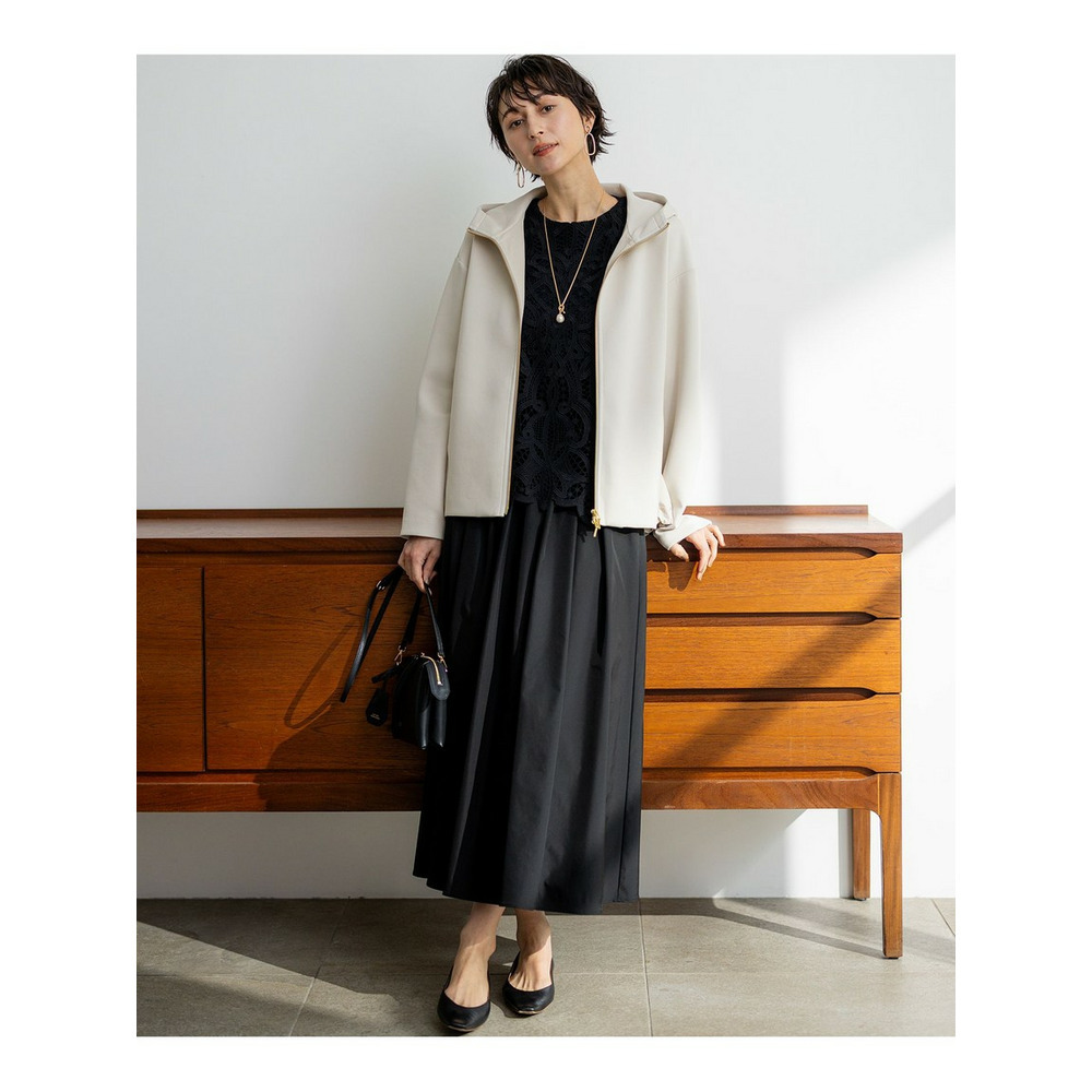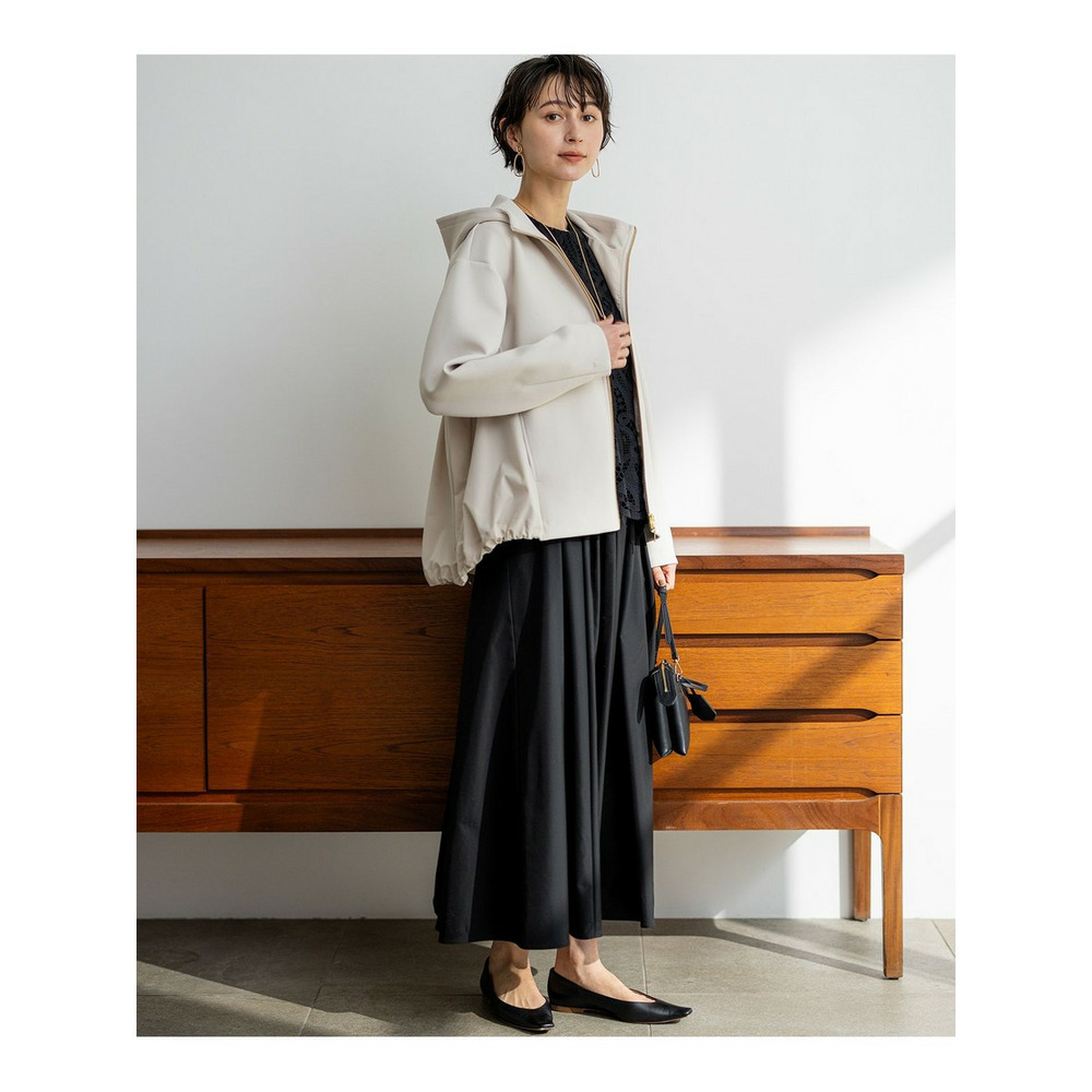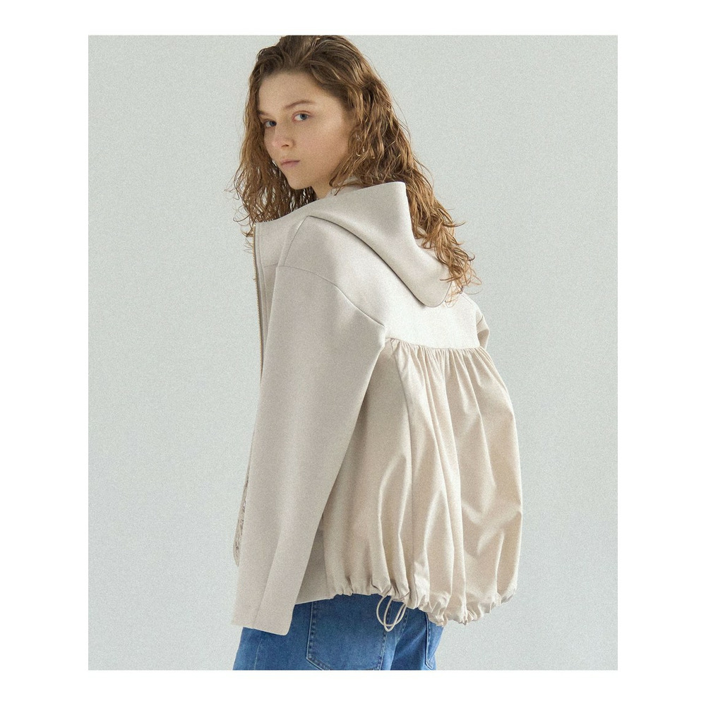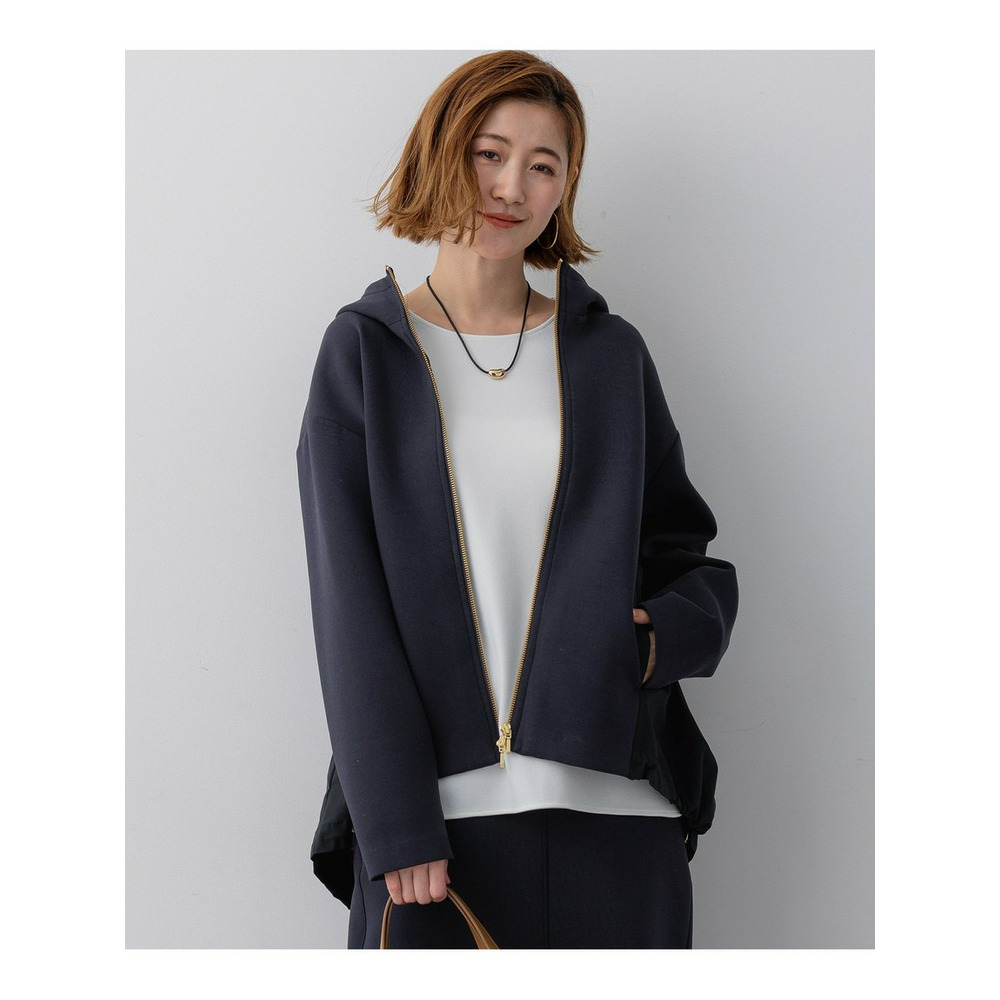 後ろのヨーク下から前のパネルまで、タフタ素材で切り替えた異素材コンビのライトアウターです。裾のゴムはドロスト仕様になっているので、ヒップまわりのシルエットの変化を楽しむことができます。バルーンシルエットにすることでニュアンス感がプラスされ、全体的に軽やかな印象に。フーディーはスタンド襟に仕上げているので暖かさもあり、絶妙なシルエットで程よいカジュアル感を与える万能アウターです。 カラーは、上品で落ち着いた印象のベージュ(033)、知的で洗練されたネイビー(075)、着回し力抜群でシックなブラック(005)の3色です。