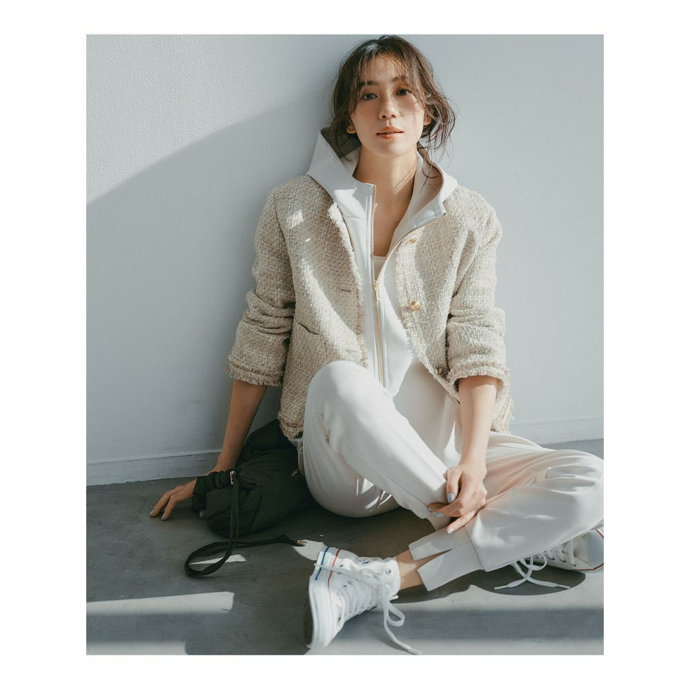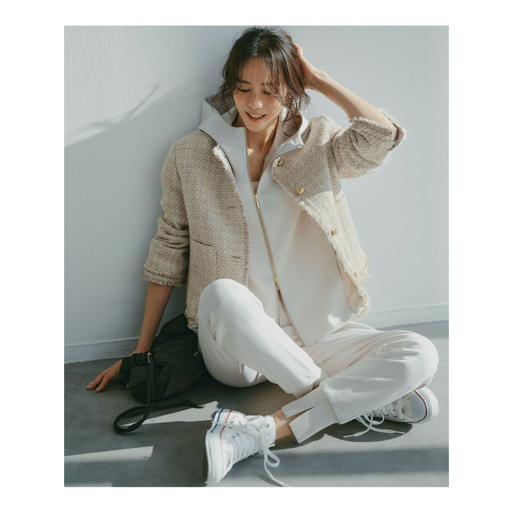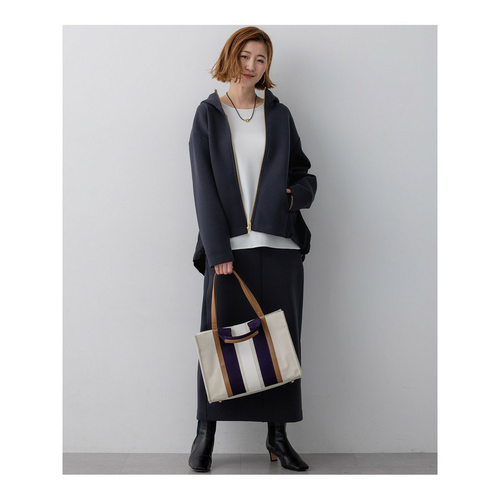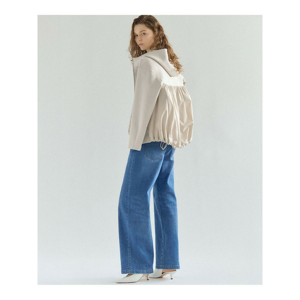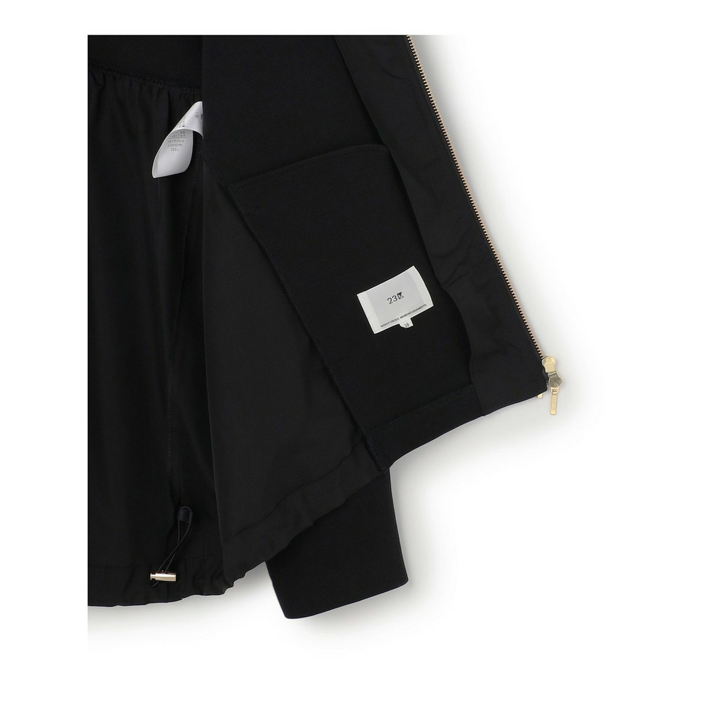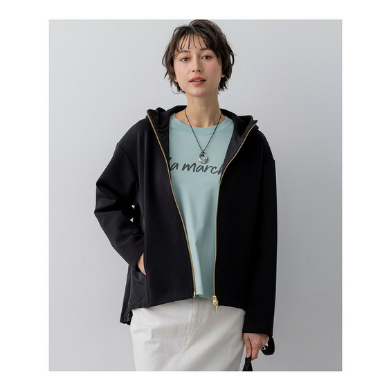 後ろのヨーク下から前のパネルまで、タフタ素材で切り替えた異素材コンビのライトアウターです。裾のゴムはドロスト仕様になっているので、ヒップまわりのシルエットの変化を楽しむことができます。バルーンシルエットにすることでニュアンス感がプラスされ、全体的に軽やかな印象に。フーディーはスタンド襟に仕上げているので暖かさもあり、絶妙なシルエットで程よいカジュアル感を与える万能アウターです。 カラーは、上品で落ち着いた印象のベージュ(033)、知的で洗練されたネイビー(075)、着回し力抜群でシックなブラック(005)の3色です。