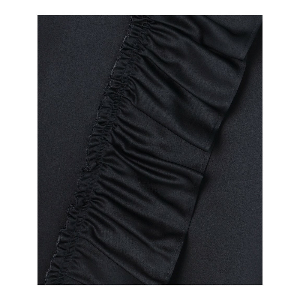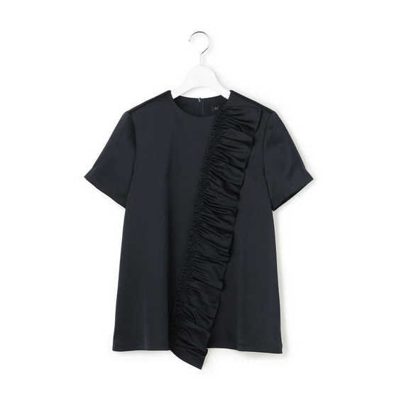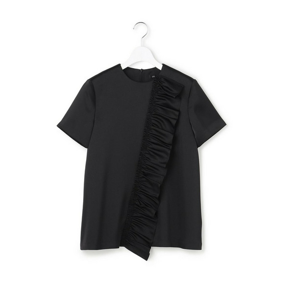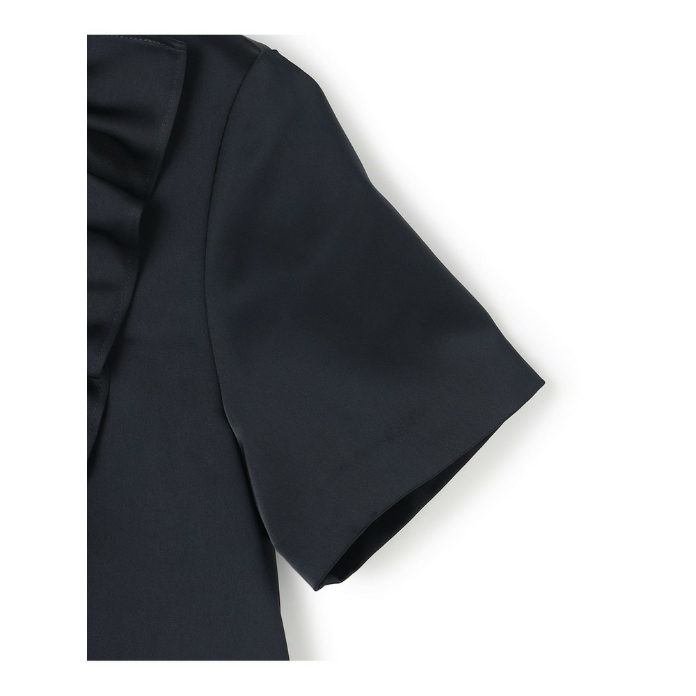 フロントのフリルデザインが印象的な半袖ブラウス。シンプルなデザインながら存在感のあるフリルディテールにより華やかさを加えたデザイン。ゆったりとしたシルエットで体型をカバーしながら、セレモニースタイルをモードな雰囲気に昇華してくれる1着です。同素材のパンツ(品番: PRAPGS0727)とあわせたり、お手持ちのボトムとの着回しもお楽しみいただけます。カラーはシックな雰囲気を醸し出すブラック(#005)と、華やかさの中にも品を感じさせる濃いめのネイビー(#075)の2色展開です。