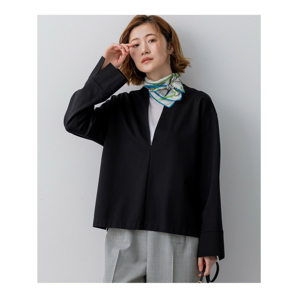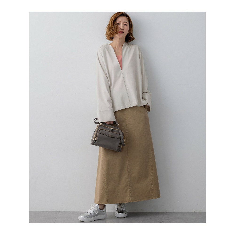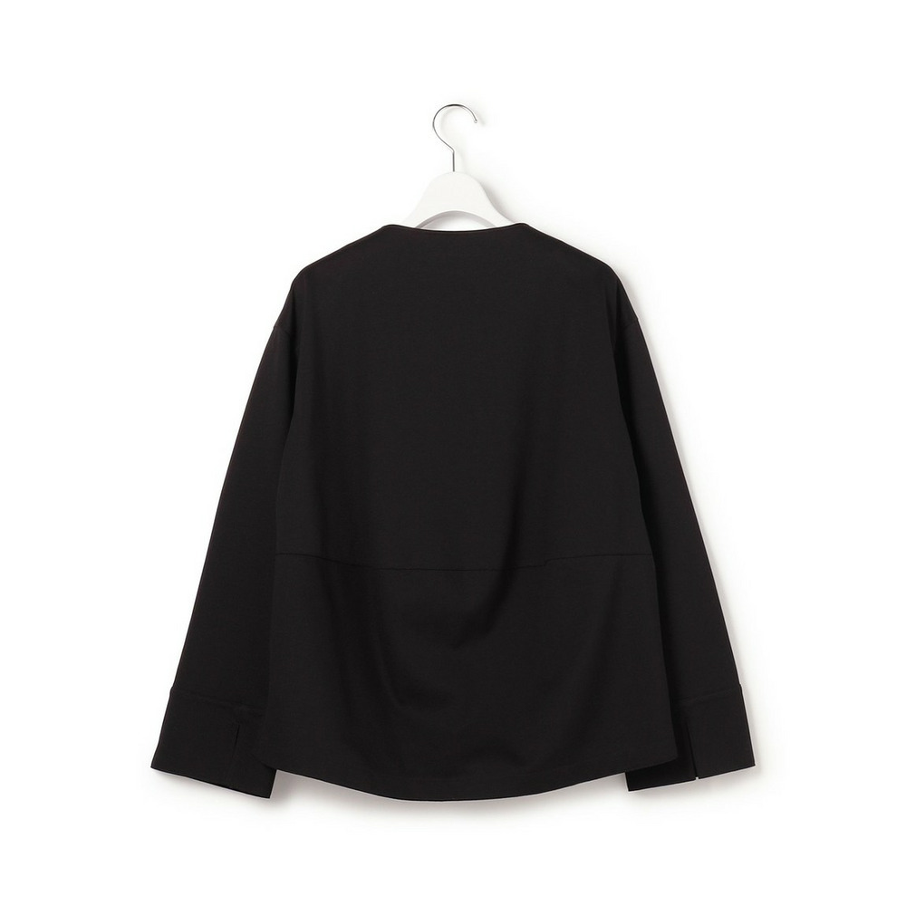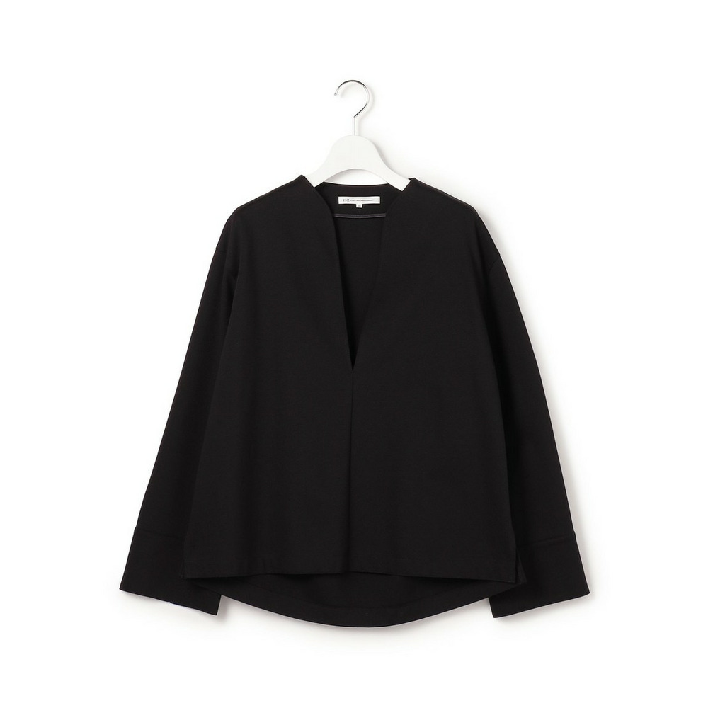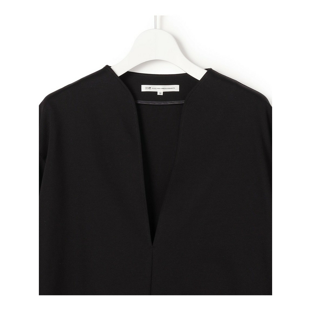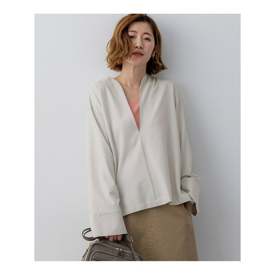 着回し力抜群なシンプルなカットソー。ネックラインに沿って深く開いたVネックは、まるでドレスのような美しいカッティング。デコルテをすっきりと見せ、女性らしいエレガントな印象を与えます。後ろの切り替えでふくらみを持たせたコクーンシルエットは、気になるヒップラインをさりげなくカバーし、体型を気にせず洗練された着こなしを叶えます。 TWギャバのマリンパンツやワイドパンツと合わせてモダンなカジュアルスタイルに。エアリーなスカートと合わせれば、フェミニンな装いも楽しめます。インナーにはシアーなタートルネックやクルーネックのロンT、ベアトップを重ねて表情を変えたり、スカーフをプラスして華やかさを添えたりと、様々なアレンジが可能です。オフィスシーンから休日のカジュアルまで、幅広いシーンで活躍する一枚です。 カラーは、シックに纏めるブラック(#005)と、上品でやわらかな雰囲気のベージュ(#033)の2色展開です。