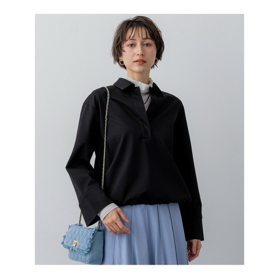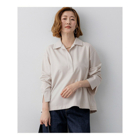 ゆったりとしたシルエットが特徴のスキッパートップスです。深めのVネックが顔周りをすっきりと見せ、抜け感を演出します。襟やカフスはしっかりとした仕立てで、マニッシュな印象をプラス。一方で、裾にはドロストが施されており、キュッと絞れば丸みのあるシルエットに、そのまま着ればリラックス感のある着こなしにと、気分やコーディネートに合わせてシルエットのアレンジが楽しめます。カットソー素材でありながら、布帛のような上品な表情を持ち、シワを気にせず快適にお召しいただけます。 一枚で着るのはもちろん、シアーなタートルネックやフェミニンなレースインナーを重ね着すれば、より洗練された印象に。オフィスシーンから休日のカジュアルスタイルまで、幅広いシーンで活躍する大人なシルエットトップスです。 カラーは、着回し力抜群でシックな印象のブラック(#005)と、上品で柔らかな雰囲気を醸し出すベージュ(#033)の2色展開です。