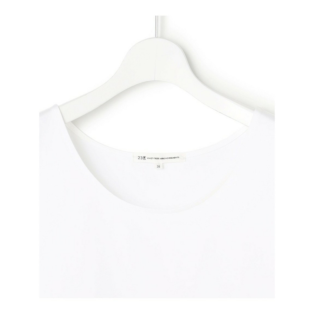 本体には、超長綿を使用したしなやかなコットン糸に、ストレッチ性のある糸を編み込んだ素材を採用しています。肌触りはソフトで着心地が良く、毛羽立ちが少なくクリアな表面感が上品な印象を与えます。裾のペプラム部分には、程よいハリ感と透け感が美しいポリエステル平織りのシアー素材を使用。洗ってもシワになりにくく、お手入れが簡単なイージーケア素材なのも嬉しいポイントです。異なる素材の組み合わせが、デザインに奥行きを与え、快適な着心地と上品さを両立させています。