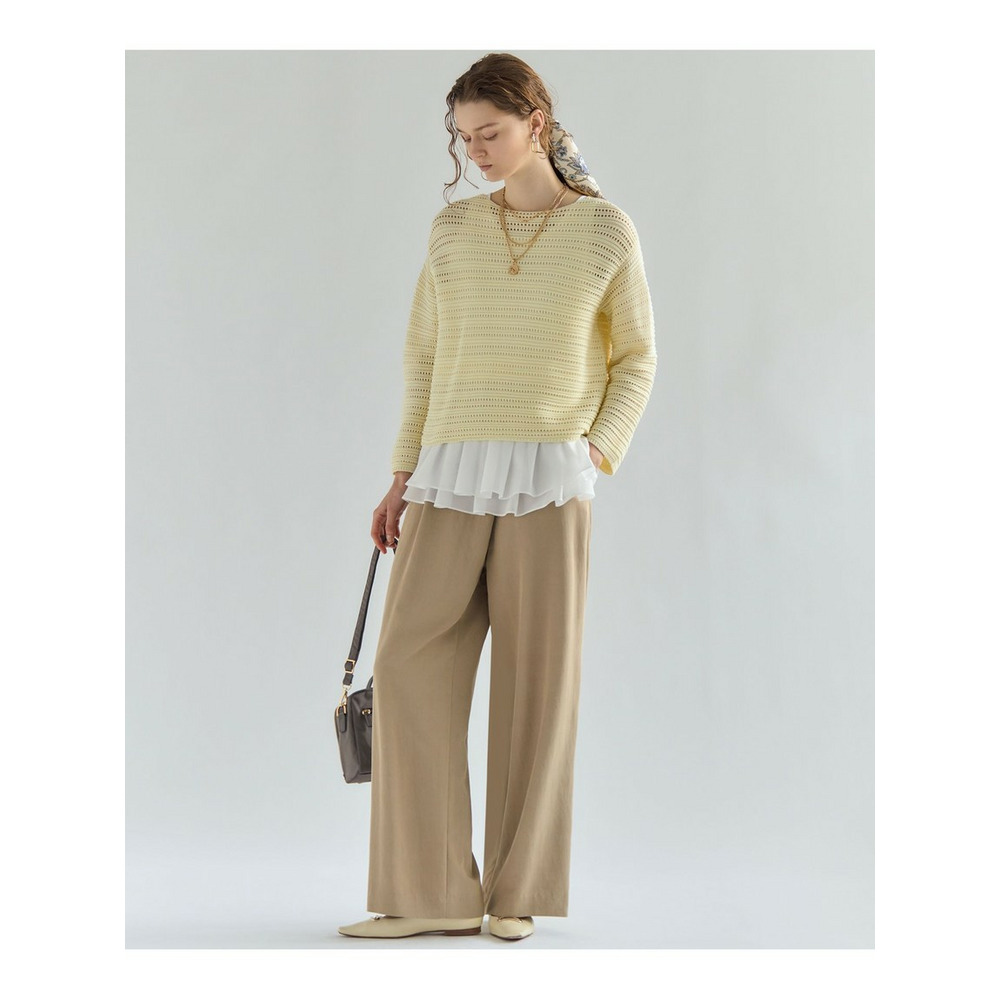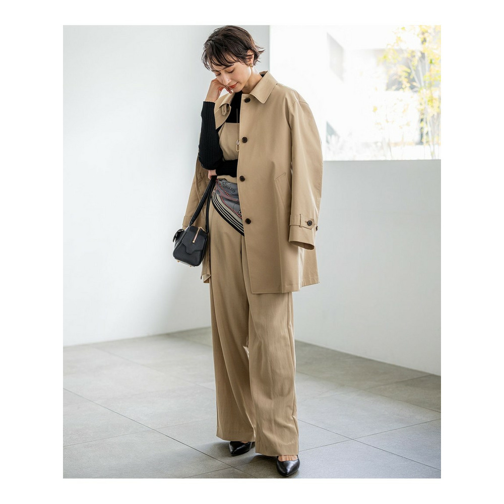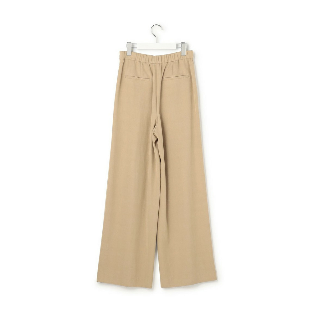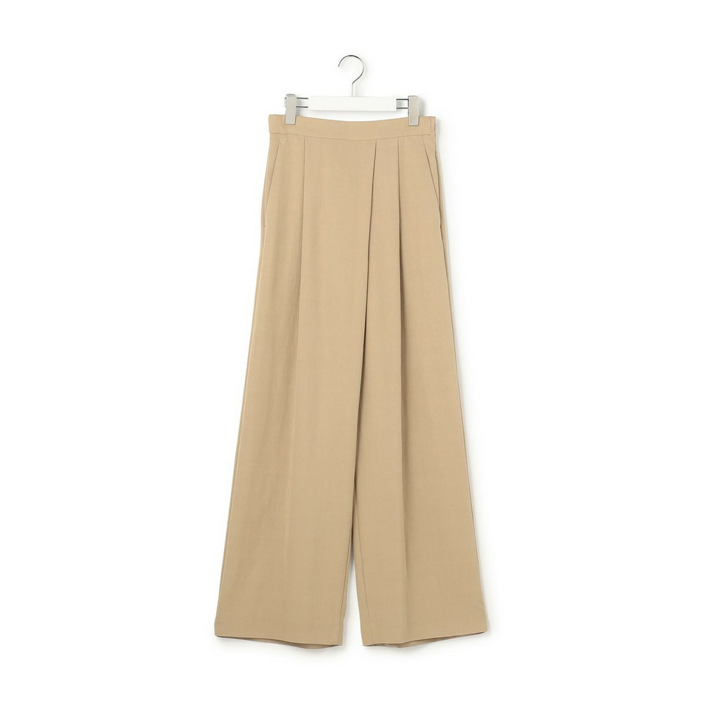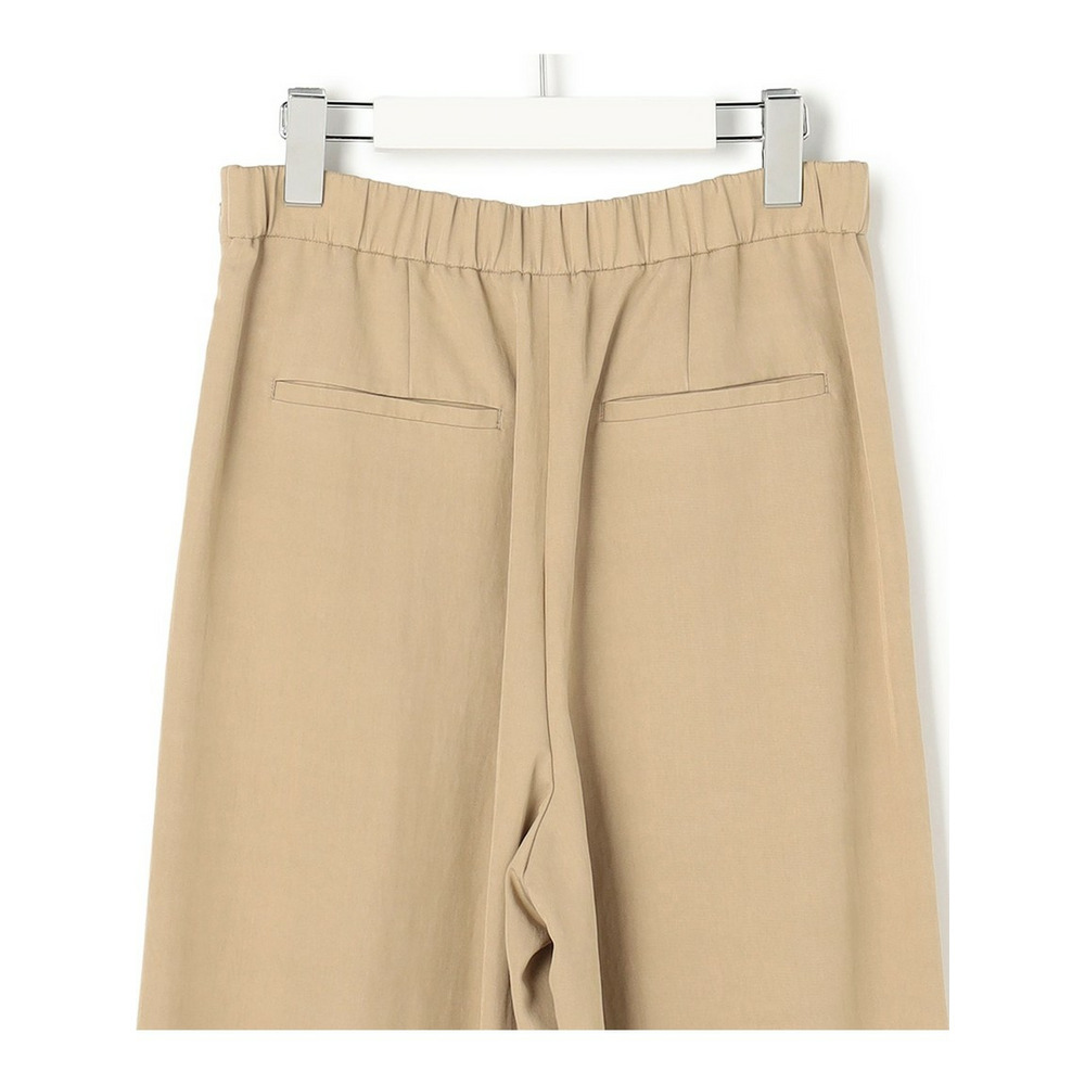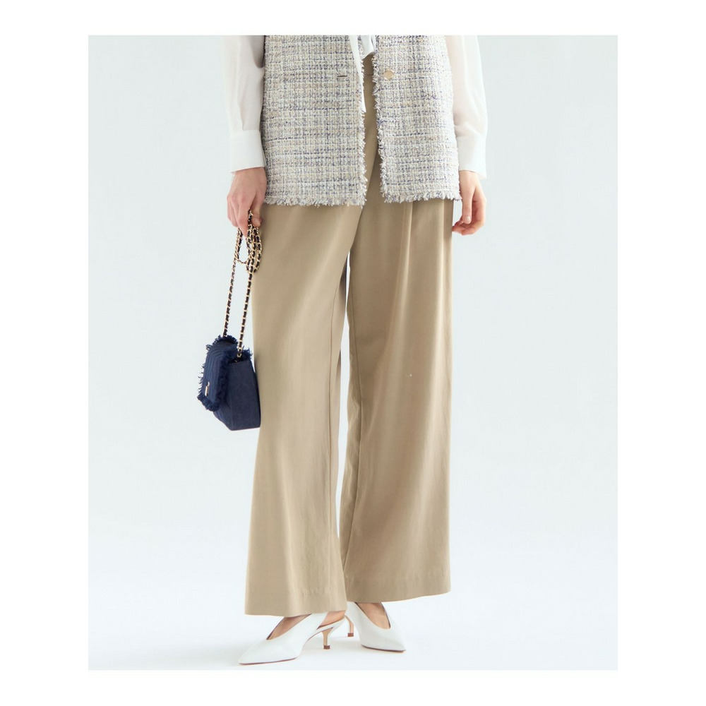 ラップ風ディテールとアシンメトリーなタックドレープが特徴で、一枚で着こなしに奥行きを与えるワイドパンツです。後ろウエストはベルト部分のみゴム仕様。快適な穿き心地ながらも、きちんと感を損ないません。シンプルなトップスと合わせるだけで洗練されたスタイリングが完成し、トップスをインしてウエストデザインを際立たせるのもおすすめです。ツイードのジャケットやベストと合わせれば、より上品でこなれた印象に仕上がります。オフィスシーンから休日のカジュアルスタイルまで、幅広いシーンで活躍する一枚です。カラーは、優しく上品な印象のベージュ(033)と、都会的で洗練された雰囲気のグレー(004)の2色展開です。